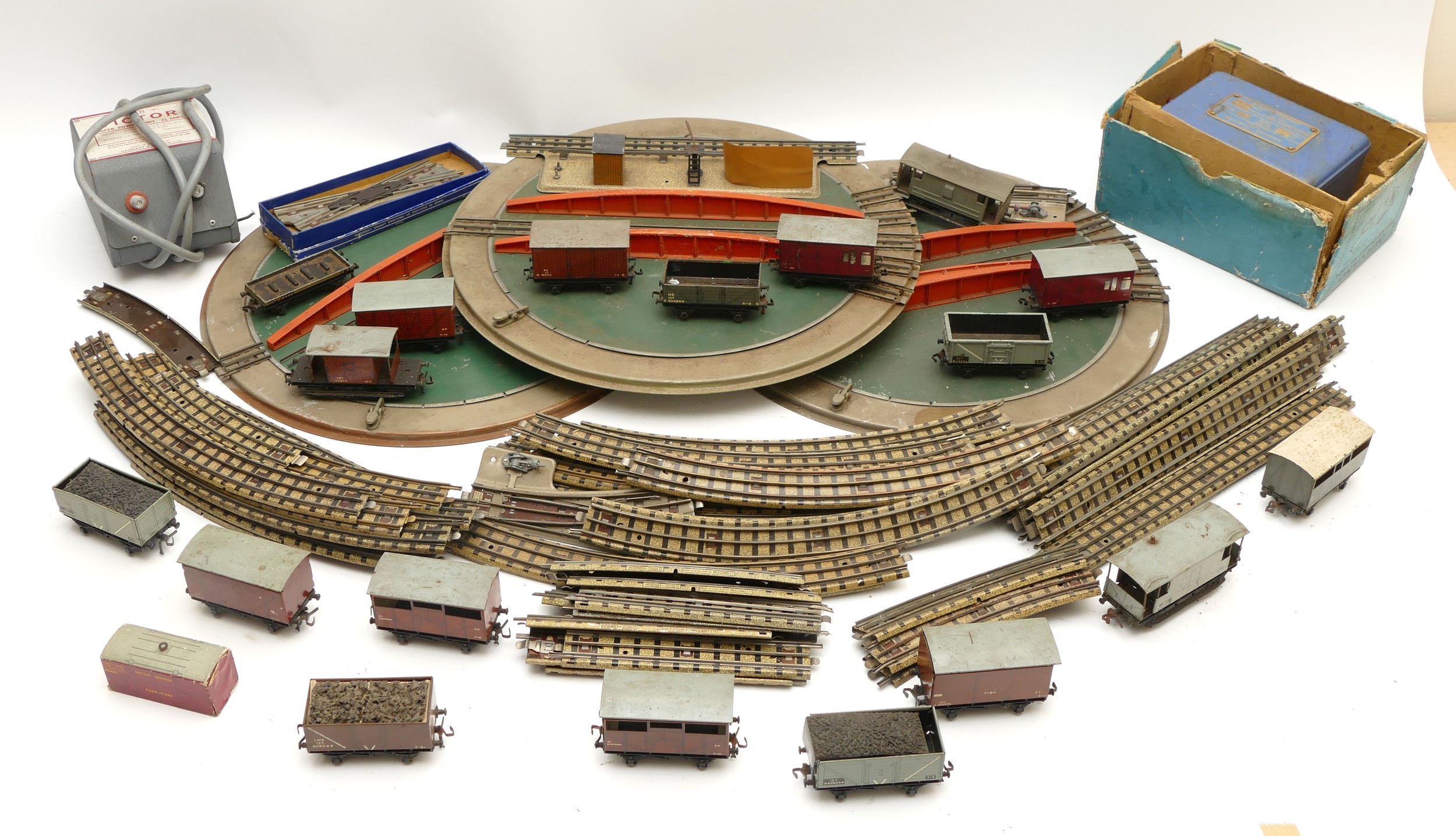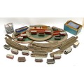 Hornby Dublo 00 gauge model railways; a collection of model railway accessories, to include, a large quantity of track, various rolling stock, several turntables, and a Meccano transformer / controller.