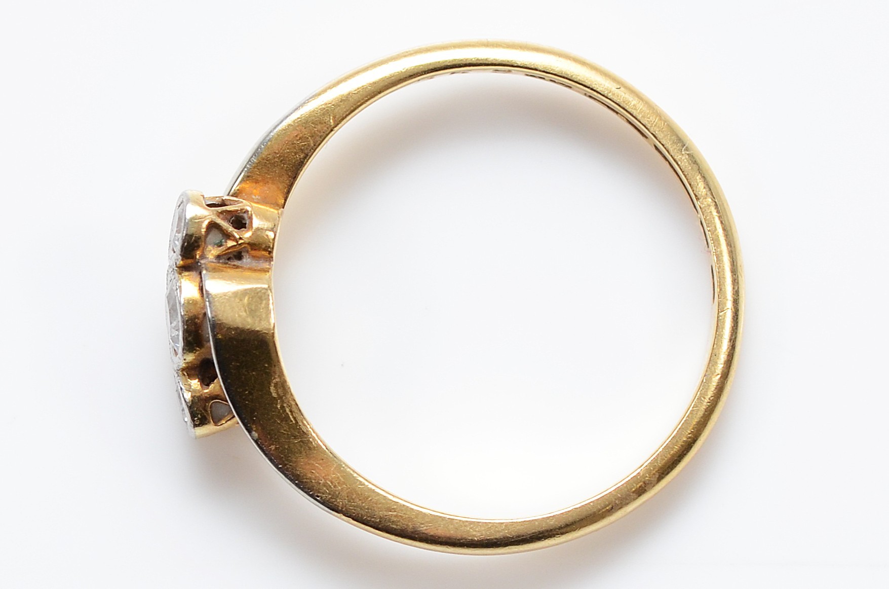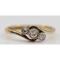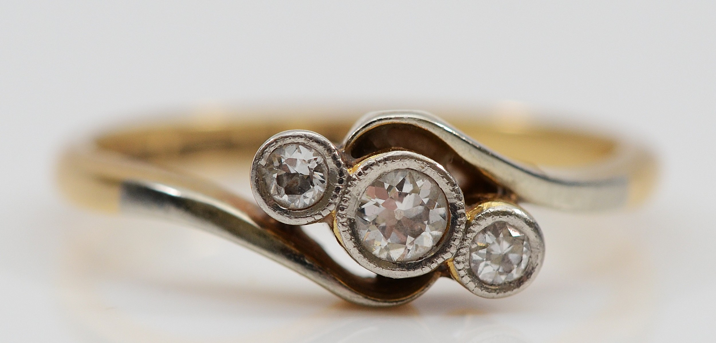 An 18ct and platinum brilliant cut diamond three stone cross over ring, M, 2.6g