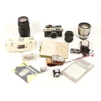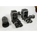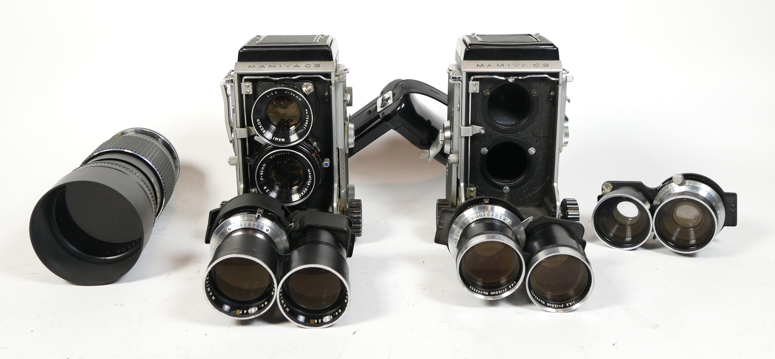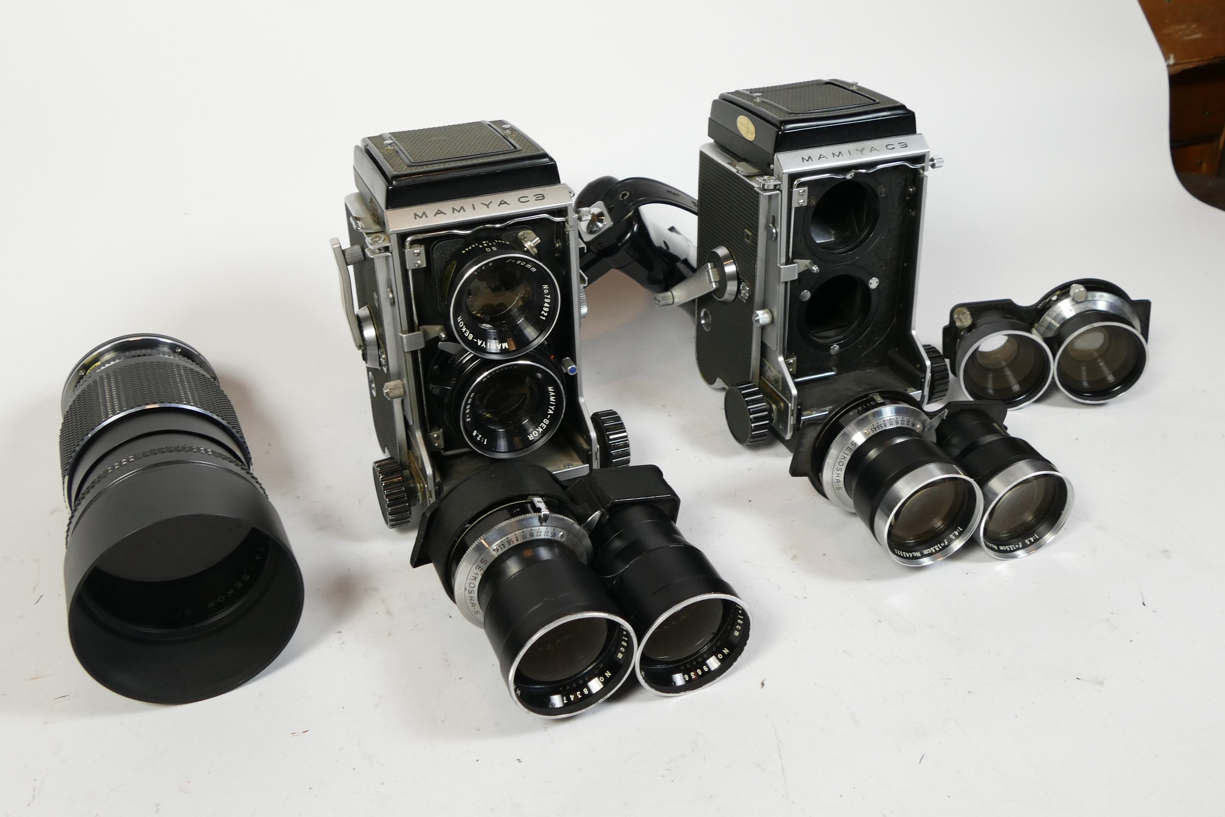 Mamiya TLR Cameras and Equipment, including Two Mamiya C3 bodies, a pair of 80mm f/2.8 Sekor lenses, a pair of 6.5cm lenses, a pair of 13.5cm lenses, a pair of 18cm lenses, also a Mamiya M645 145mm f/4 Soft Focus Portrait lens with Canon EOS mount adaptor. Also two books relating to Mamiya and Medium Format photography
