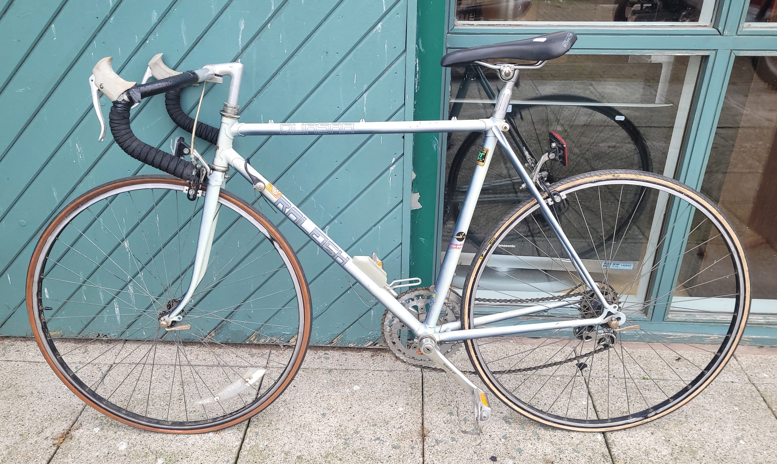 A Raleigh Quasar gents racing bicycle in silver with a Reynolds 501 butted frame.