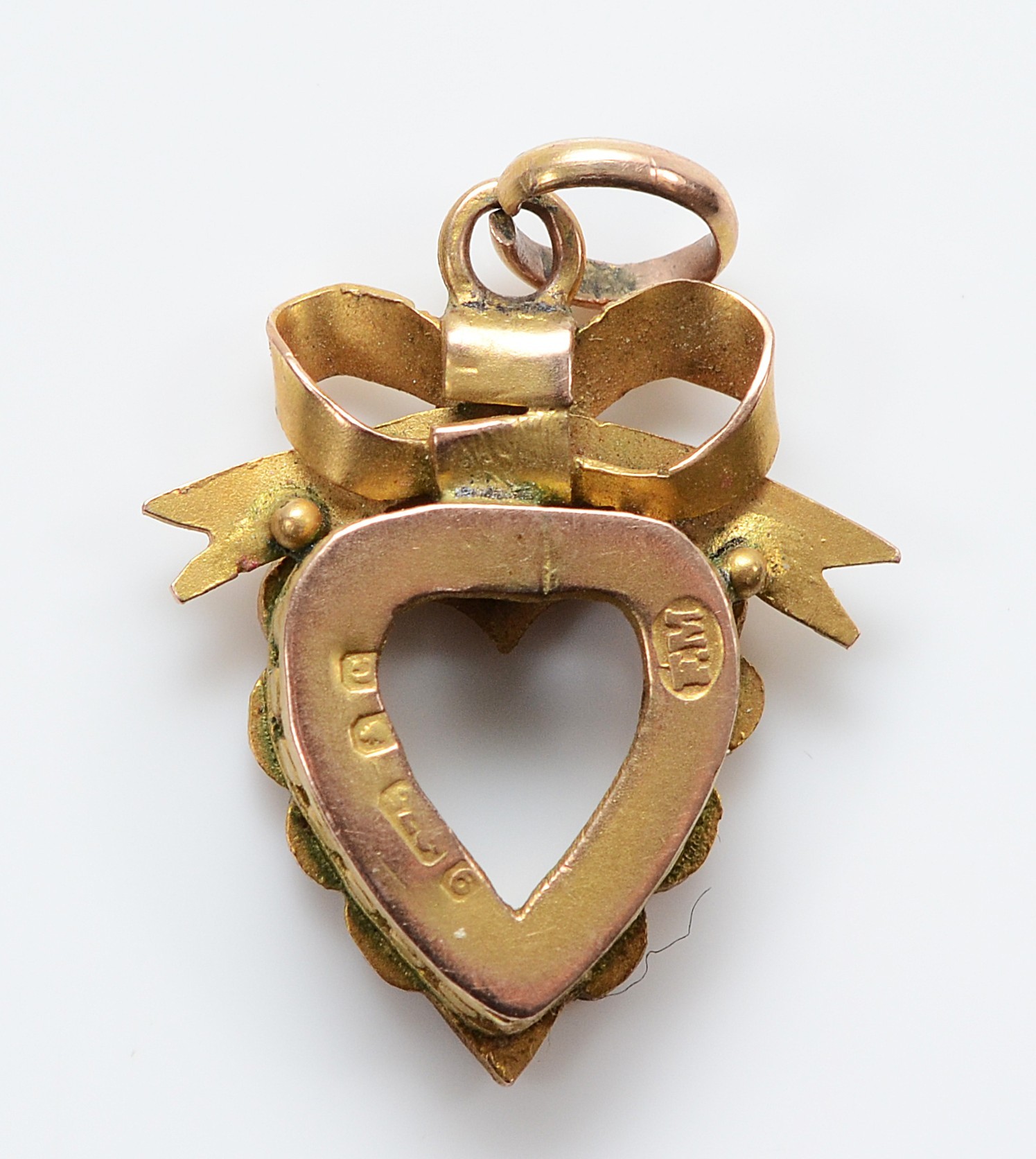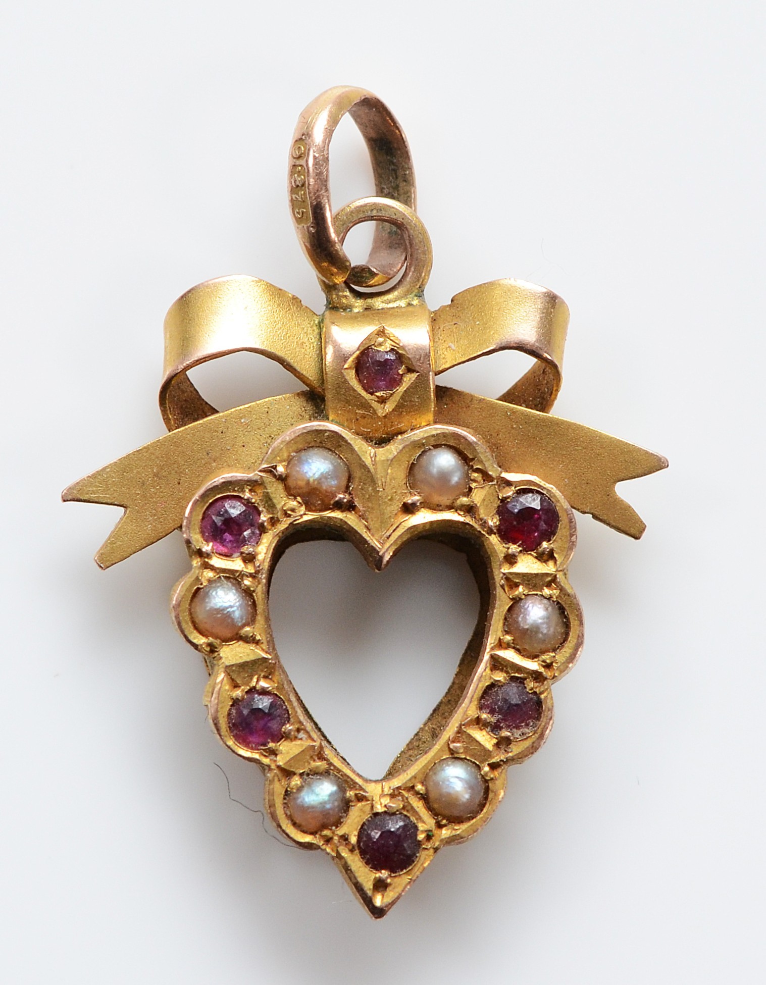 A 9ct gold ruby and seed pearl heart pendant, 20mm, 1.5g