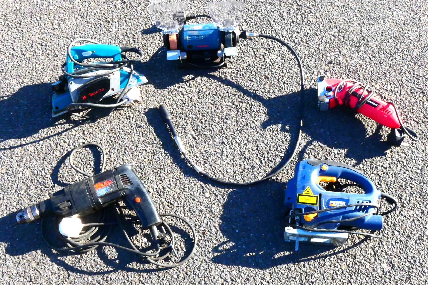 A collection of power tools to include a Power Craft 7320 240v 750w jigsaw, an AEG SB2-16N 240v 600w drill, a Makita 1923BD 240v 550w wood planer, a Ferrex PGB75G1 230v 120w bench polisher and a Hyundai 240v 400w miniature saw. (5).