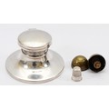A silver inkwell, Birmingham 1993, filled, 5.5cm, together with a silver thimble, Birmingham 1900, contained with a reel of cotton in a brass egg shaped container.