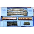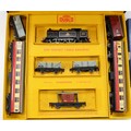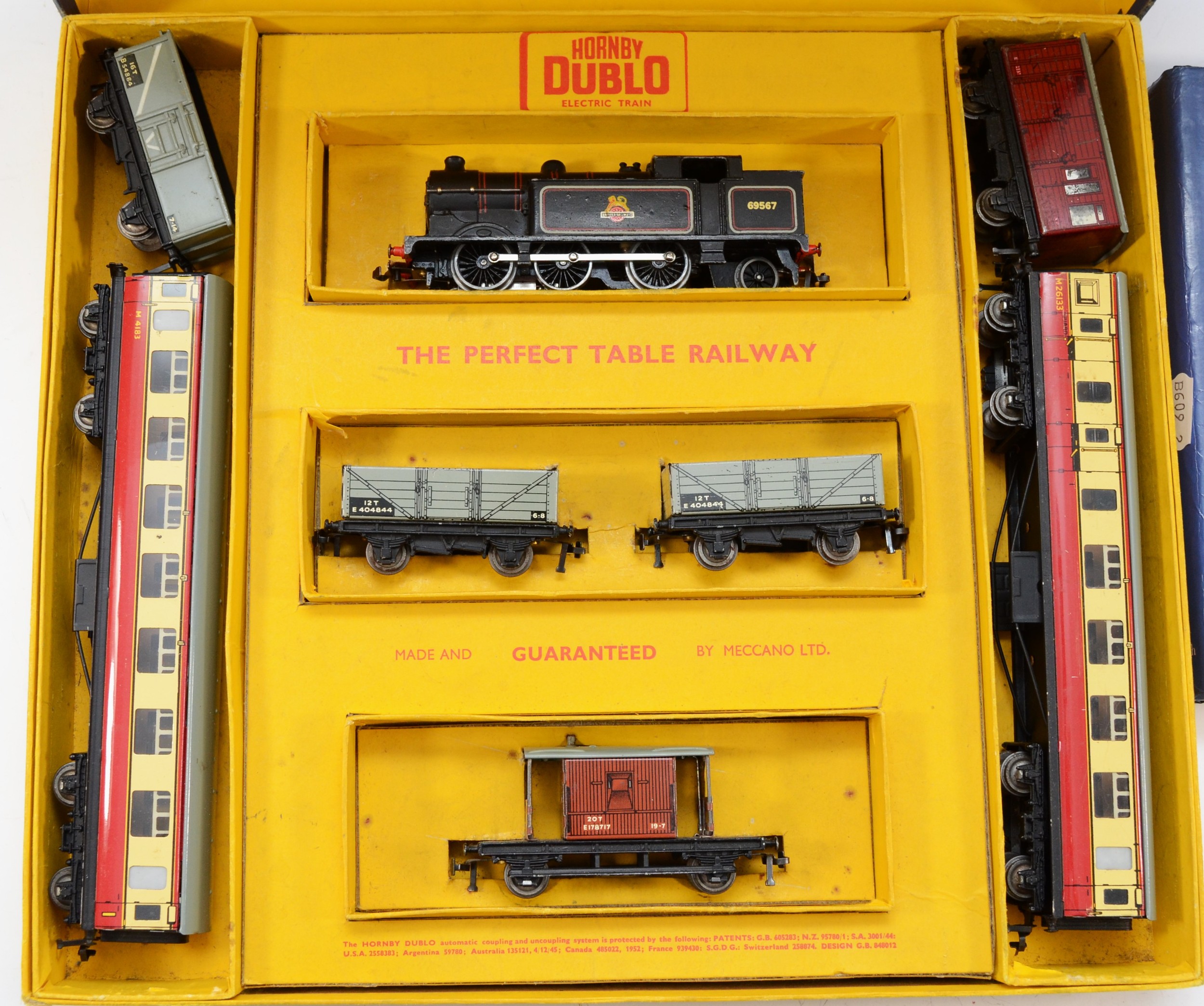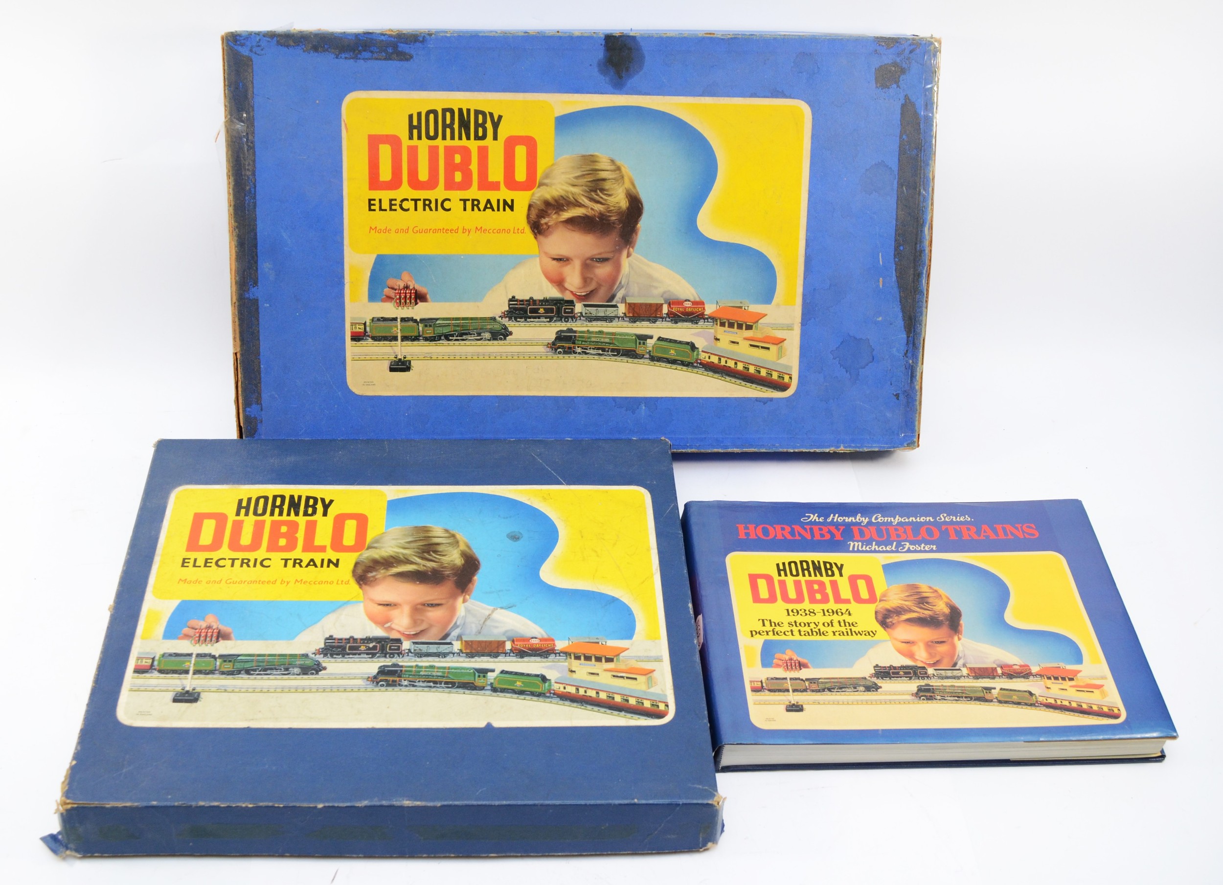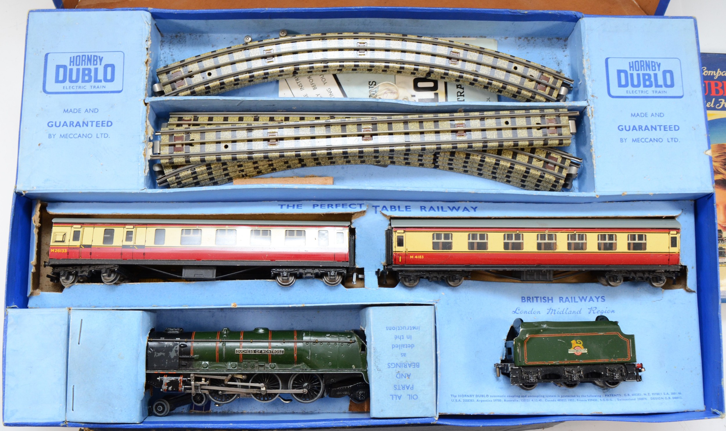 Hornby Railways; comprising Dublo train set B.R class 69567 engine, two carriages and five goods wagons, together with a Dublo train set EDP12 'Duchess Of Montrose' B.R (L.M.R) and a hardback book 'Hornby Dublo Trains' by Michael Foster. (3)