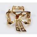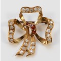 An unmarked gold, garnet and white gemstone ribbon brooch, 2...