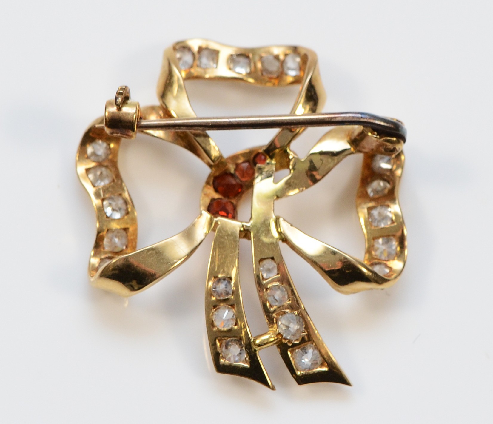 An unmarked gold, garnet and white gemstone ribbon brooch, 27mm, 4g