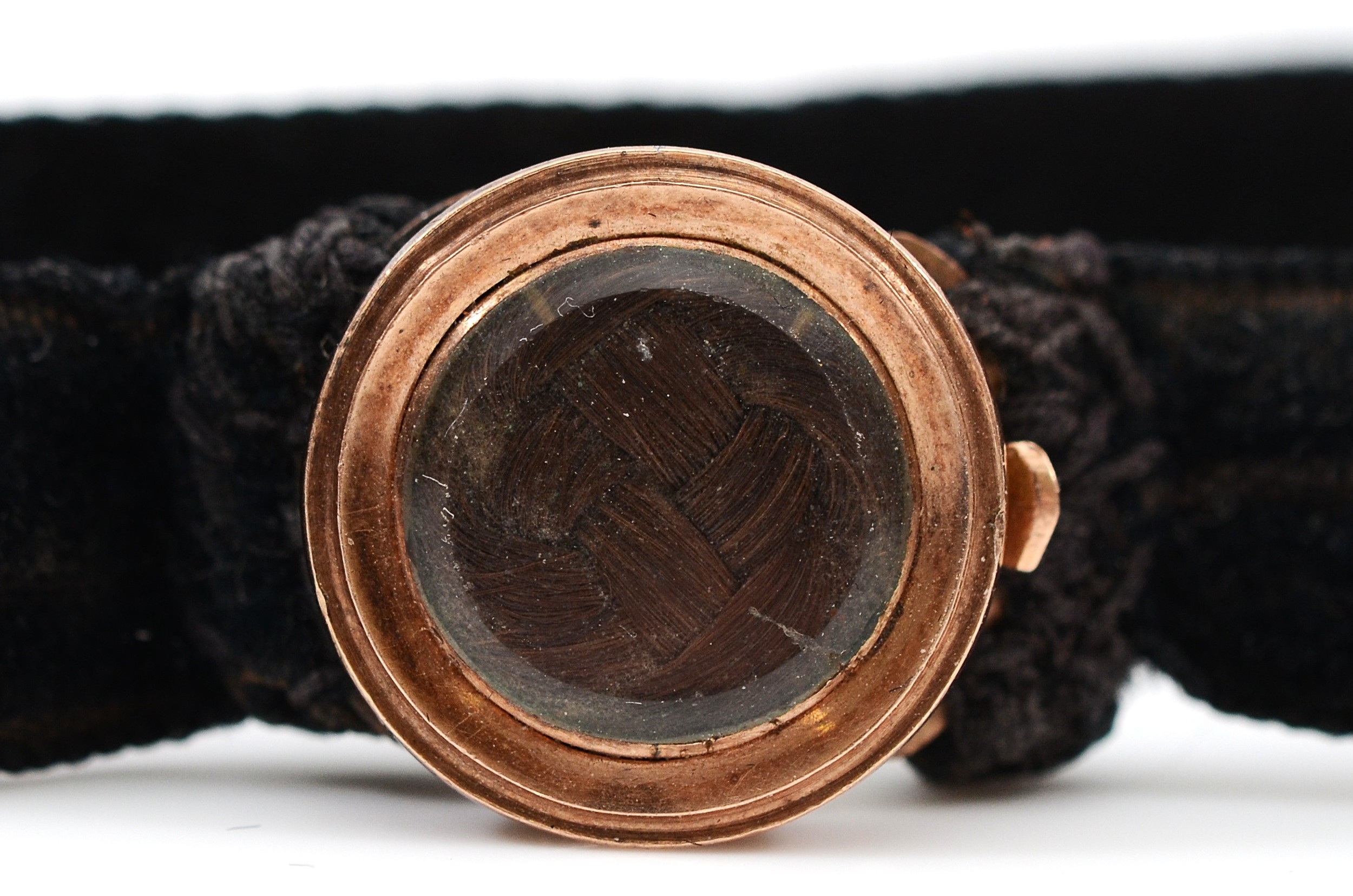 An unmarked 9ct rose gold hair work clasped velvet necklace,...