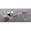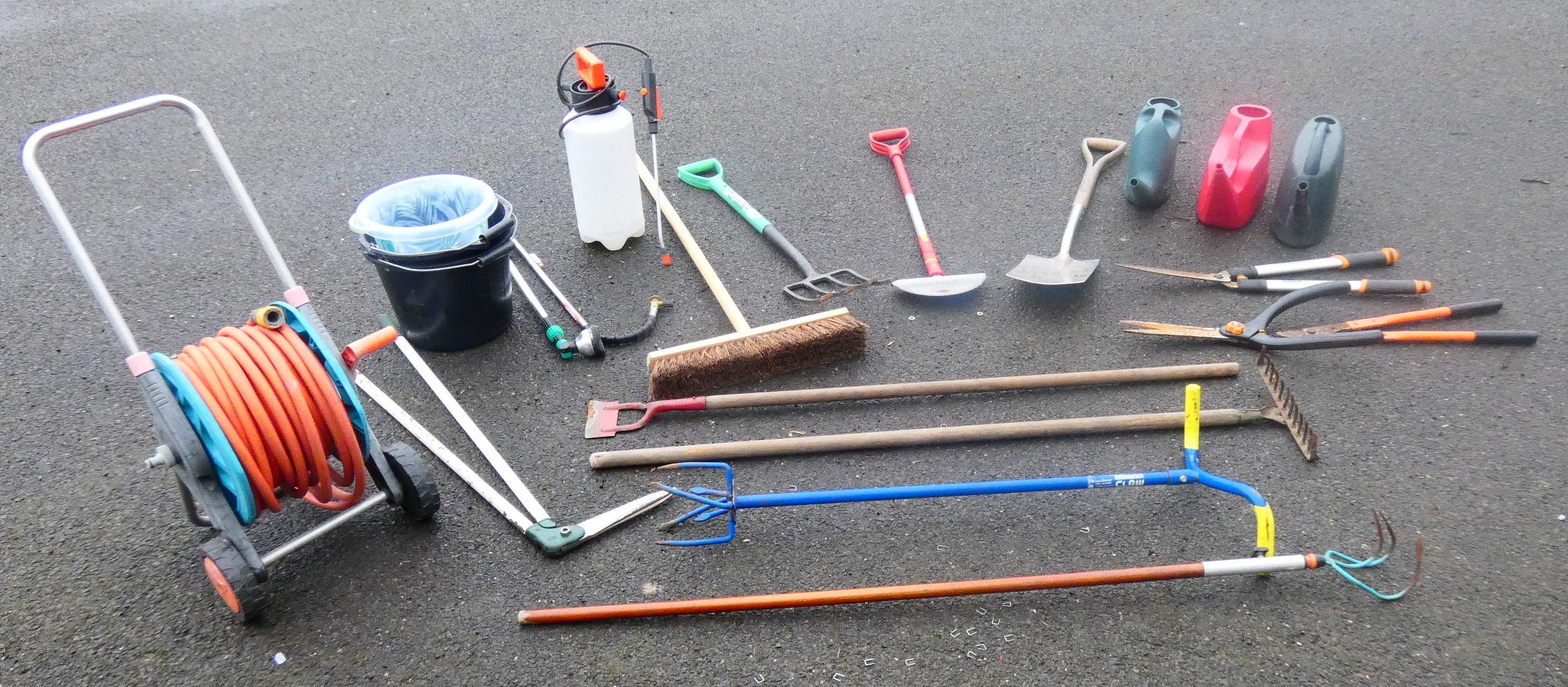 A collection of garden tools to include rakes, folk, spade, hoe, edging spade, weed rakes, sheers, sweeping brush, buckets, plastic watering cans, hand held sprayer and a portable hose with attachments.