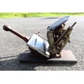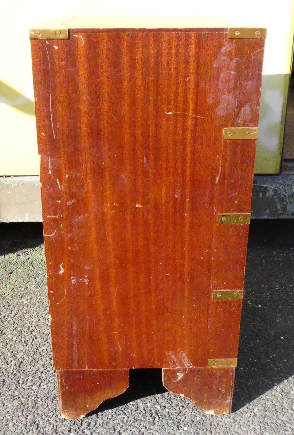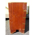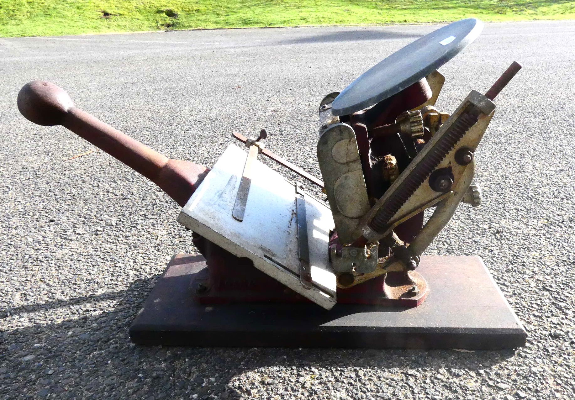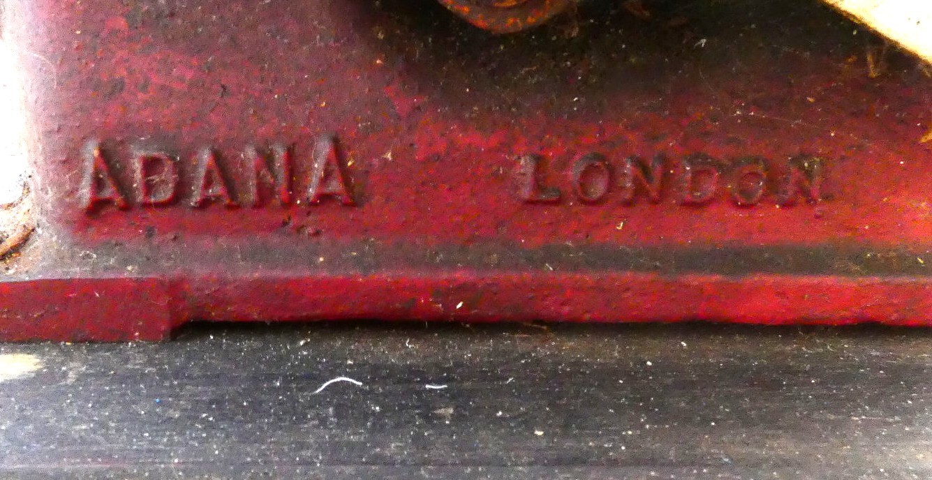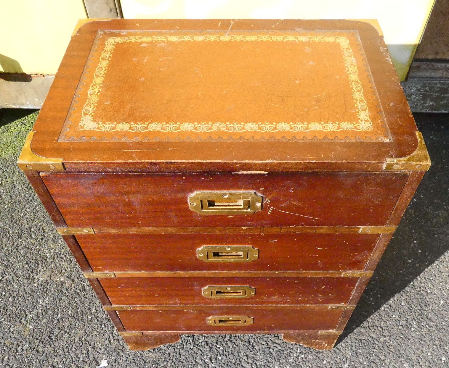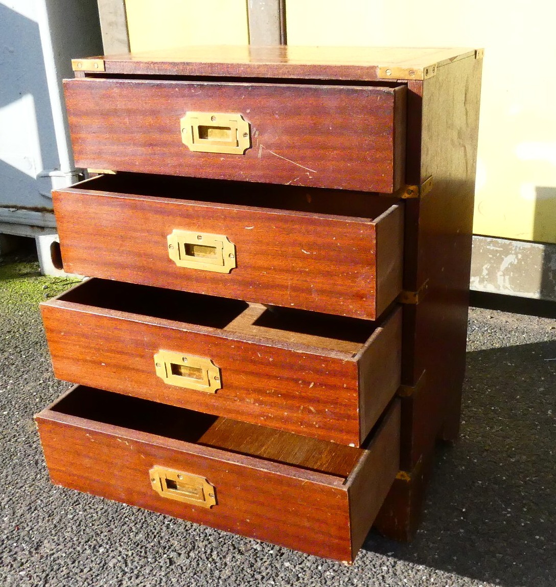 A four drawer mahogany veneered storage unit with bracket feet, a brown and gold embossed leather insert to the top, brass handles and brass corner brackets 46cm (W) x 30cm (D) x 62cm (H), also an Adana London hand operated printing press set on a wooden base.