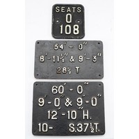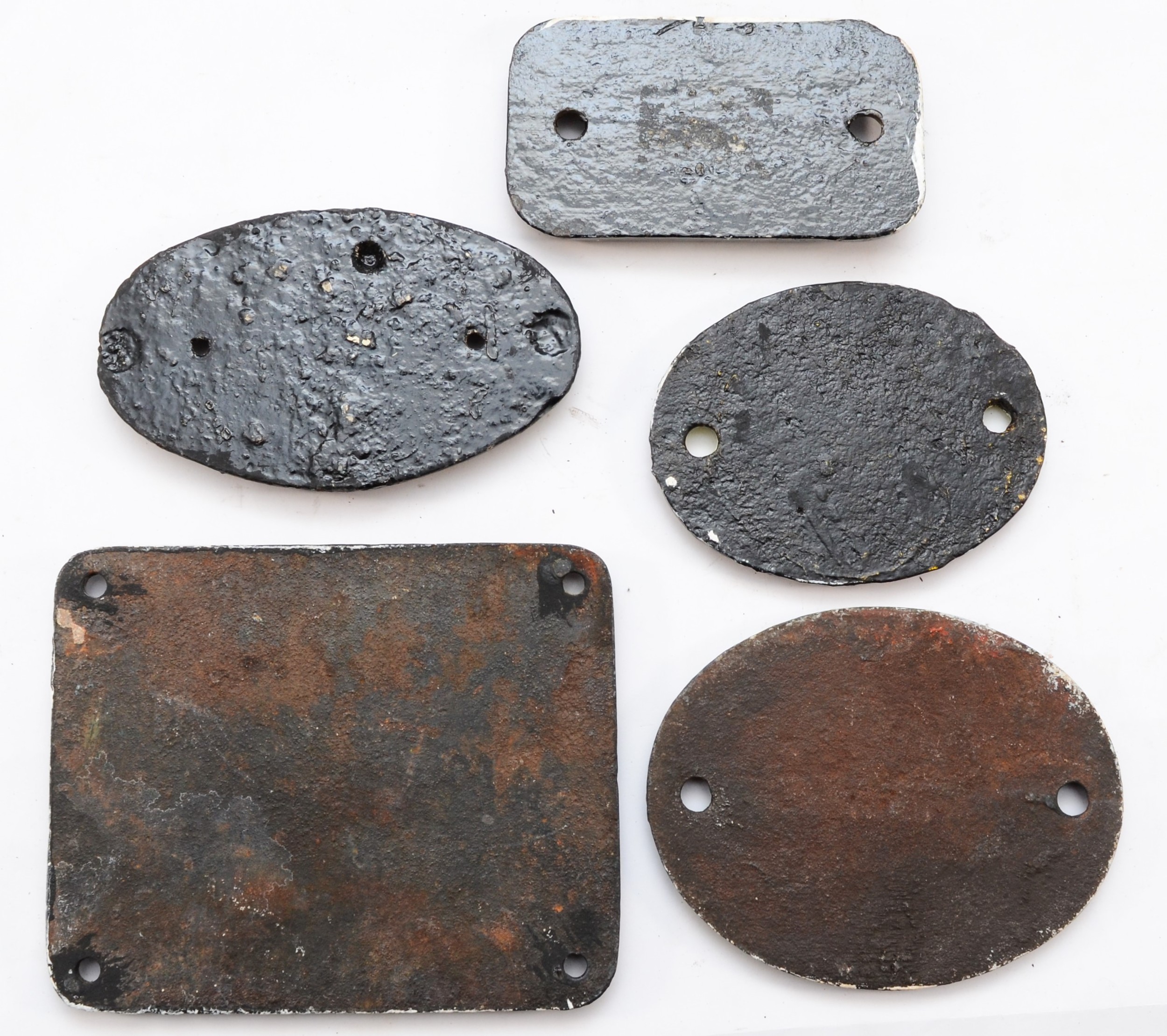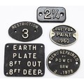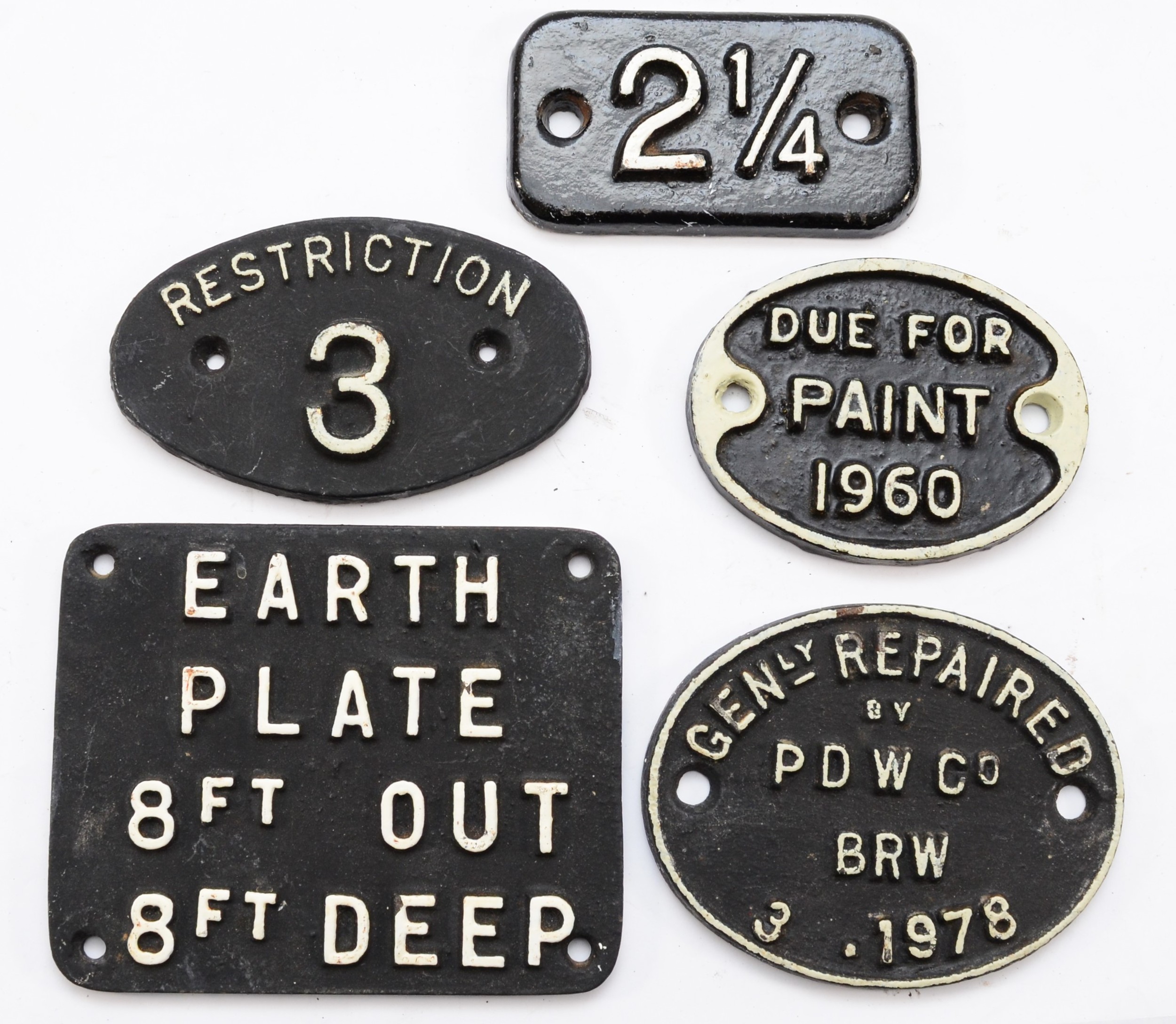 Five sundry small cast-iron plates, to include, 'Gen. Rep. 1978', 'Due for Paint 1960', and 'Earth Plate 8ft Out / 8ft Deep'.