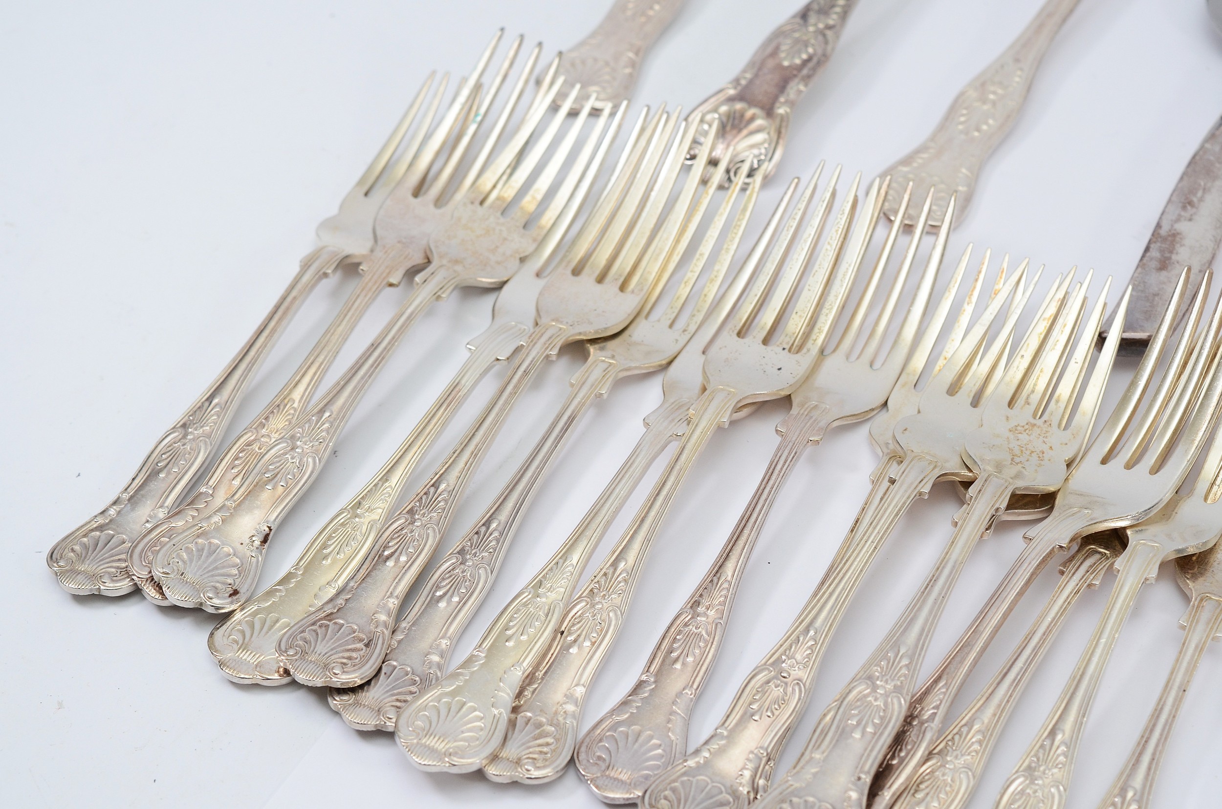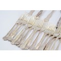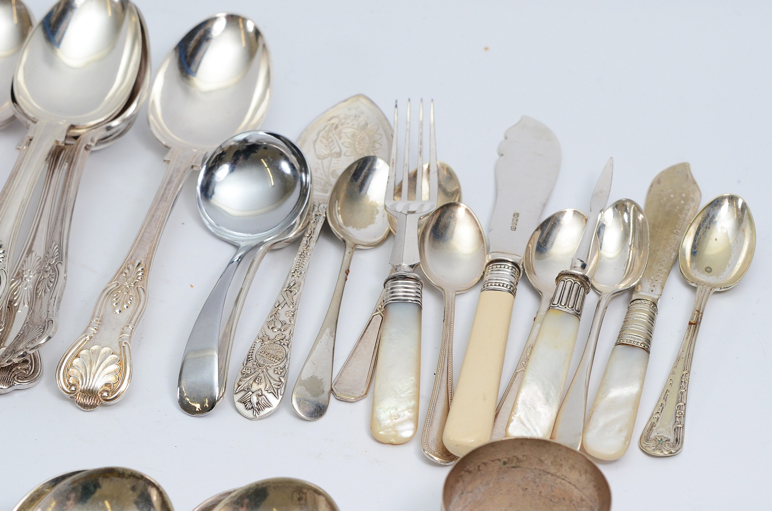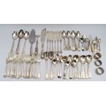 A quantity of silver plated cutlery to include 9x table spoons, shell pattern with diamond heel, 3x serving spoons, shell pattern with diamond heel, 5x fish knives and various other plated cutlery. 1x box.