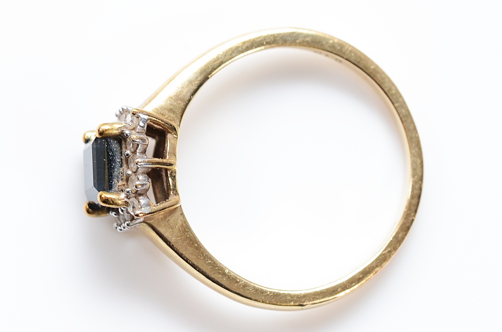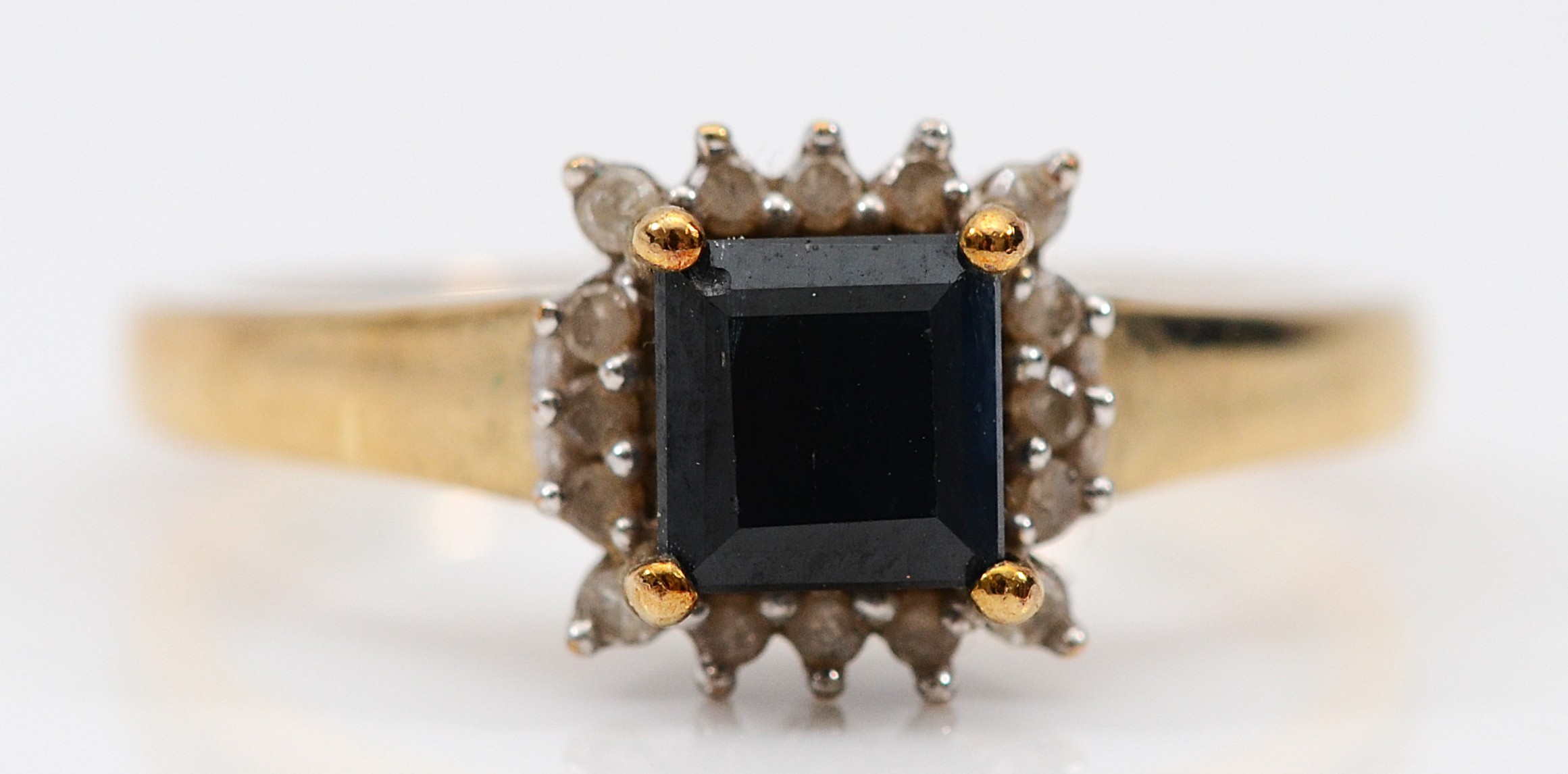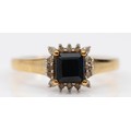 A 9ct gold sapphire and diamond square cluster ring, M, 2.3g