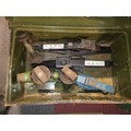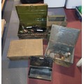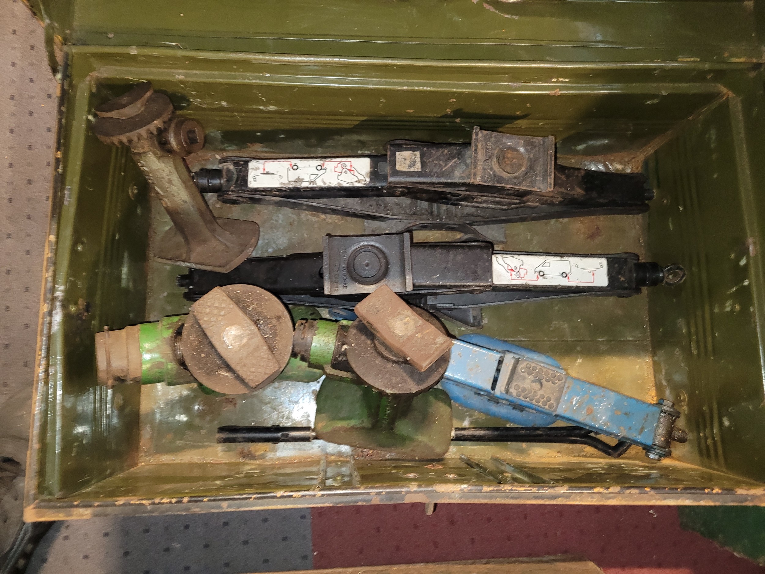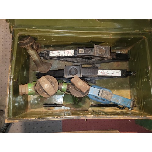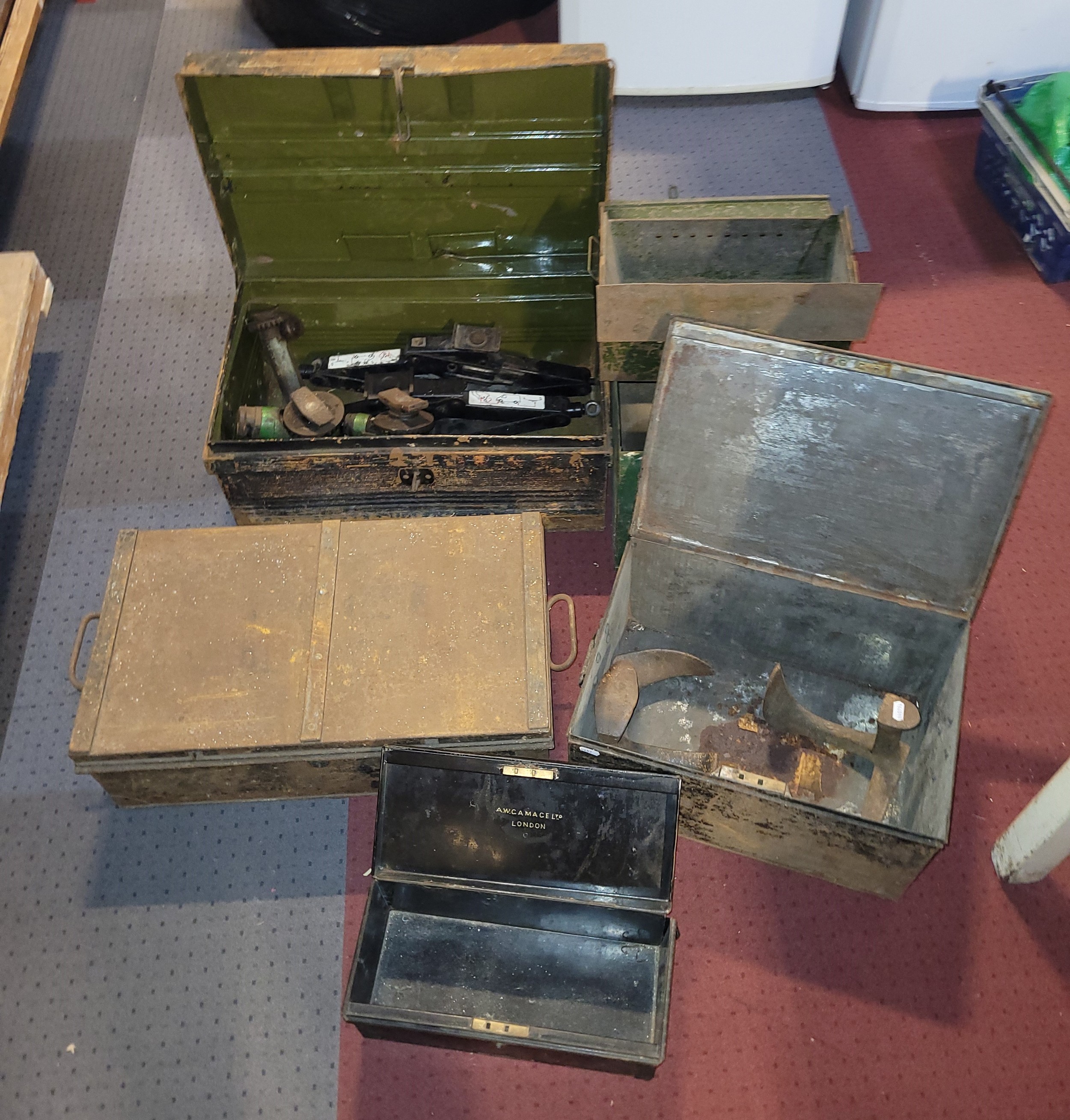 A large collection of metal boxes, to include, a deed box, cash box, tool box, alongside six car jacks and two shoe lasts.