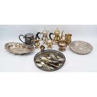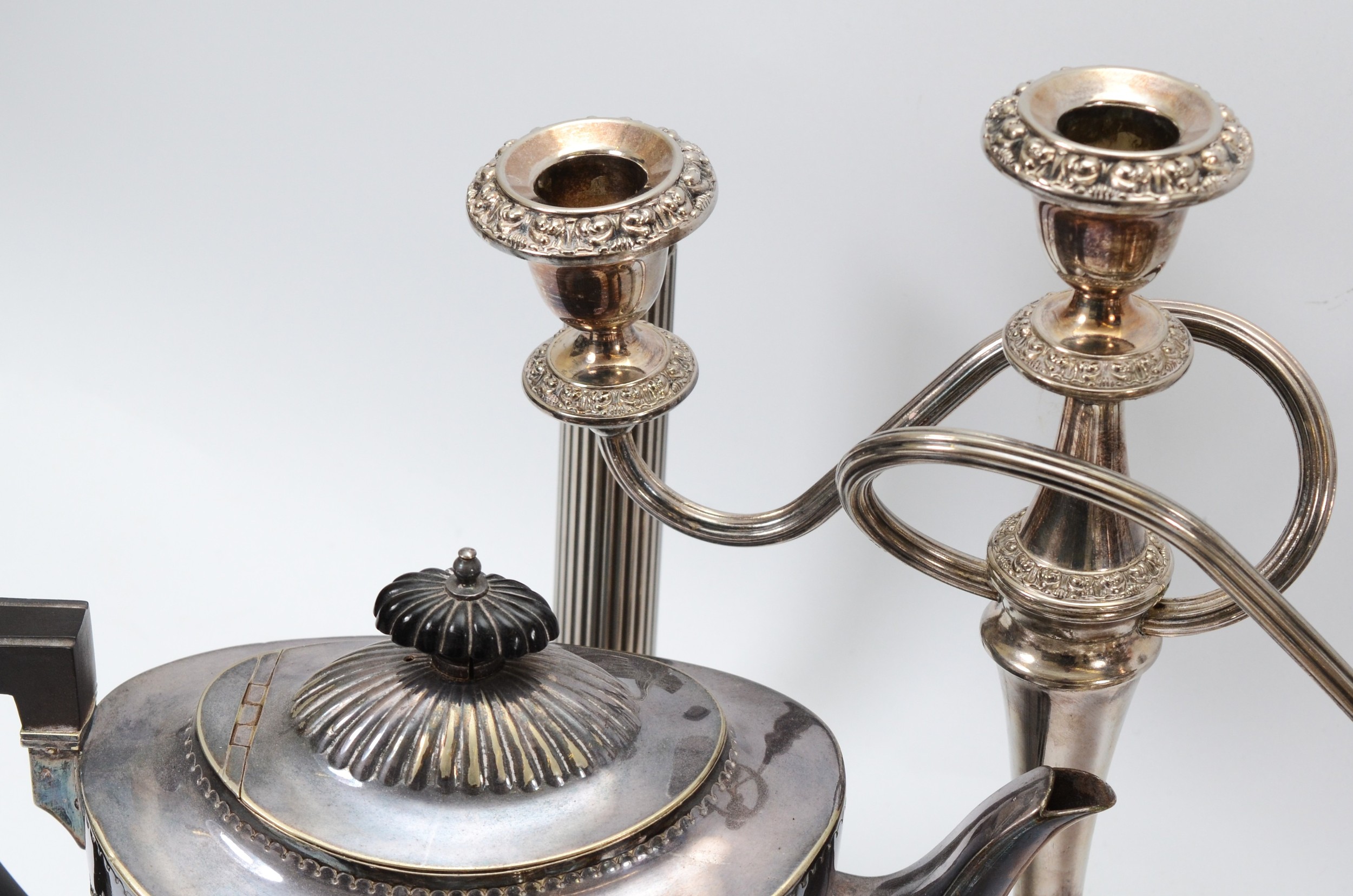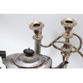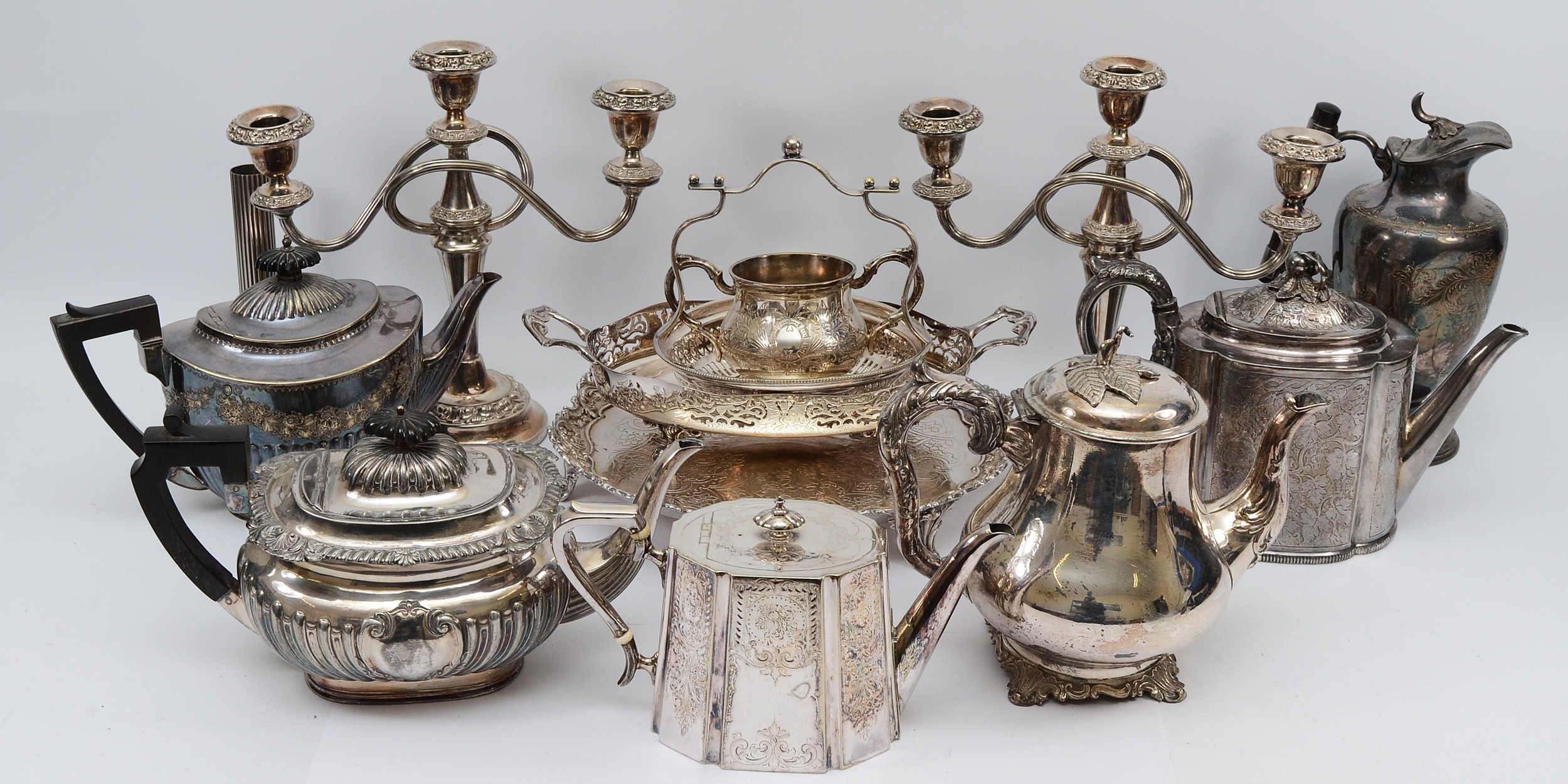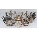 A large quantity of silver plated items compromising of five plated teapots, a plated ewer, two plated candelabras and other plated wares. 1x box
