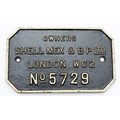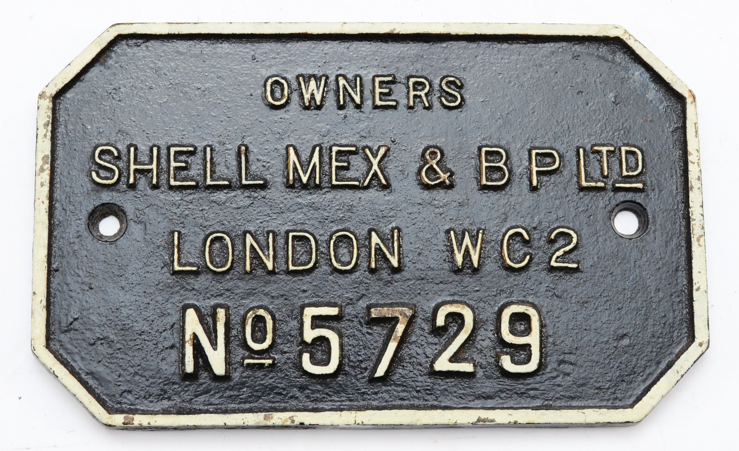 A rectangular cast-iron wagon plate, 'owners Shell-Mex and B.P. Ltd, London, WC2 no. 5729'.