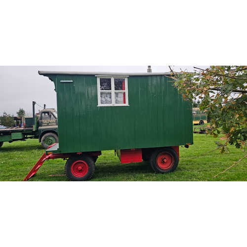 A late 19th roadman's living van, by Richard Garrett & Sons, c.1892, fully restored in 1999/2000 by our vendors. Tradition green painted timber body with domed canvas covered roof, fitted with pneumatic tyres, side awning with poles and removeable drawbar, painted pine interior, multifuel burning stove, pullout double bed, hidden toilet compartment, cold running water. Barn stored since the restoration except for when taken to shows/rallies. Approximately 13 1/2 x 7 foot, plus drawbar.