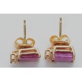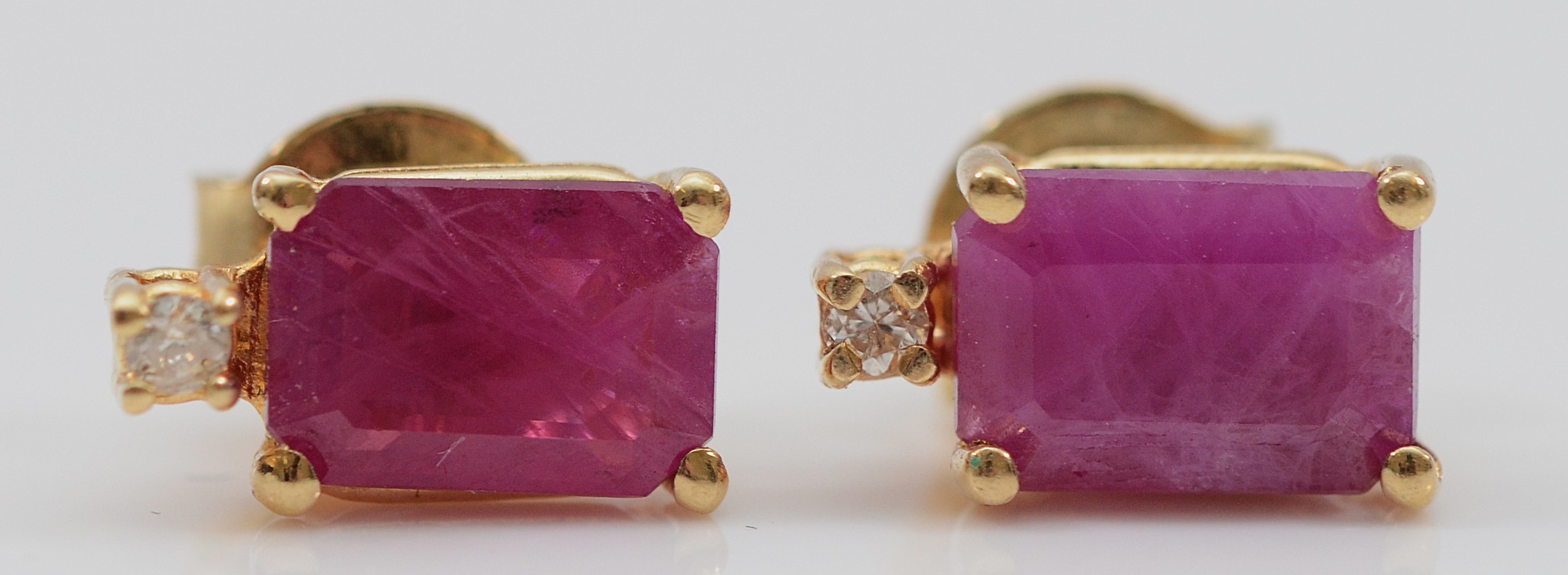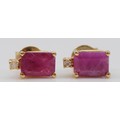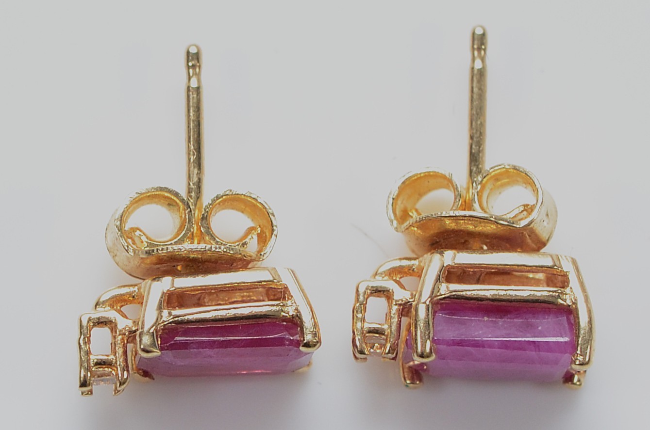 A pair of 14K gold ruby and diamond earrings with scroll backs, 1.8g