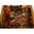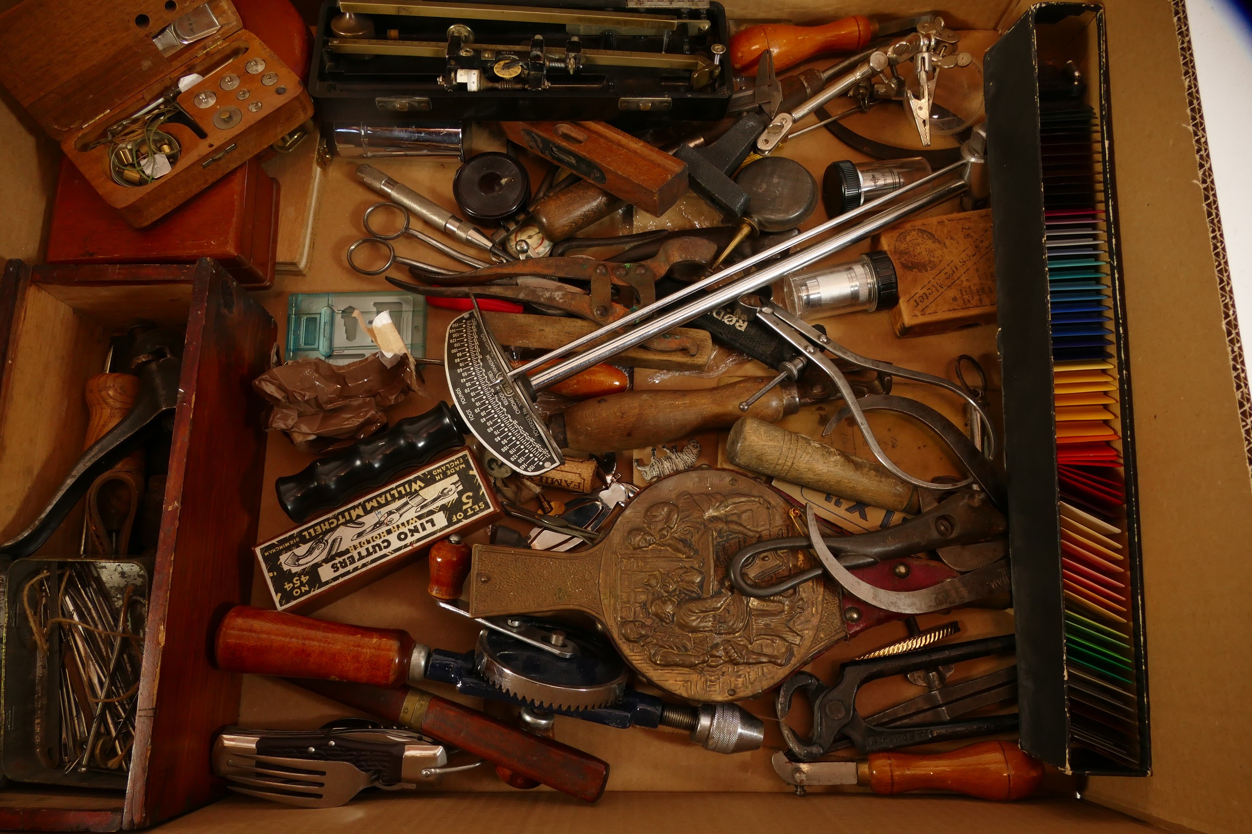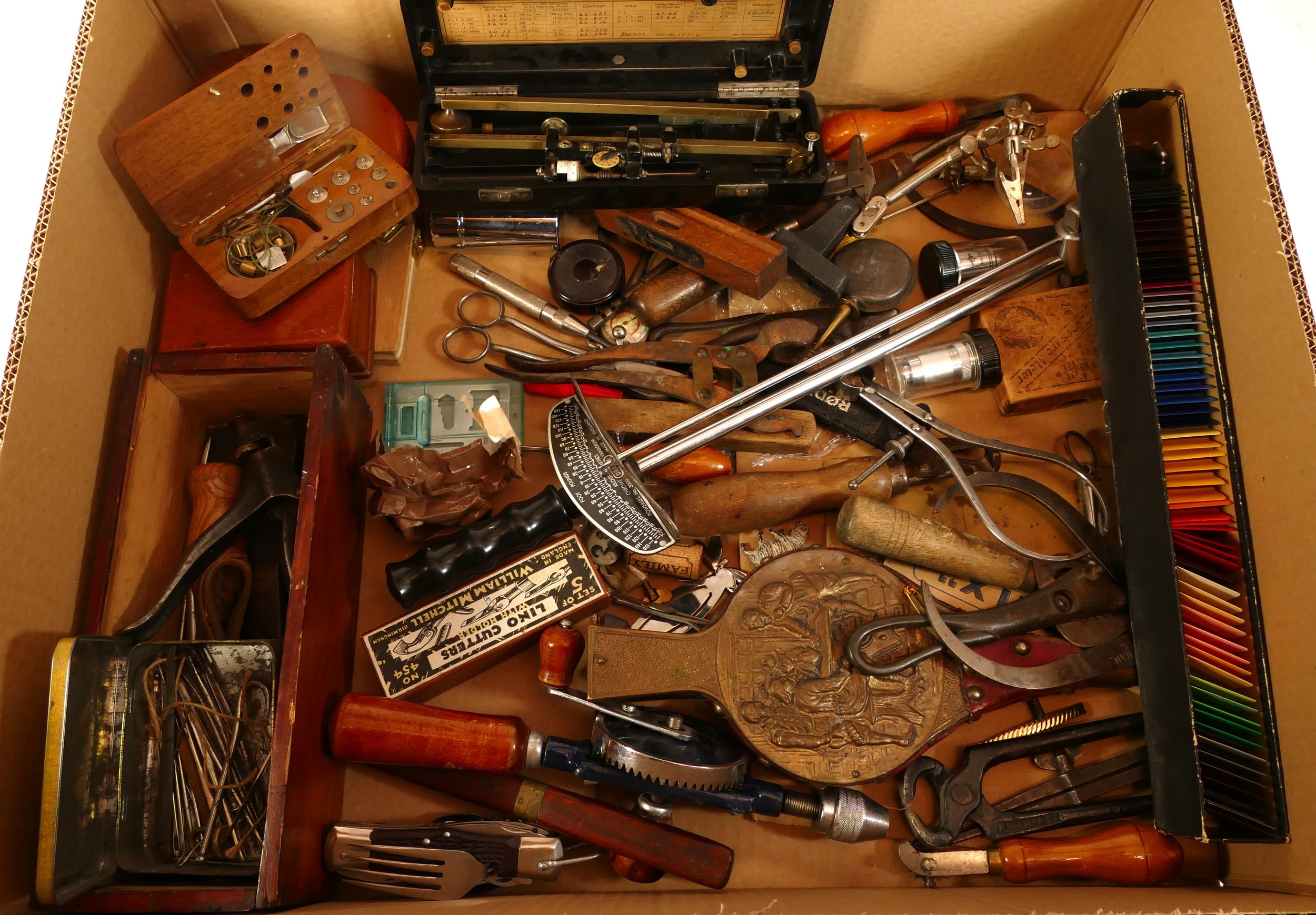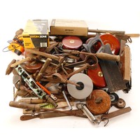 A collection of early to mid twentieth century hand tools to include vintage tin openers, tape measures, spirit levels, multi-tool, bellows, small magnifying stand and a Draper torque wrench.