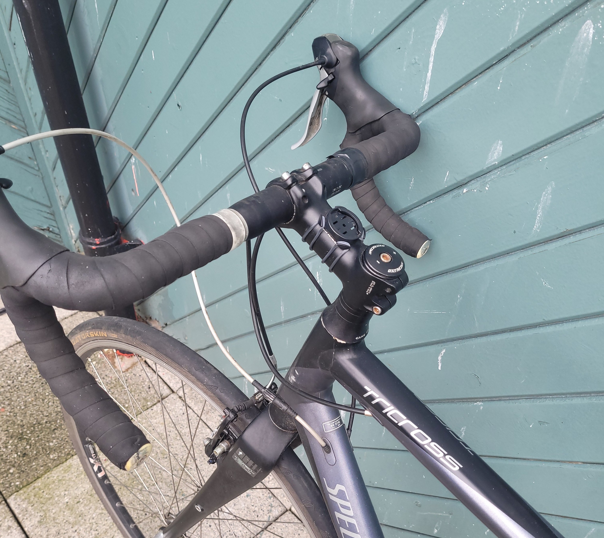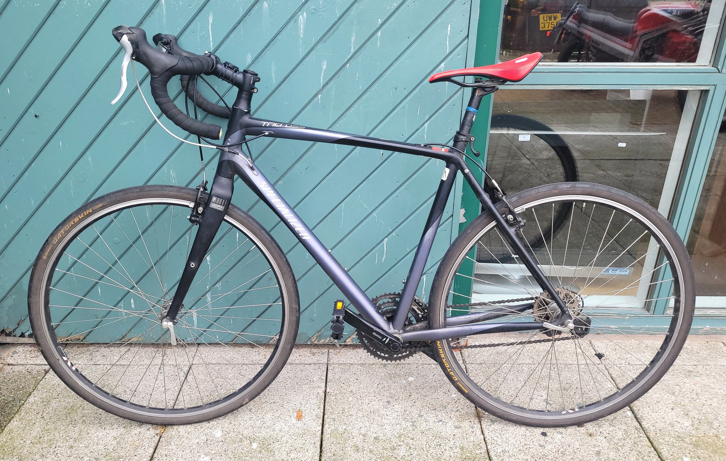 A Specialized EN14781Tricross gents racing bicycle in black with Shimano Tiagra wheels, Shimano Alivio gear system and Tek-Tro mini V brakes.