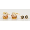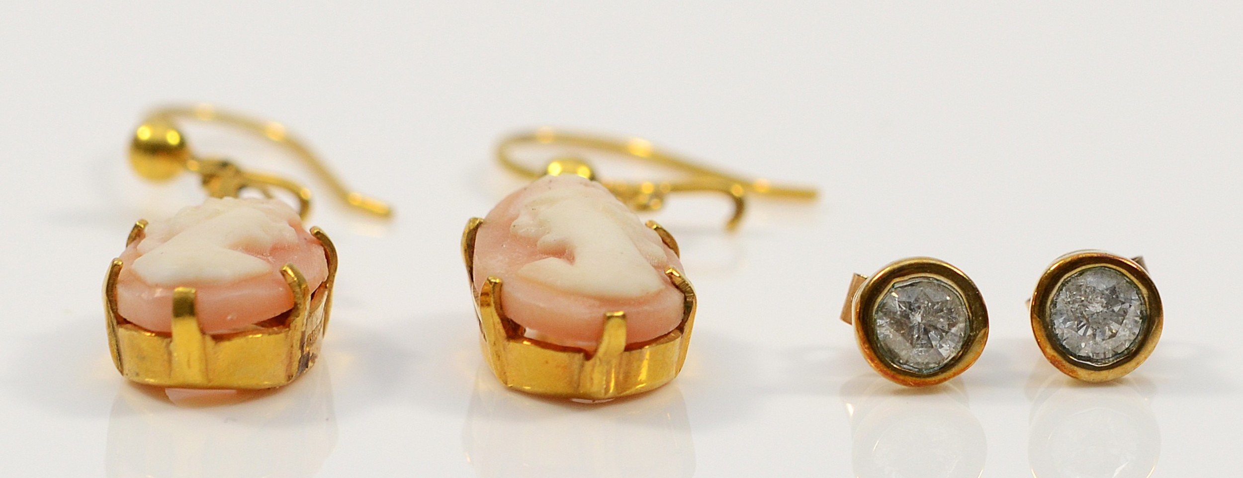 A pair of 9ct gold shell cameo drop earrings, with a pair of 9ct gold cubic zirconia earrings with scroll backs, 3.5g