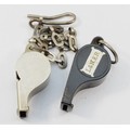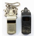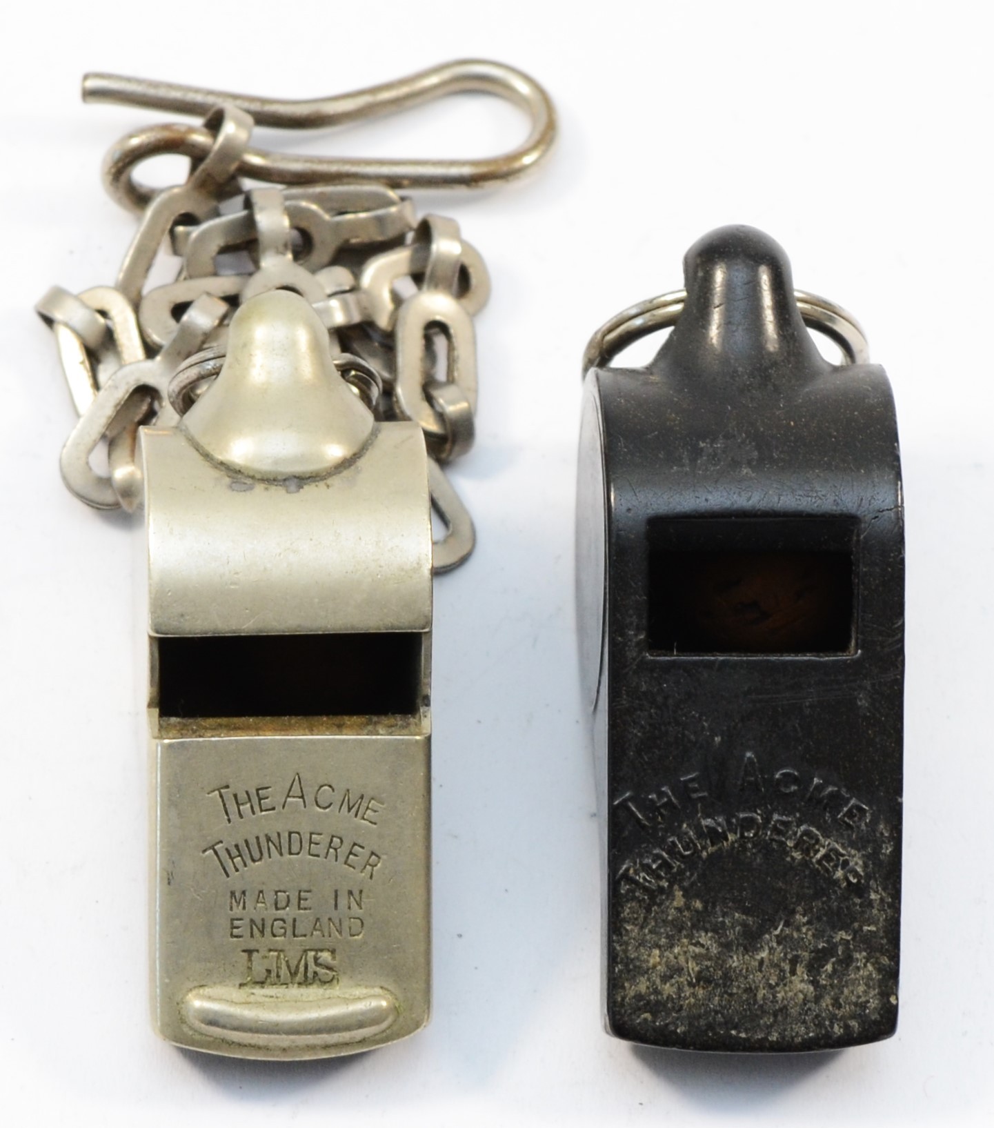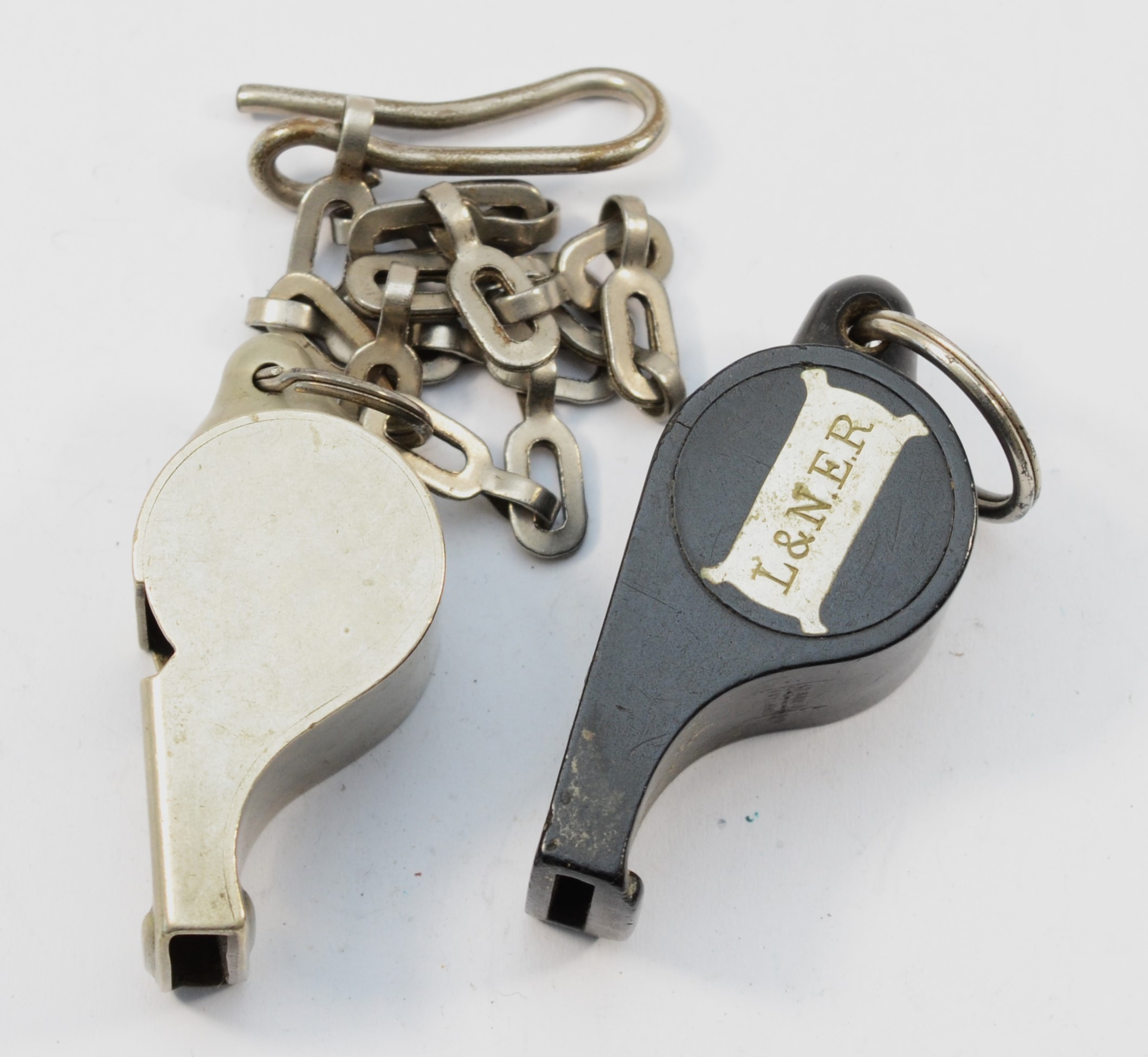 L.M.S., a nickel The Acme Thunderer whistle, stamped, with chain and a black plastic The Acme Thunderer L. & N.E.R. whistle (2)
