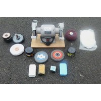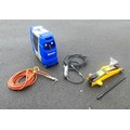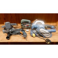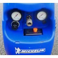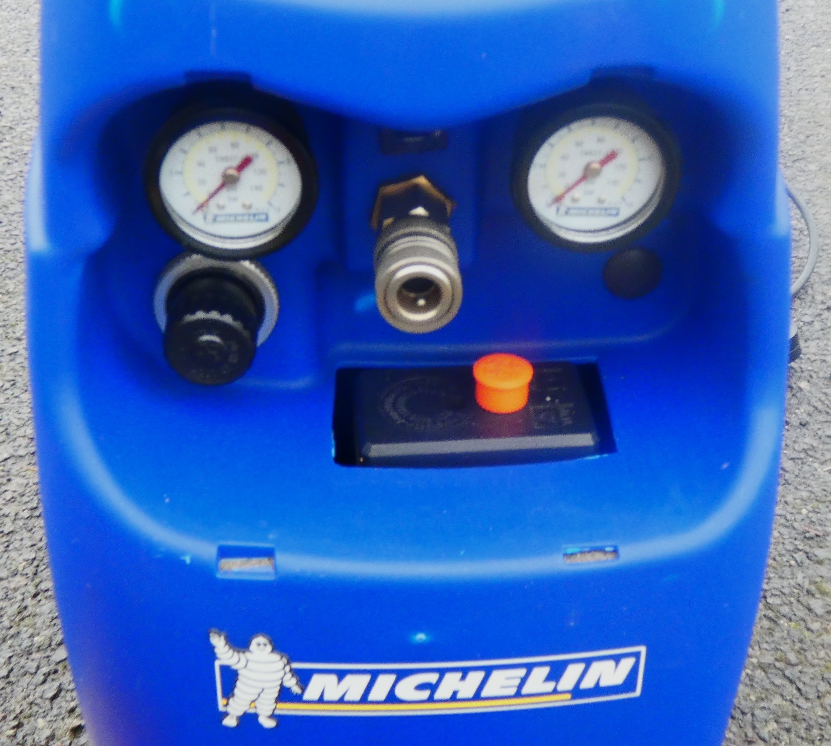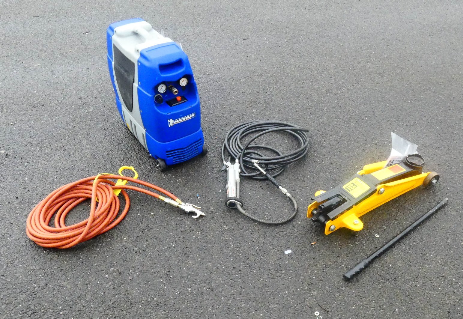 A Michelin 240v 1100w 8 bar portable air compressor serial number 520606924, to include a PLC MK2 inflation device with lead and an air blower with lead, also a Halfords 2.5 tonne hydraulic jack.