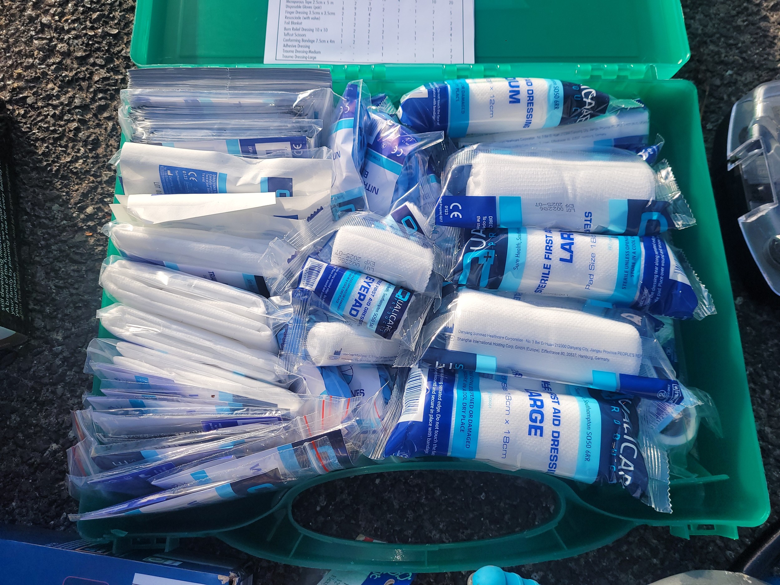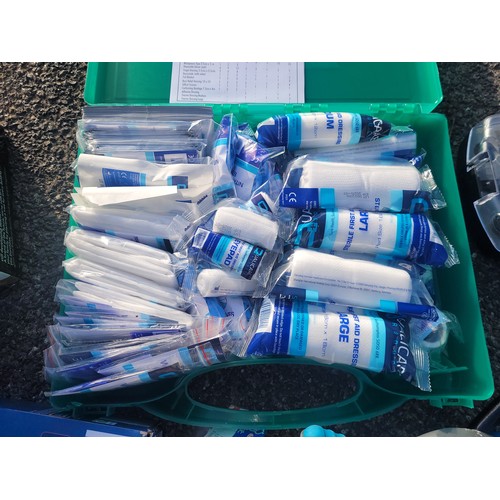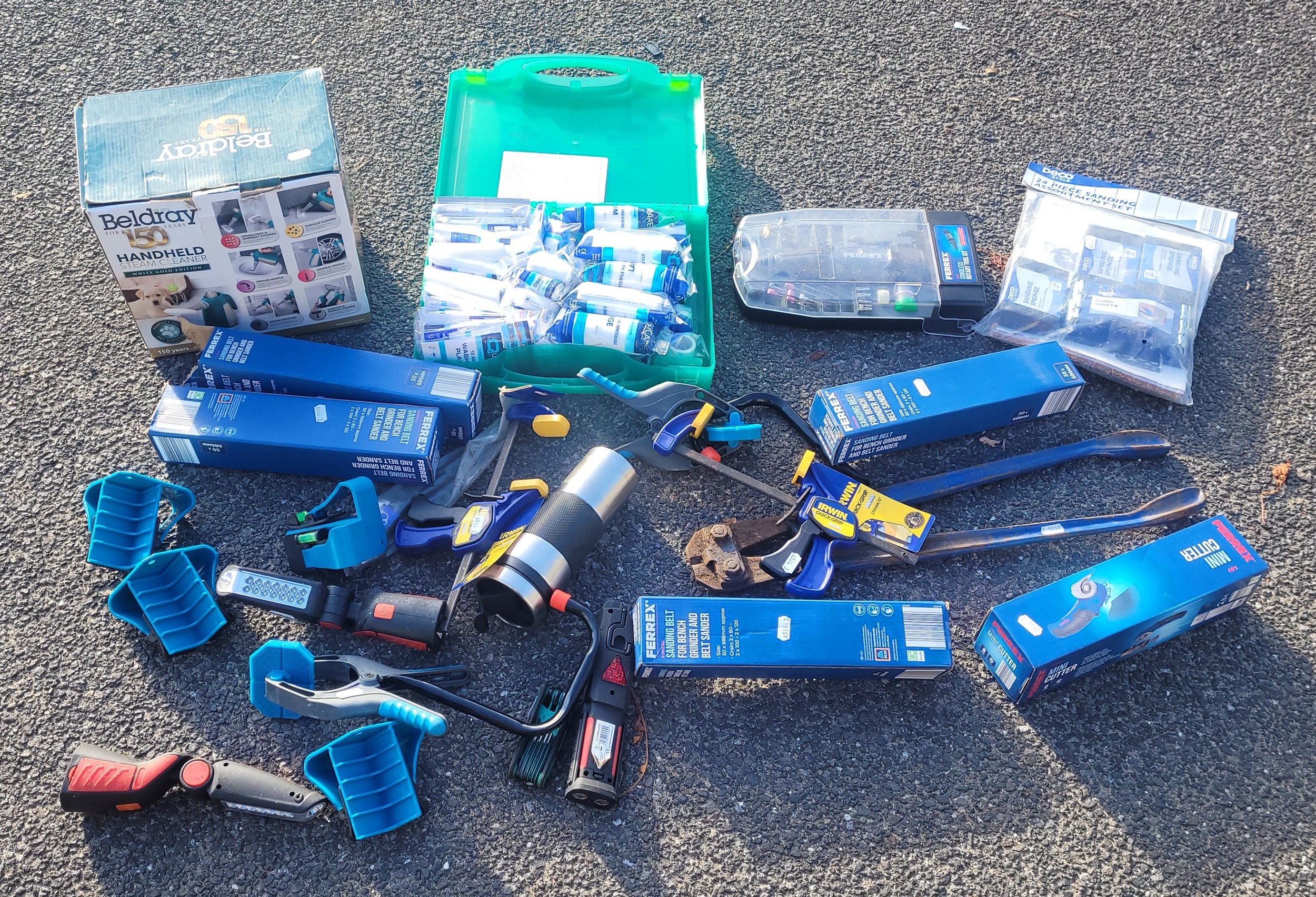 Four boxes of Ferrex sanding belts, a boxed Ferrex 3.6v mini cutter, Workzone spring grips, two metal wall brackets, a Lumatic 12" rubber flexible hose, two Irwin mini quick grips, a pair of Record BC-924 bolt cutters, three Lighthouse torches, a set of Faithfull Allen keys, a boxed Beldry hand held steam cleaner, a boxed Ferrex 12v cordless rotary tool kit also, a boxed Premier first aid kit BS 8599-1 compliant.