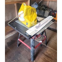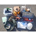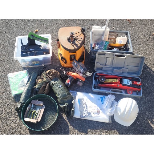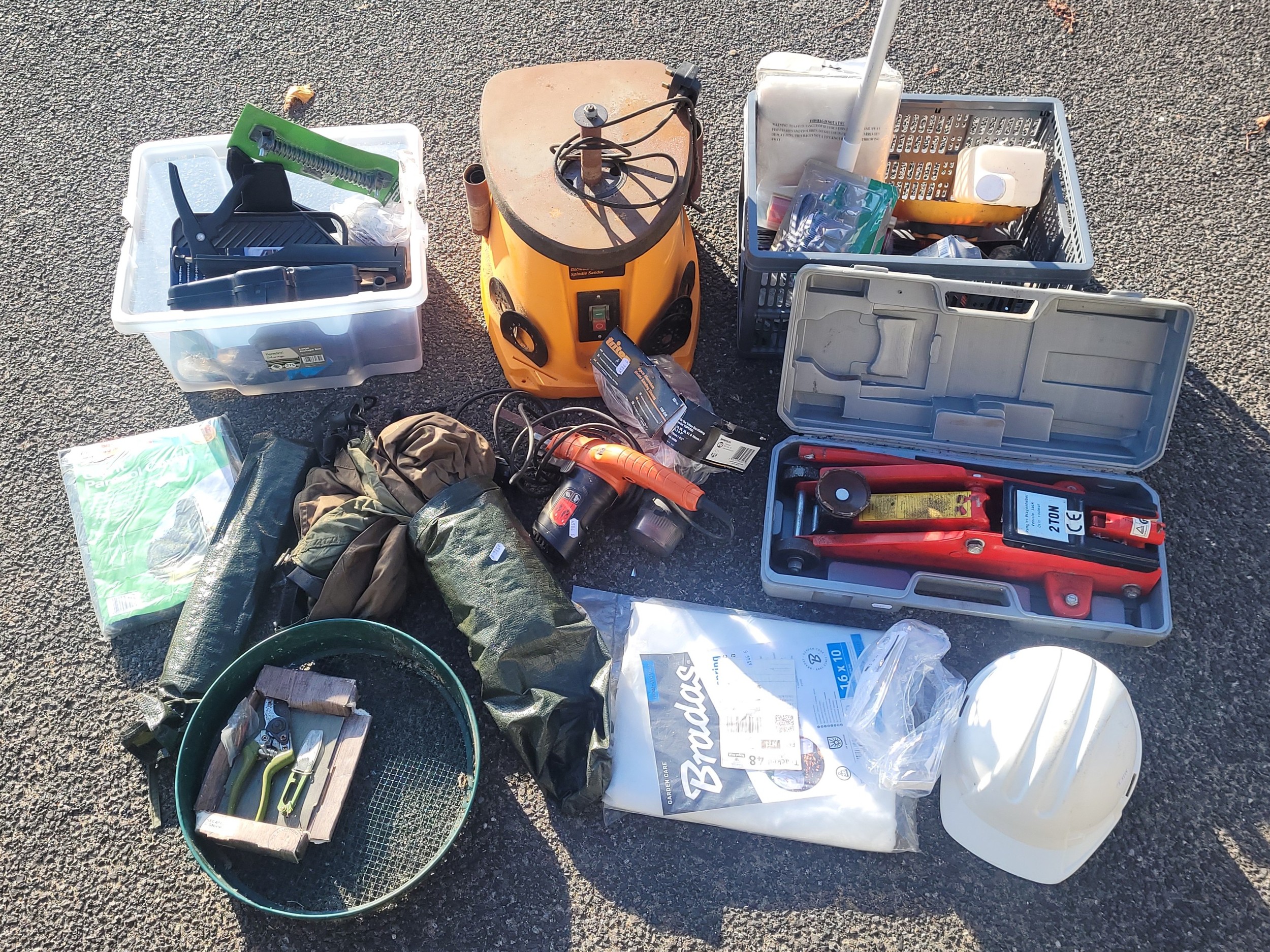 A Triton TSPS450 240v 2000rpm serial No 151900078 oscillating spindle sander with sanding belts, a Black and Decker KA900E 230v 350 sander, white adjustable safety helmet, two pairs of DJM safety goggles, a two ton hydraulic vehicle jack also a collection of garden tools and consumables to include a soil sieve, hose pipe set, shed/gate spring, sealing gun, giant parasol cover, a cotton mounted mosquito net, two plant protection fleeces 6m x 1m and 1.6m x 10m, Ryobi hedge trimming blades and a small vehicle jack.
