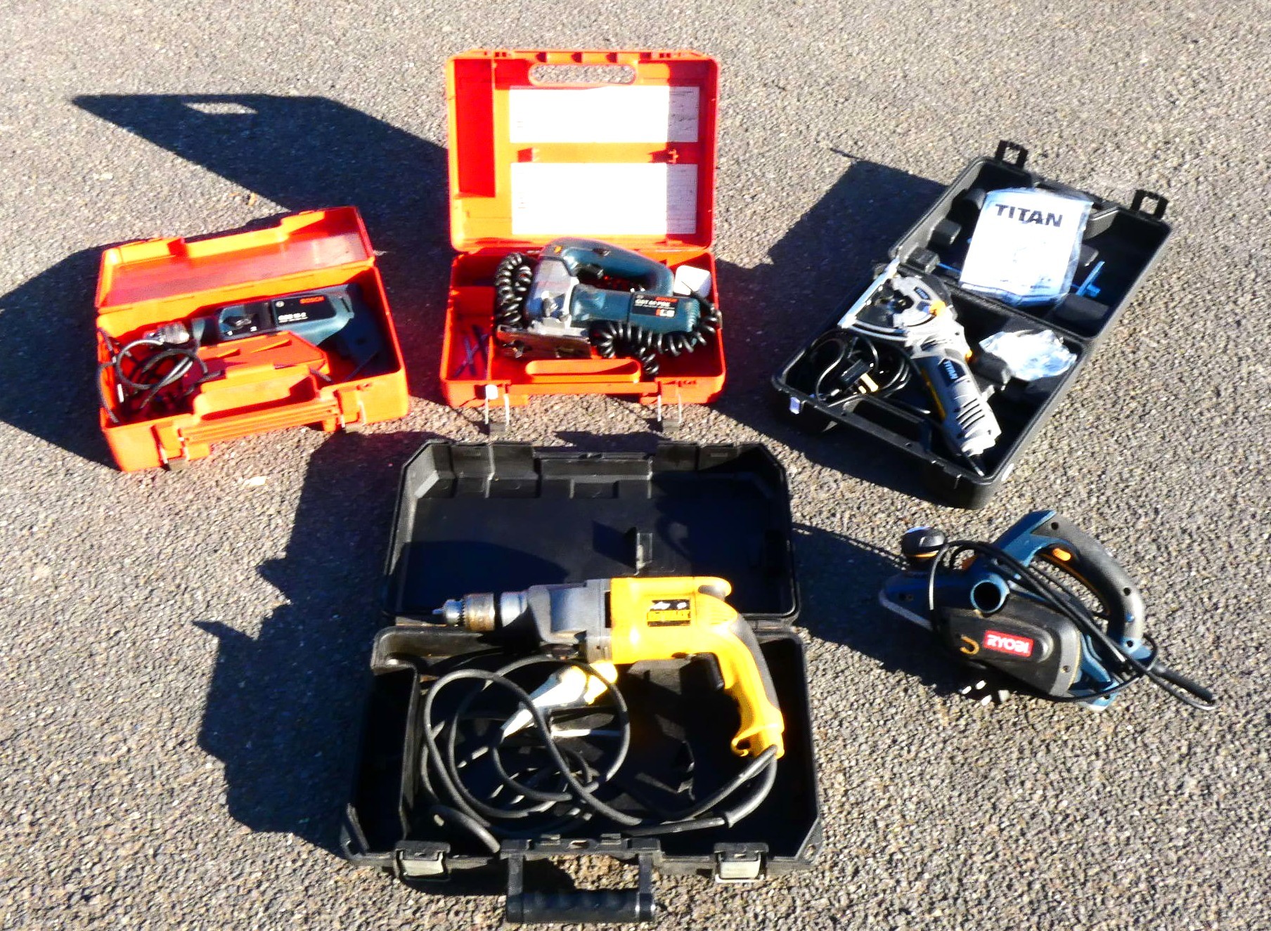 A collection of power tools to include, a boxed Bosch GST60 PBE 240v 550w jigsaw, a boxed Bosch GSB18-2 240v 600w drill, a boxed DeWalt 115v drill, a boxed Titan TTB689CSW 240v 500w mini circular and a boxed Ryobi EPN6082 230v 600w wood planer. (5).
