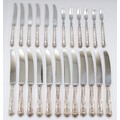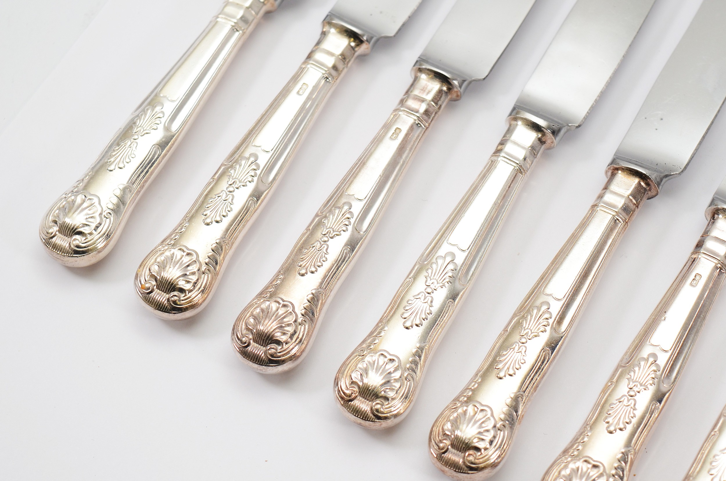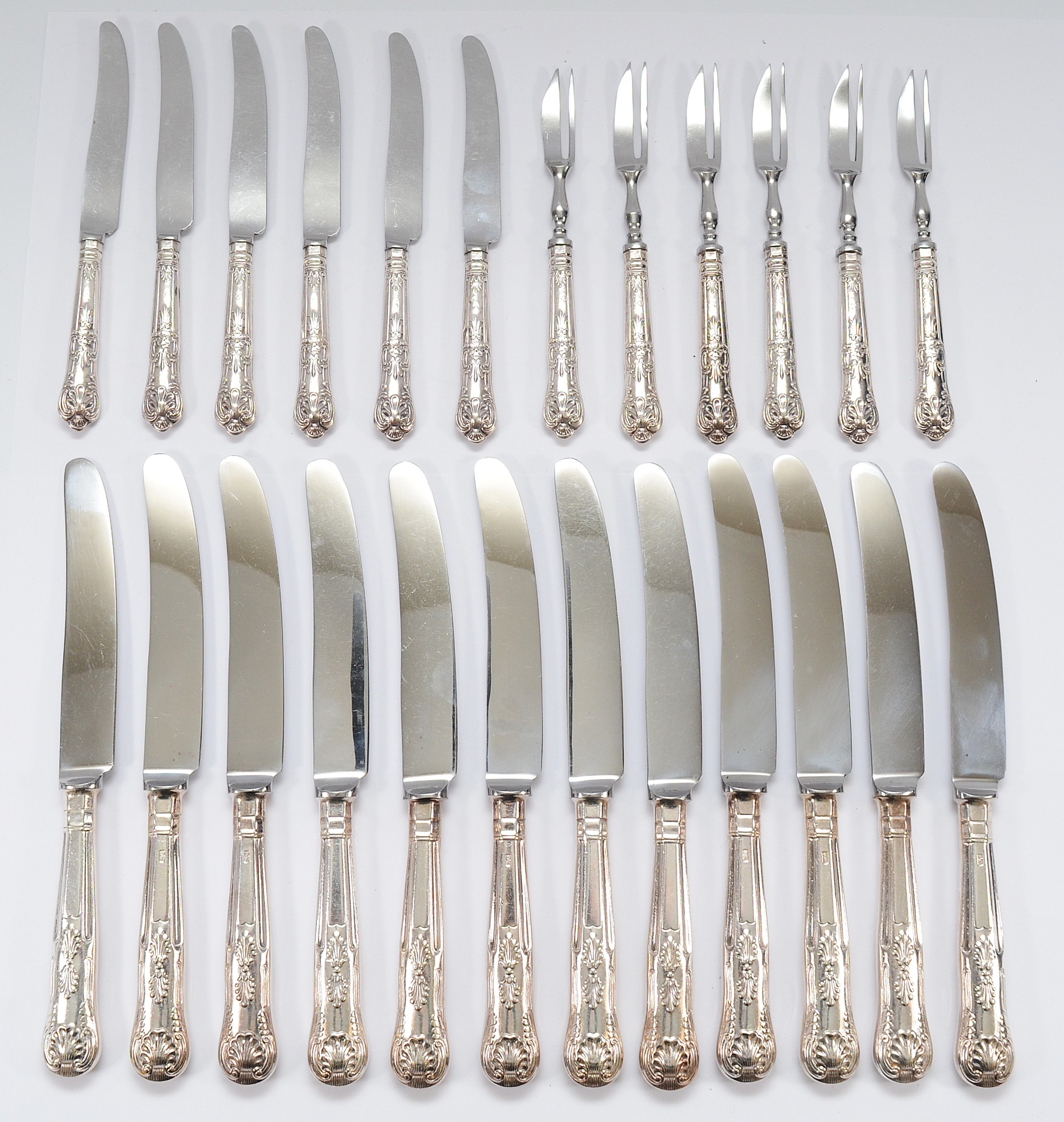 A set of twelve silver handled and stainless steel knifes, Sheffield 1975, together with a set of six silver handles cake knifes, Sheffield 1971, and six matching cake forks, Sheffield 1971.