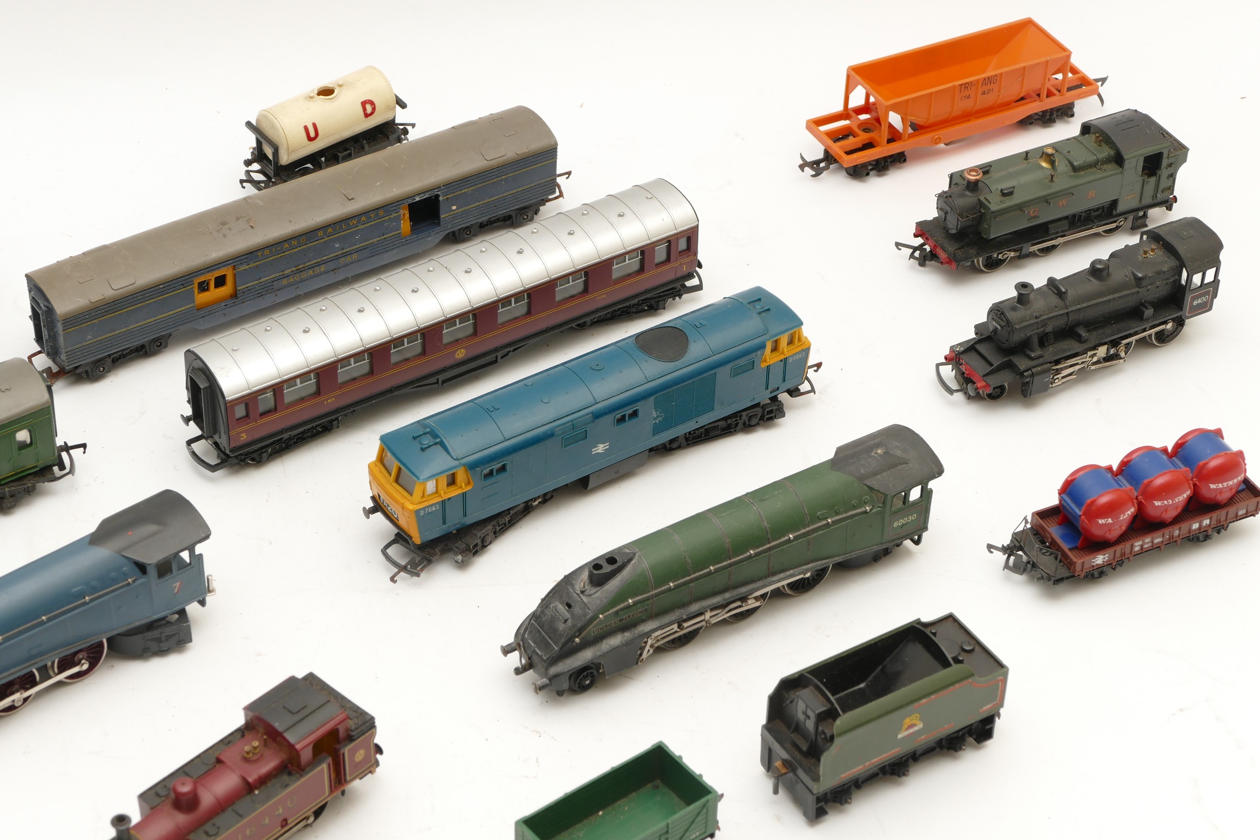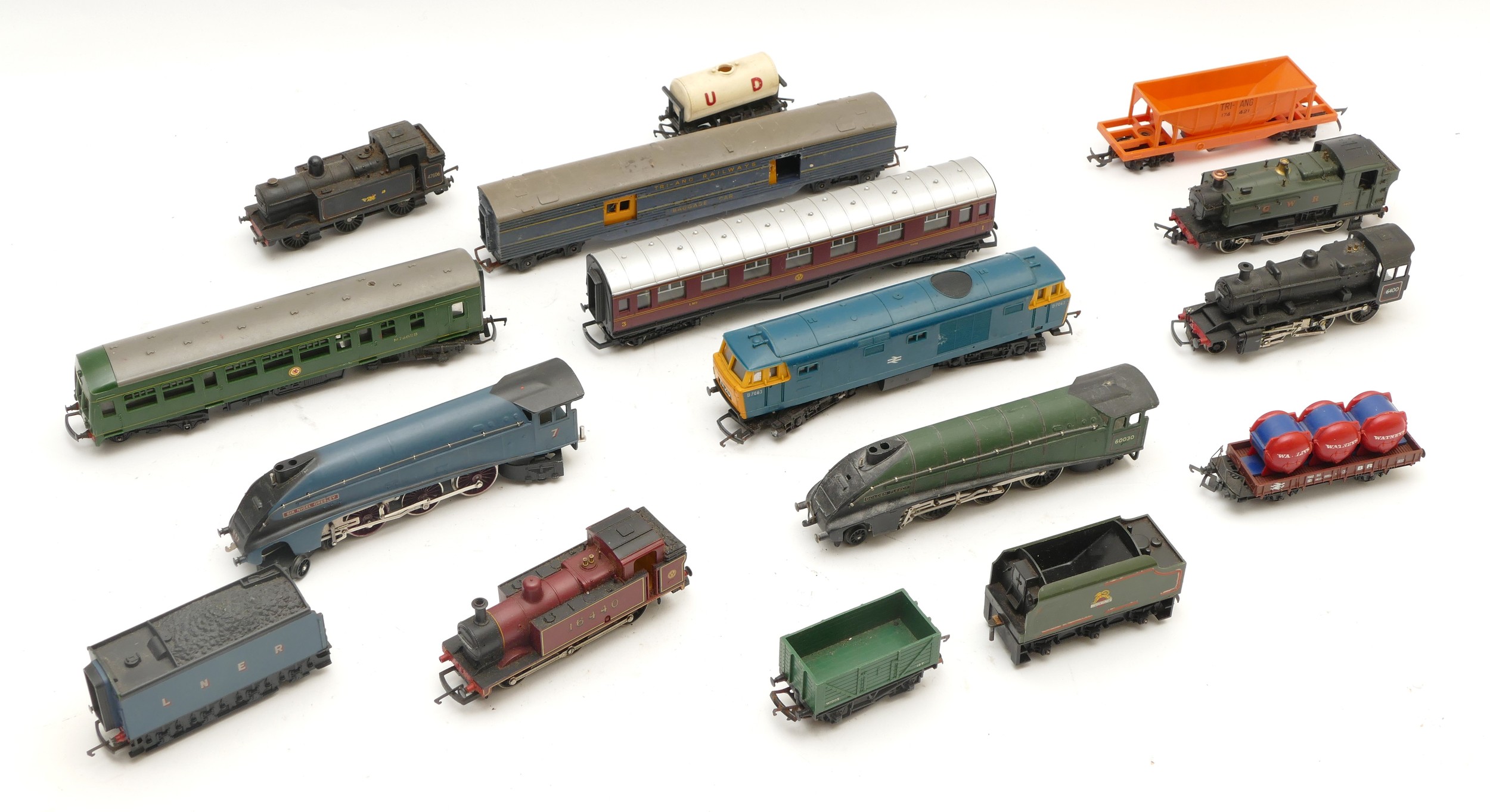 A collection of 00 gauge model railway, to include locomotives, tenders, rolling stock and carriages, by Hornby and Tri-Ang, all playworn.