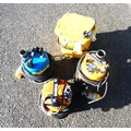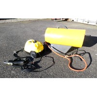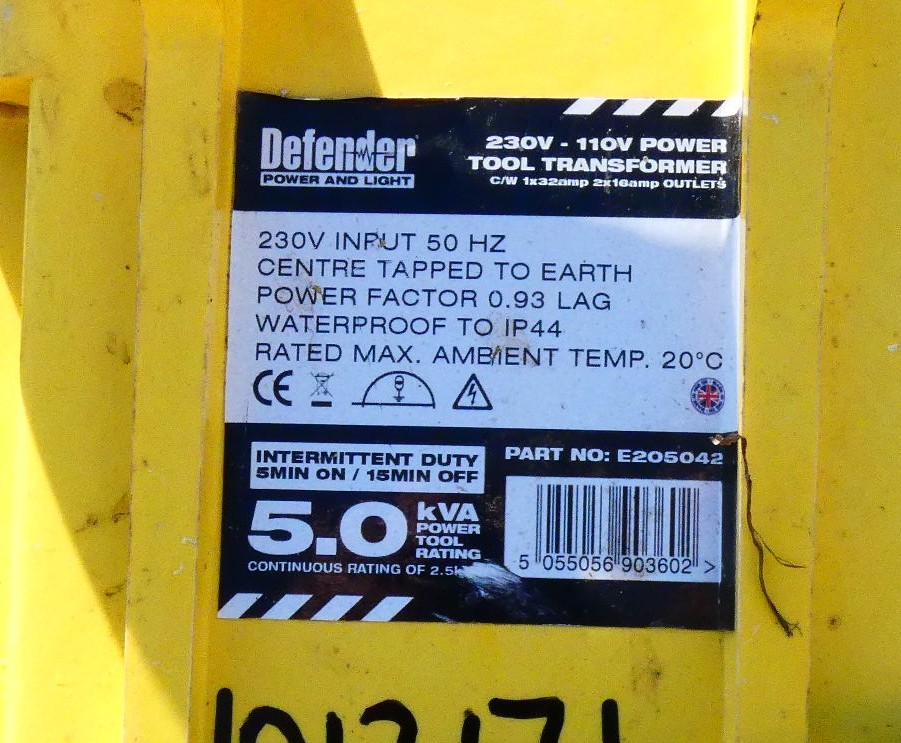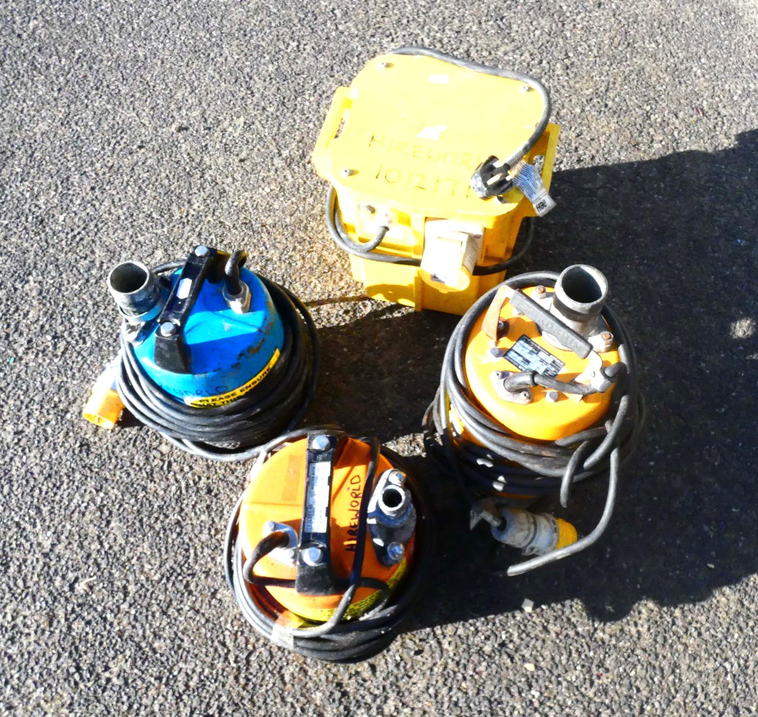 Three 110v submersible pumps to include, Ponstar PB55011 400w, a Tsurumi LSC1.4S 480w and one other, to include a 4cm diameter hose and a 8cm diameter hose, together with a Defender 230v - 110v power tool transformer.
