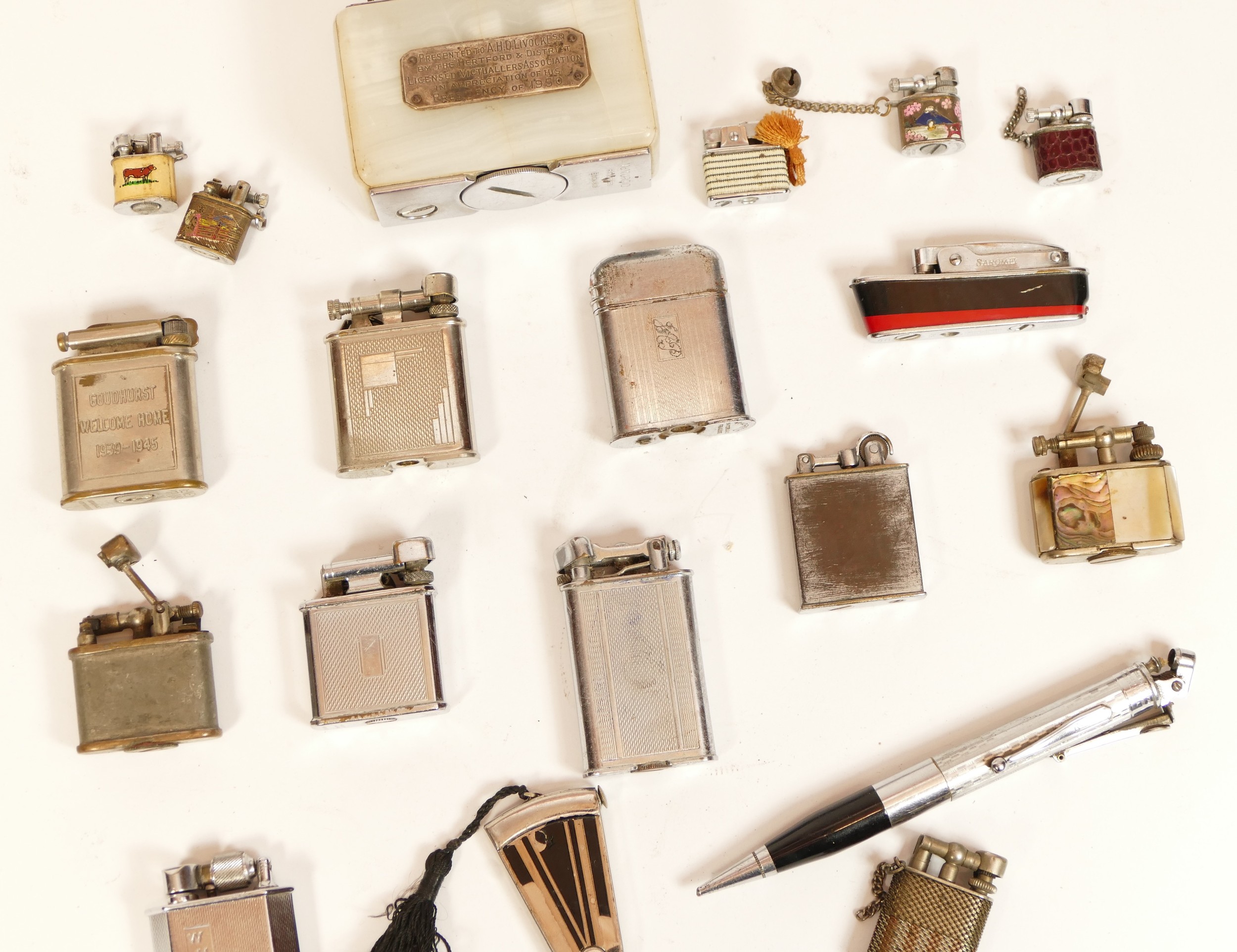 A collection of 1930s and later cigarette lighters, petrol operated, to include 'lift arm' Polo's, a Ronson pencil lighter, Mc Murdo pocket and table lighters, Japanese 'Pygmy' keyring lighters and other examples.