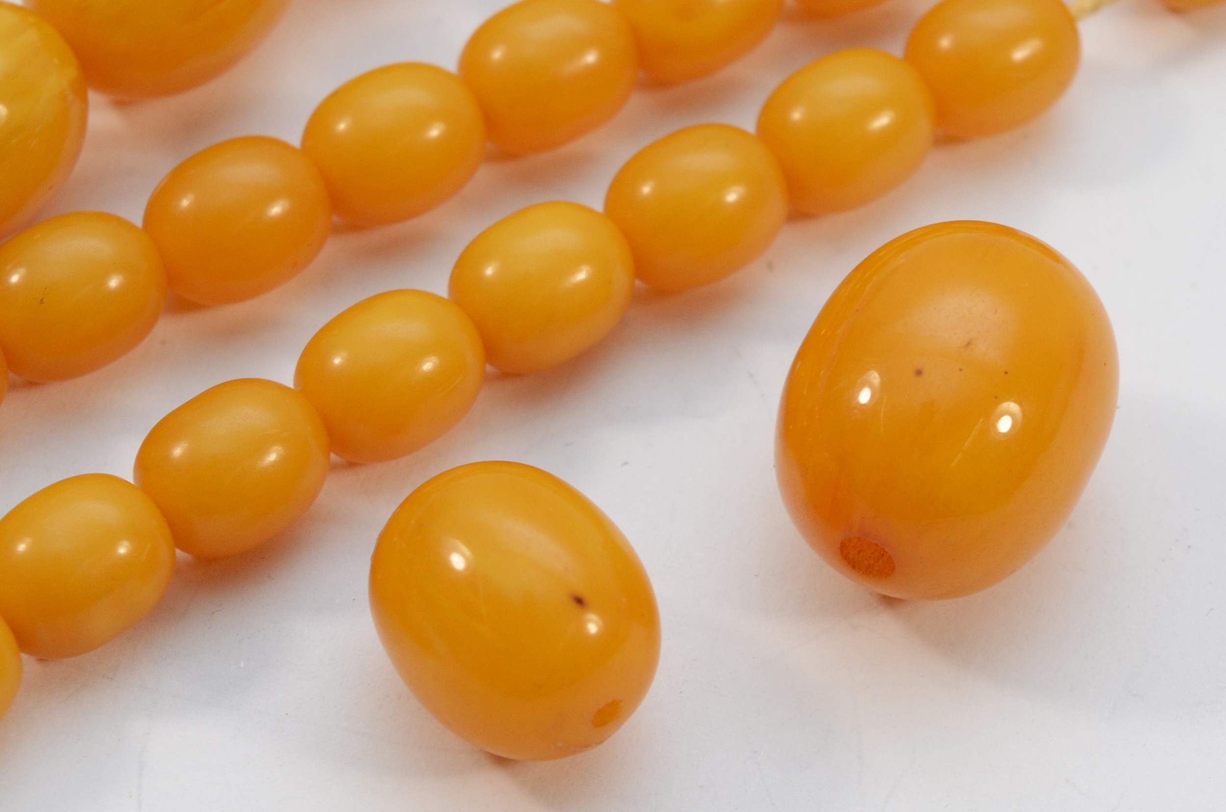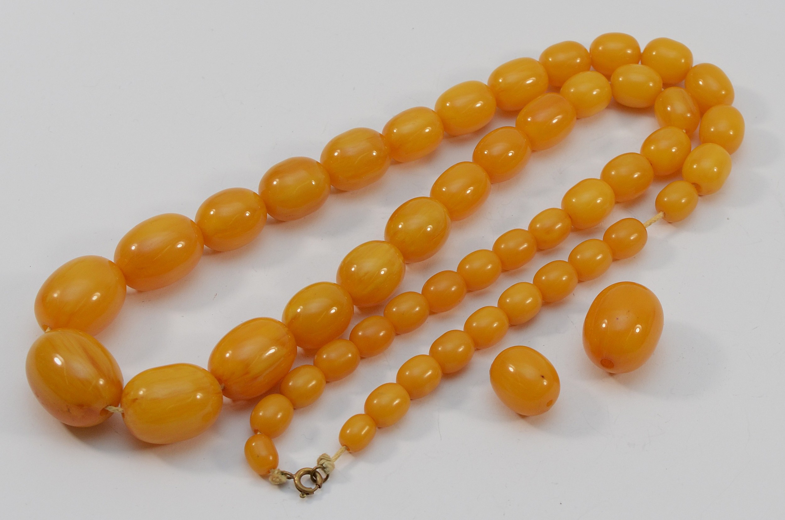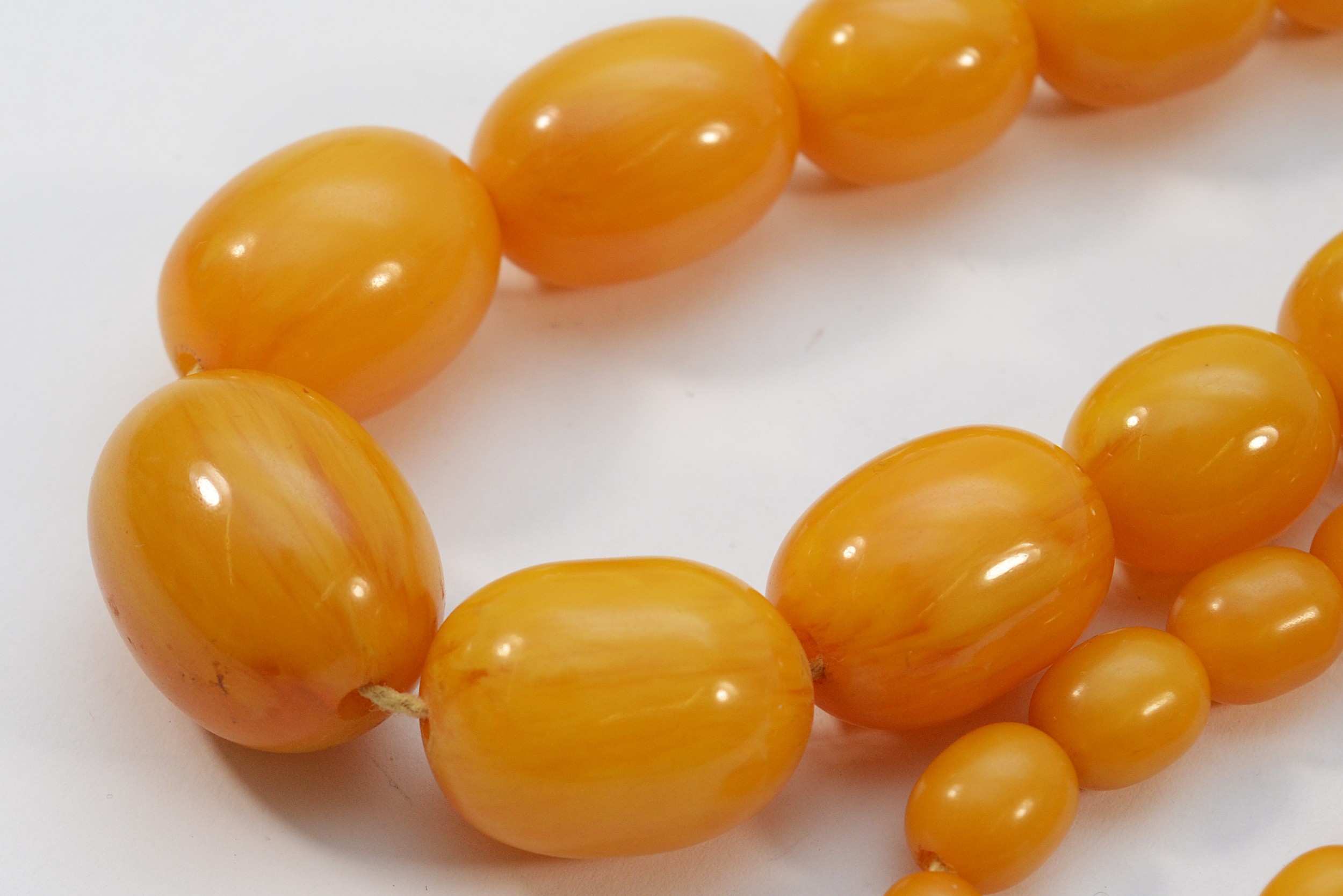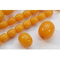 A Bakelite beaded necklace. graduating bead size, largest 25mm, 78cm with two spare beads, 113g