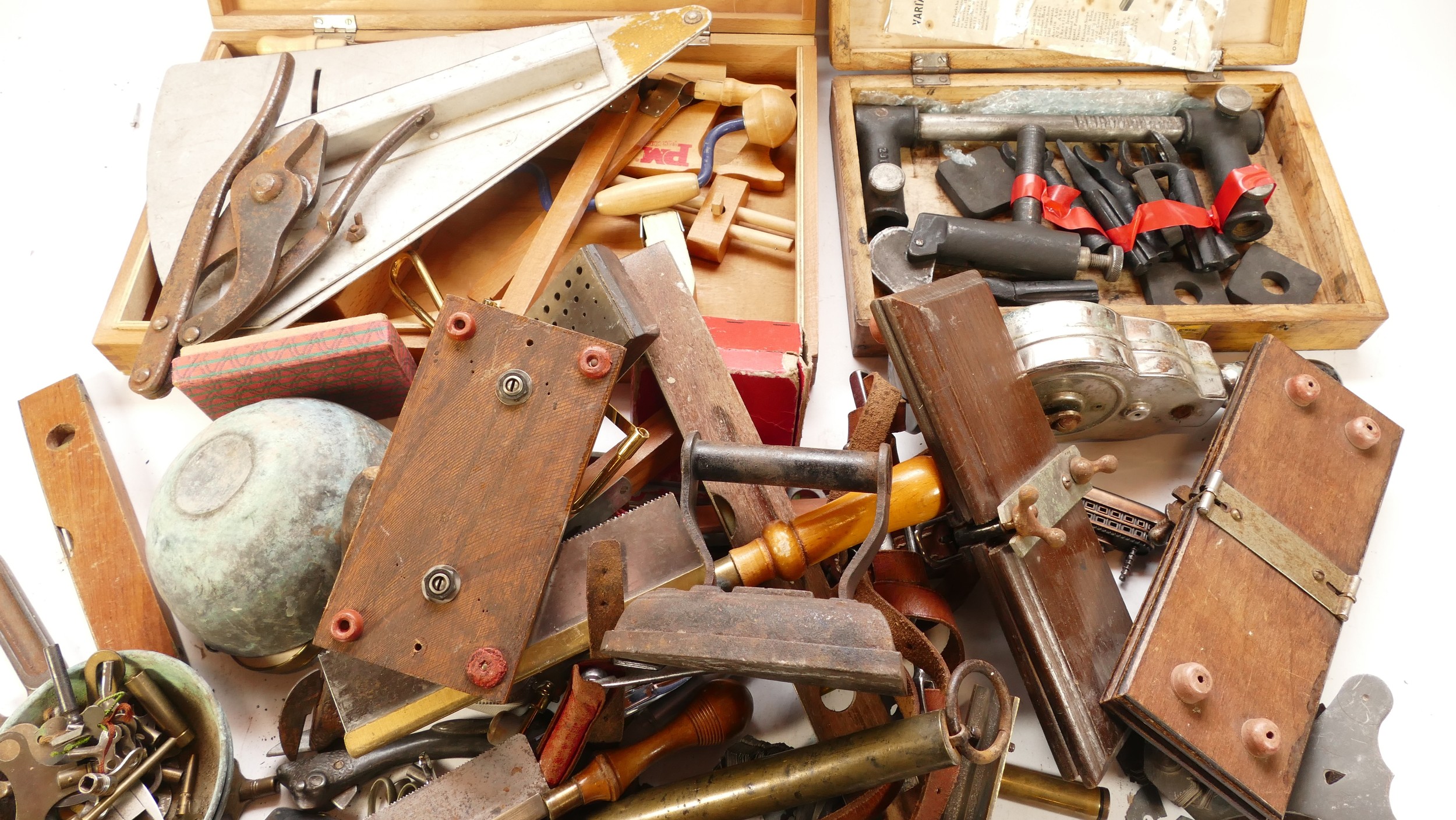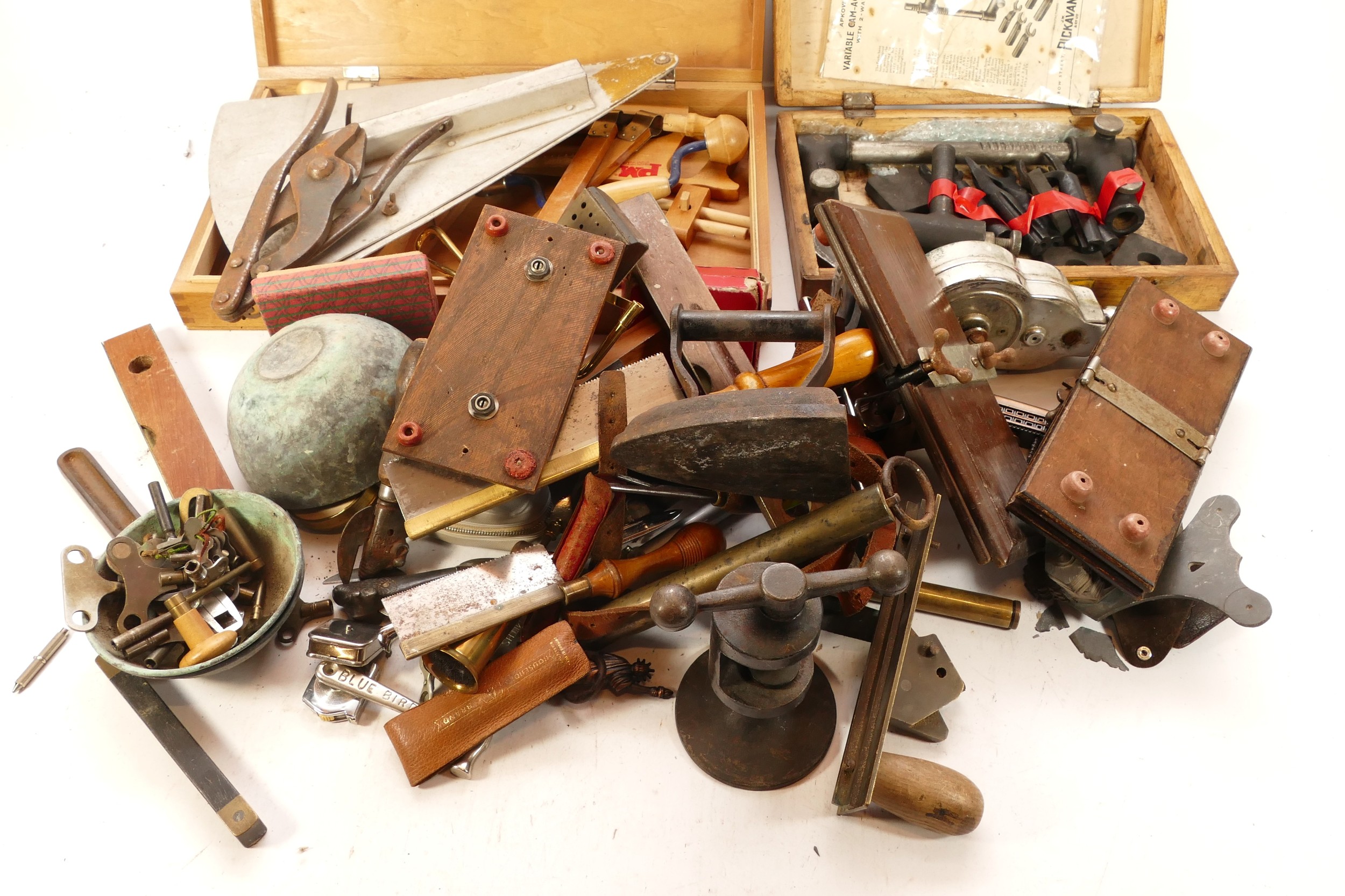 A collection of early to mid twentieth century hand tools to include tin openers, small bench vice, wood planes, spirit levels, iron and a Pickavant cam-action valve lifter.