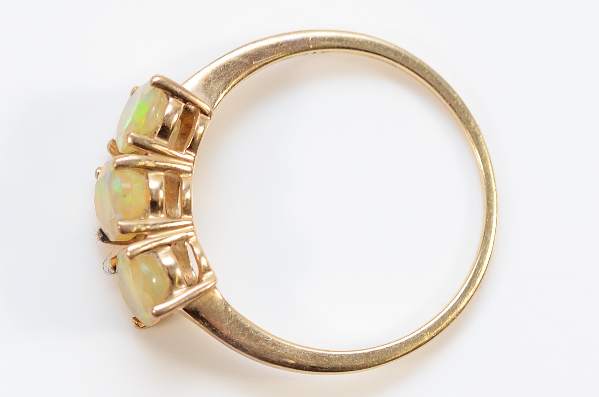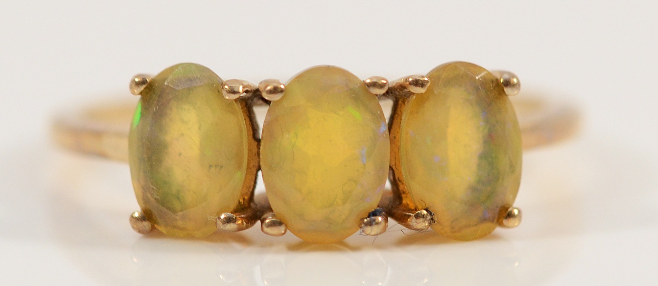 A 9ct gold fire opal three stone ring, S, 2.1g