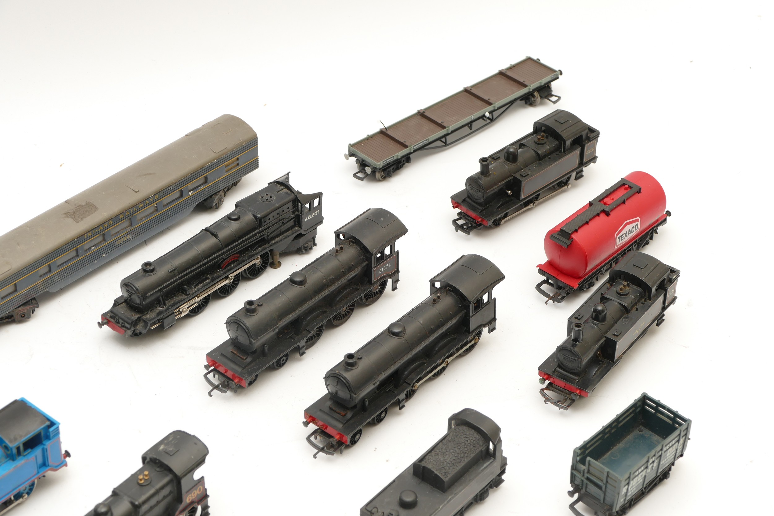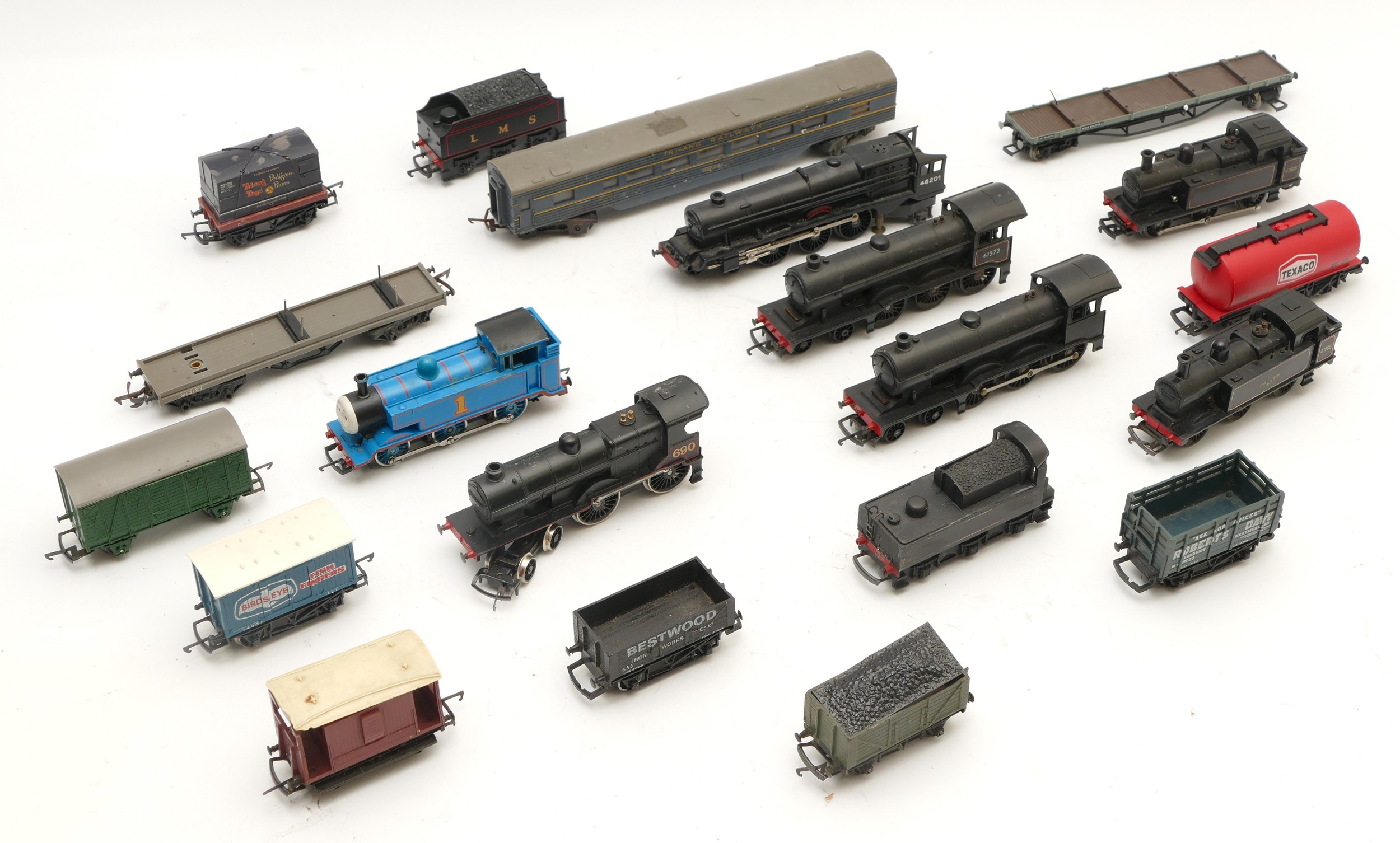 Hornby 00 gauge Railways; to include locomotives, goods wagons and carriages, all playworn.