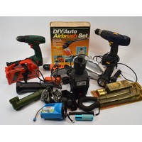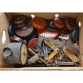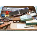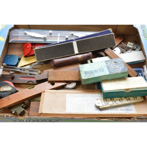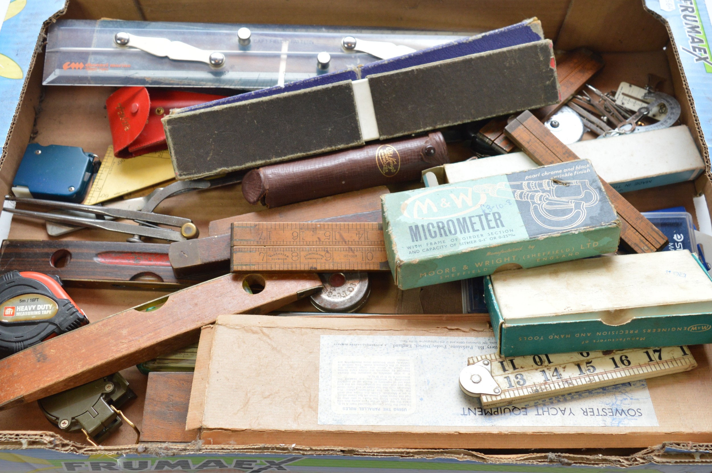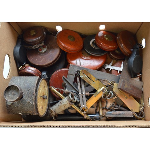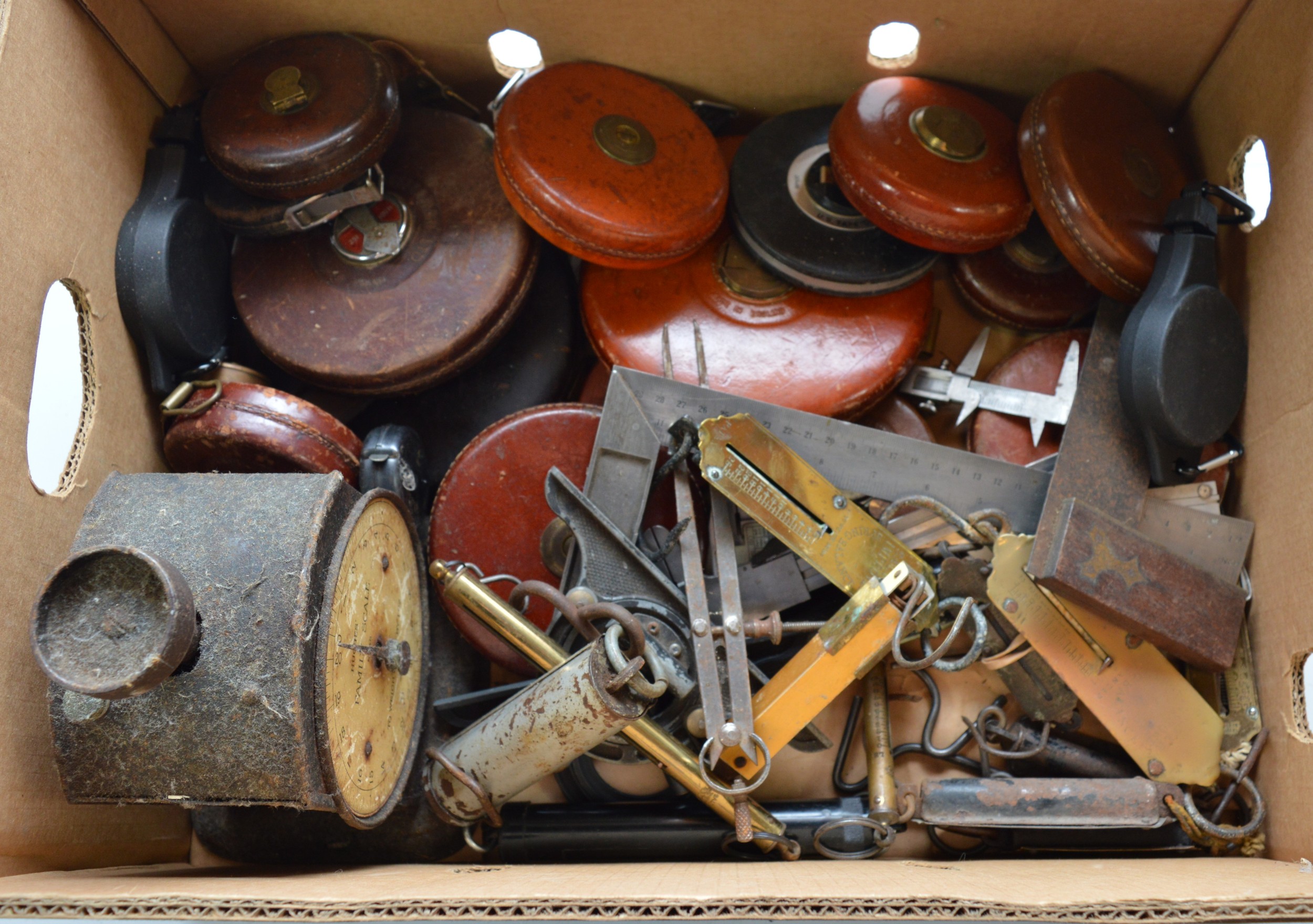 Two boxes of marking and measuring equipment, to include, tape measures, slide rules, and spring balances. (2)