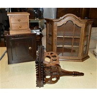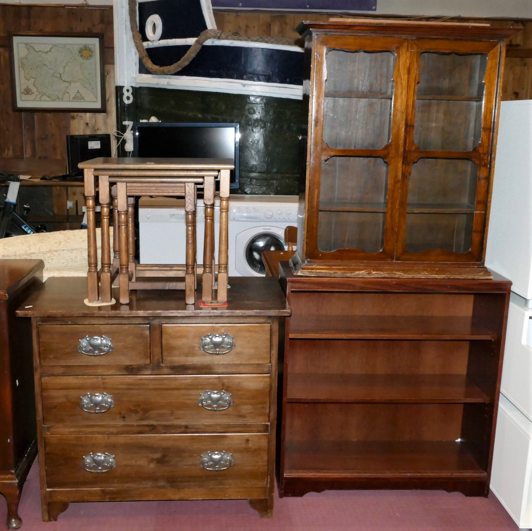 A mid 20th Century oak chest of drawers, together with an oak nest of three tables, a freestanding open bookshelf unit and a wall display cabinet.