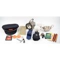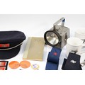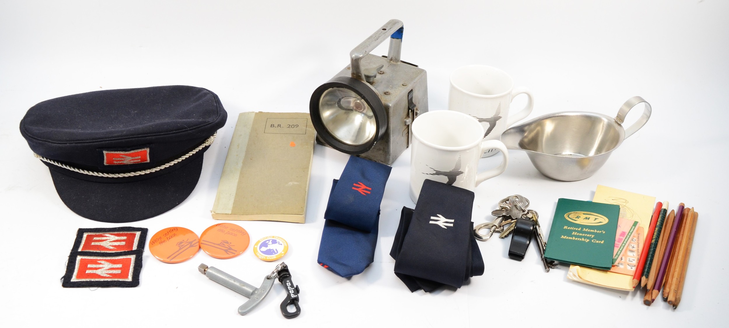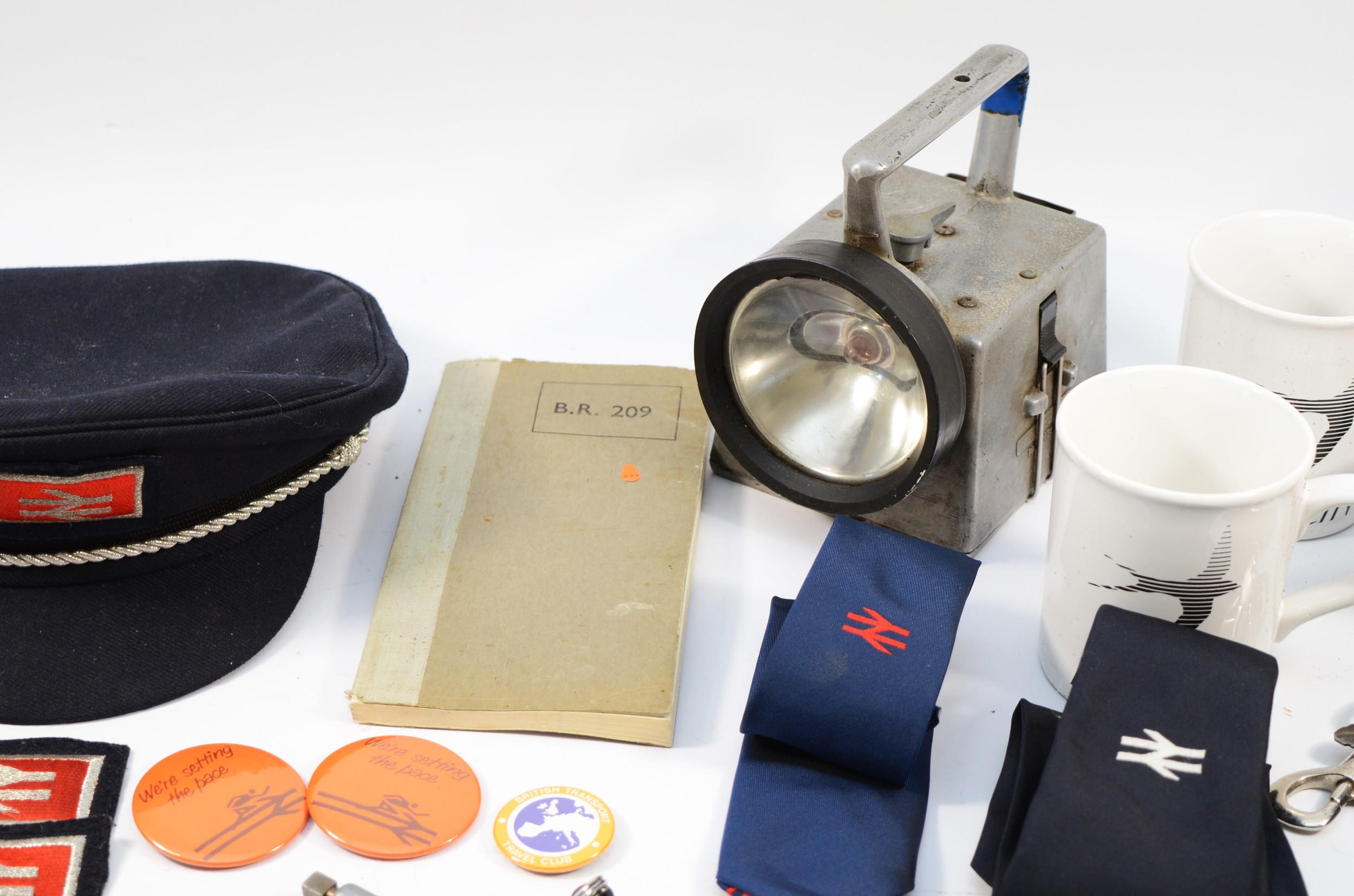An assortment of railway equipment, to include a British Rail peaked hat, a Bardic signaling lamp, two Intercity mugs, keys with whistle, and various patches/badges.