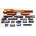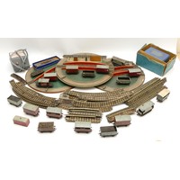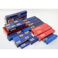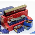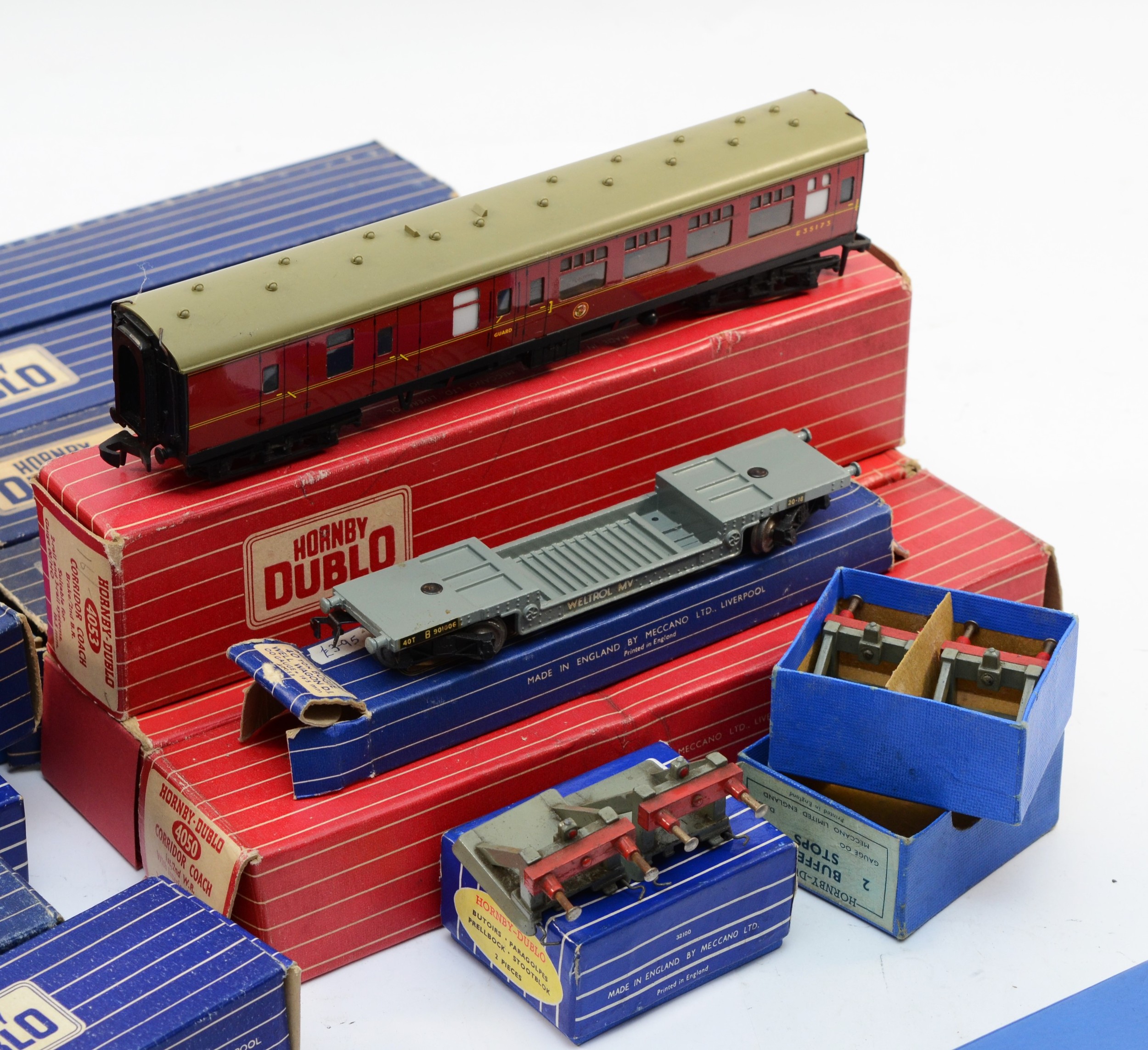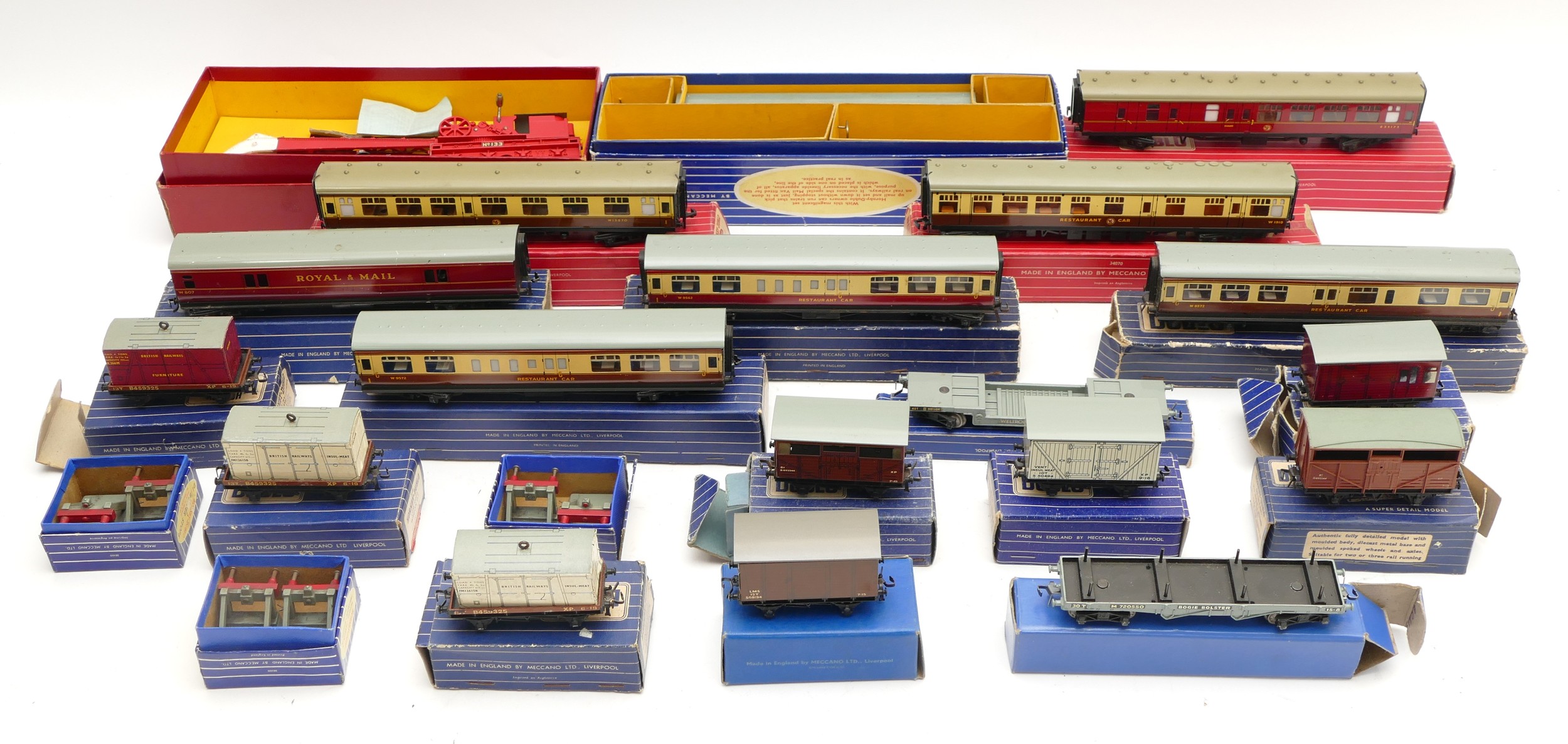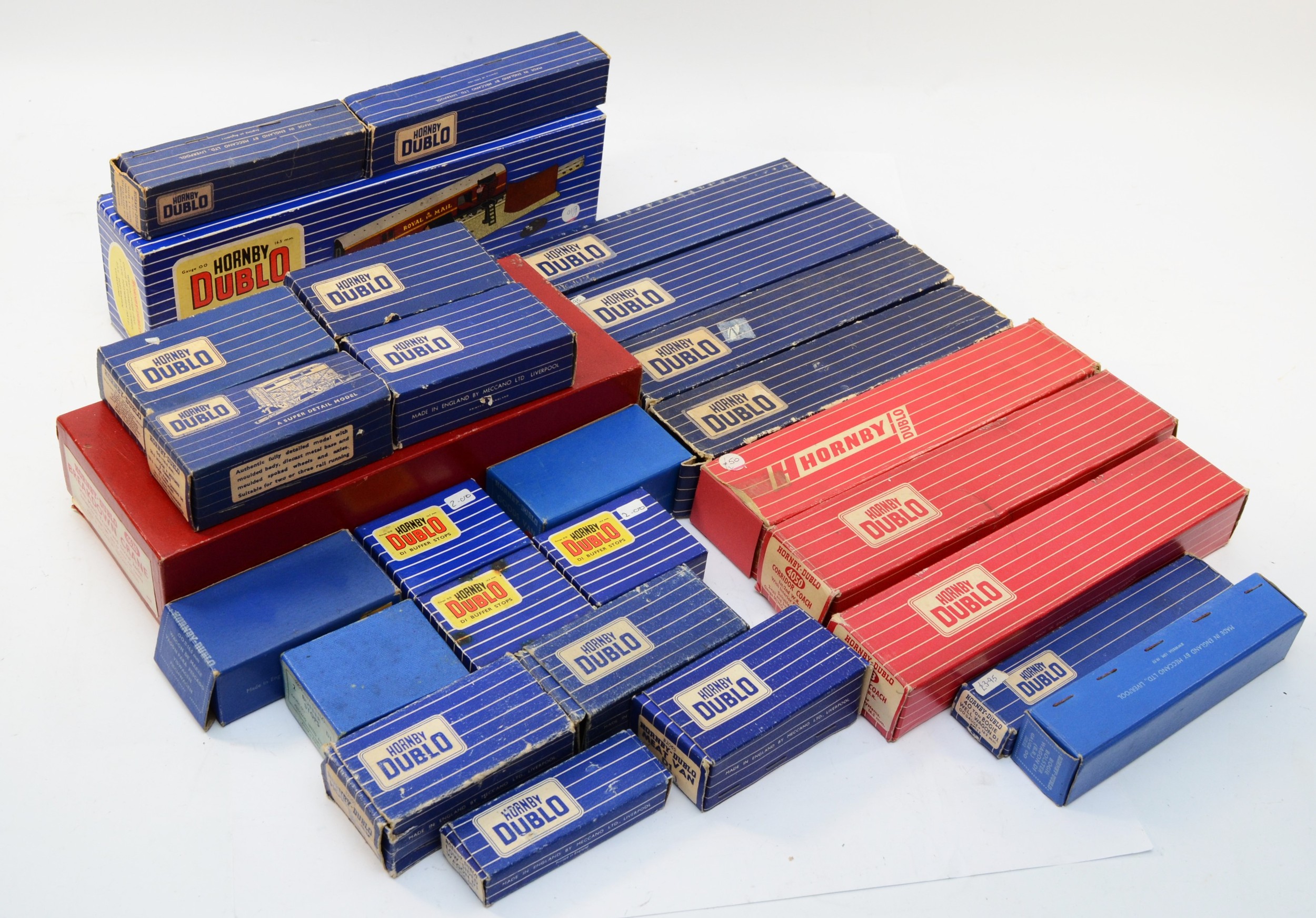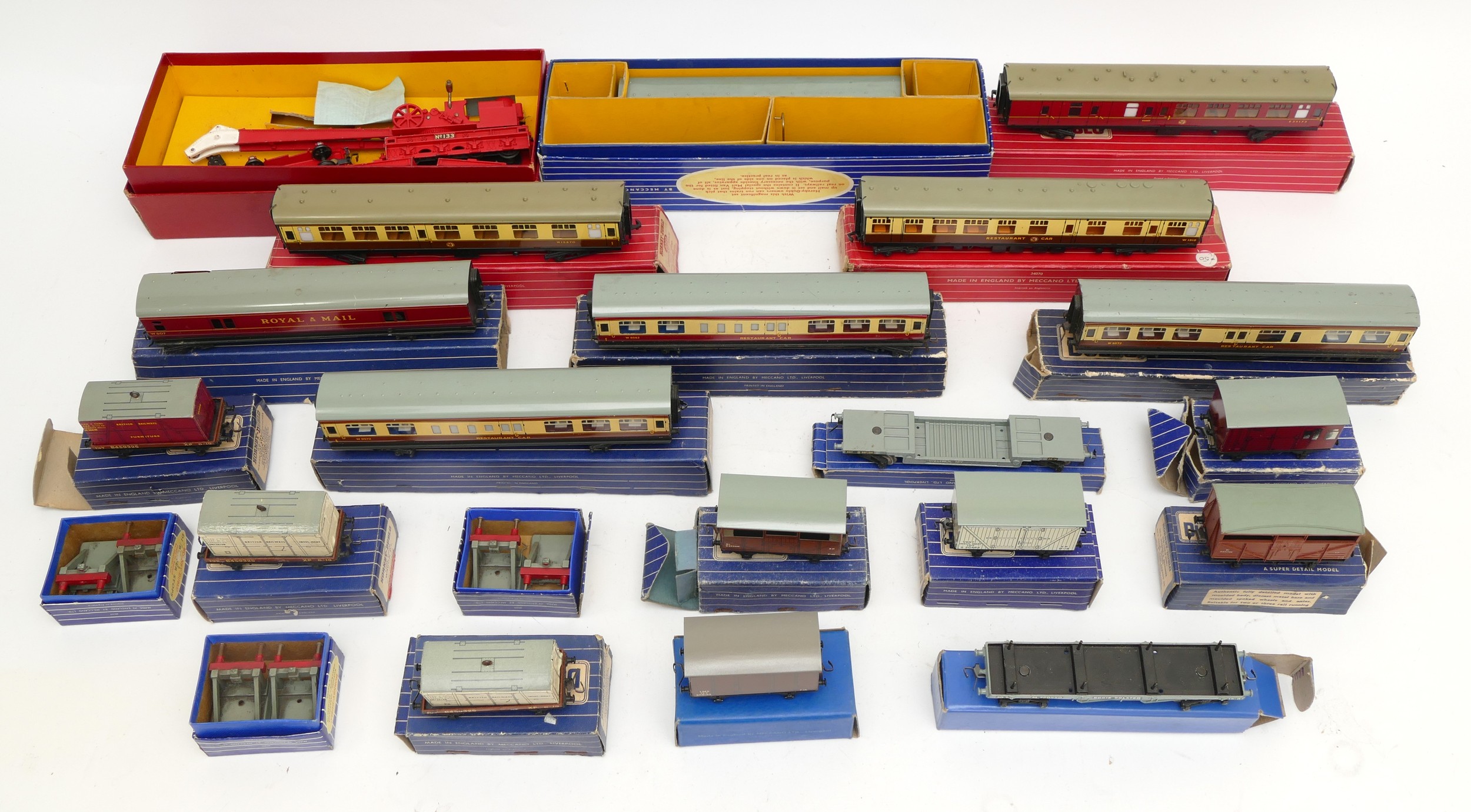 Hornby 00 Gauge Railways; Dublo boxed rolling stock, to include bogie bolster wagons, meat vans, horse box, fish van, cattle truck, together with buffer stops, restaurant car, corridor coach, a T.P.O mail van set, No.32099 and a breakdown crane, No.4620.