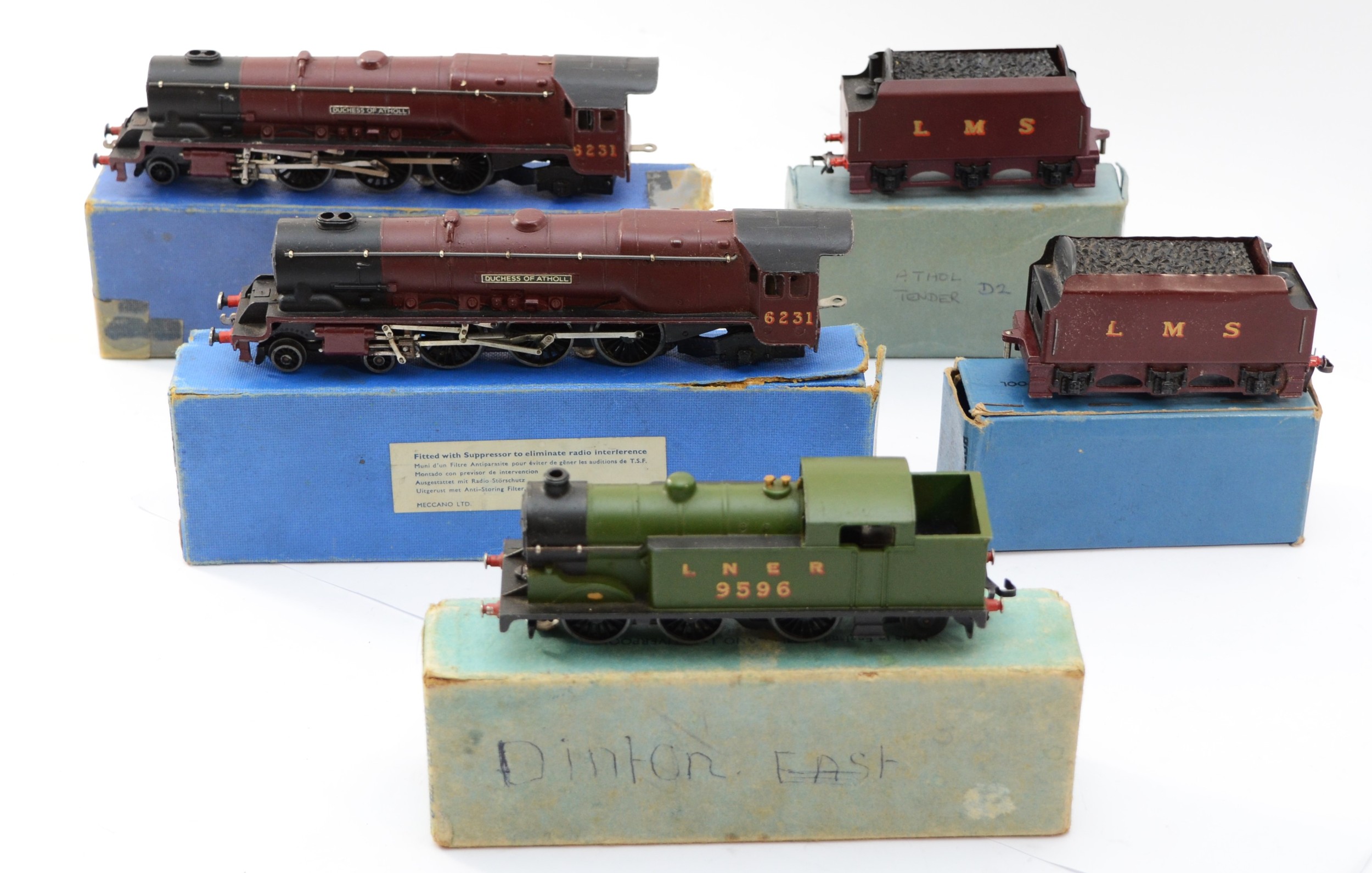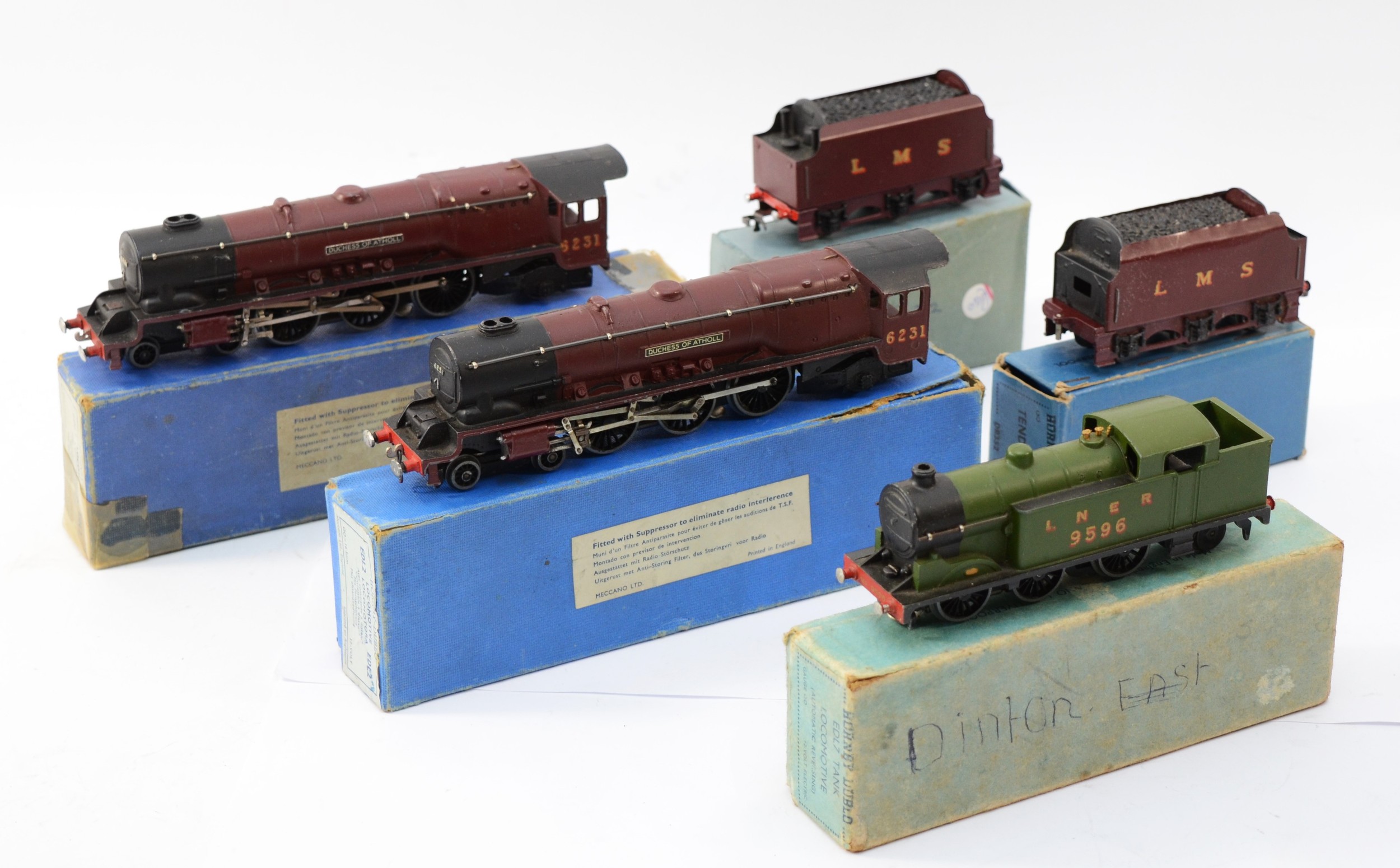 Hornby 00 Gauge Railways; Comprising EDL7 tank locomotive, class 9596, boxed, locomotive & tender 'Duchess Of Atholl' class 5231, boxed, EDL2 'Duchess Of Atholl' locomotive, boxed and a L.M.S tender, boxed.