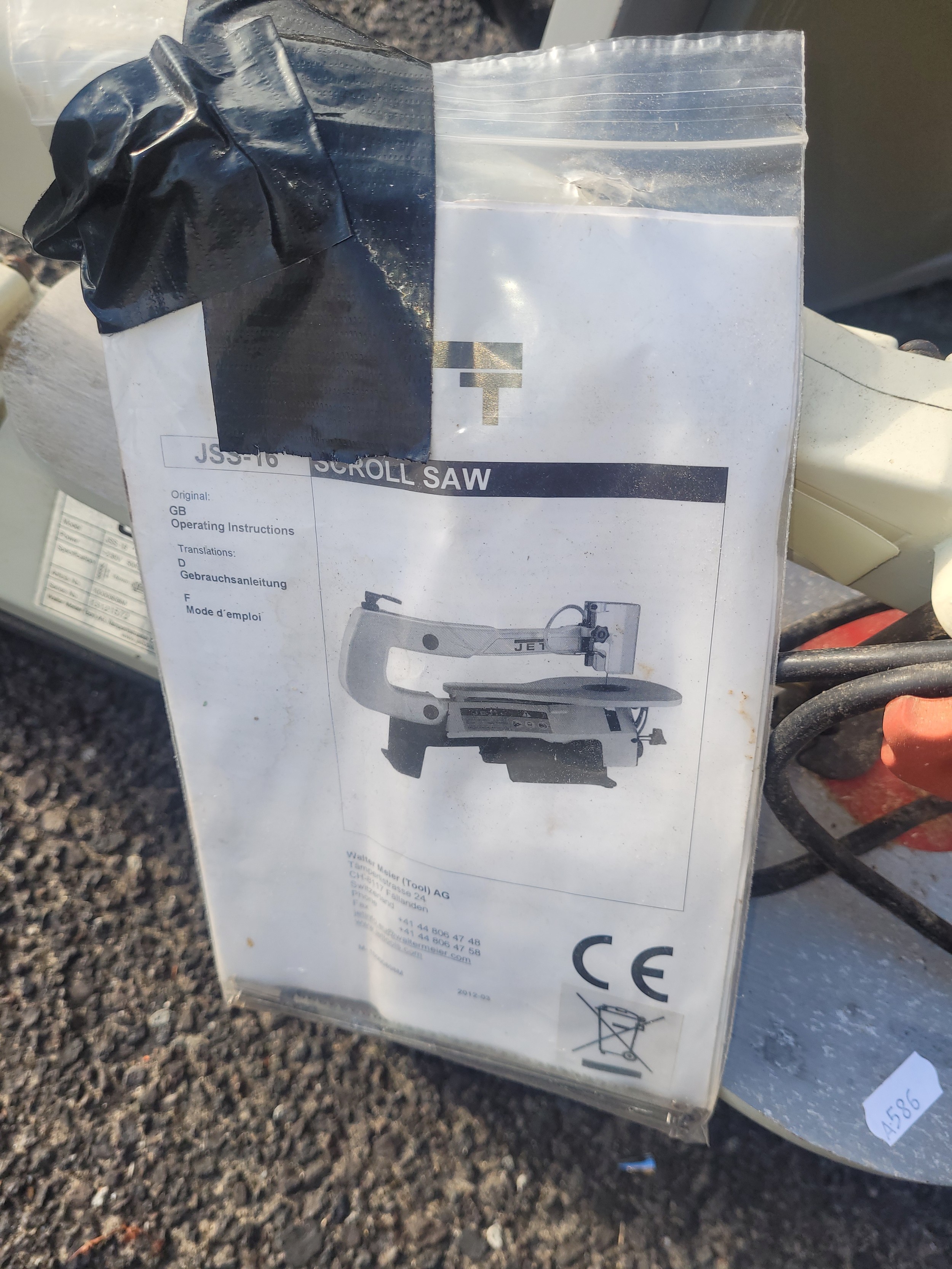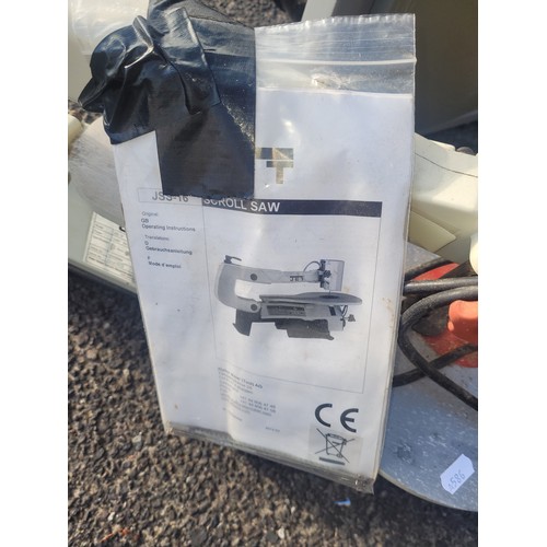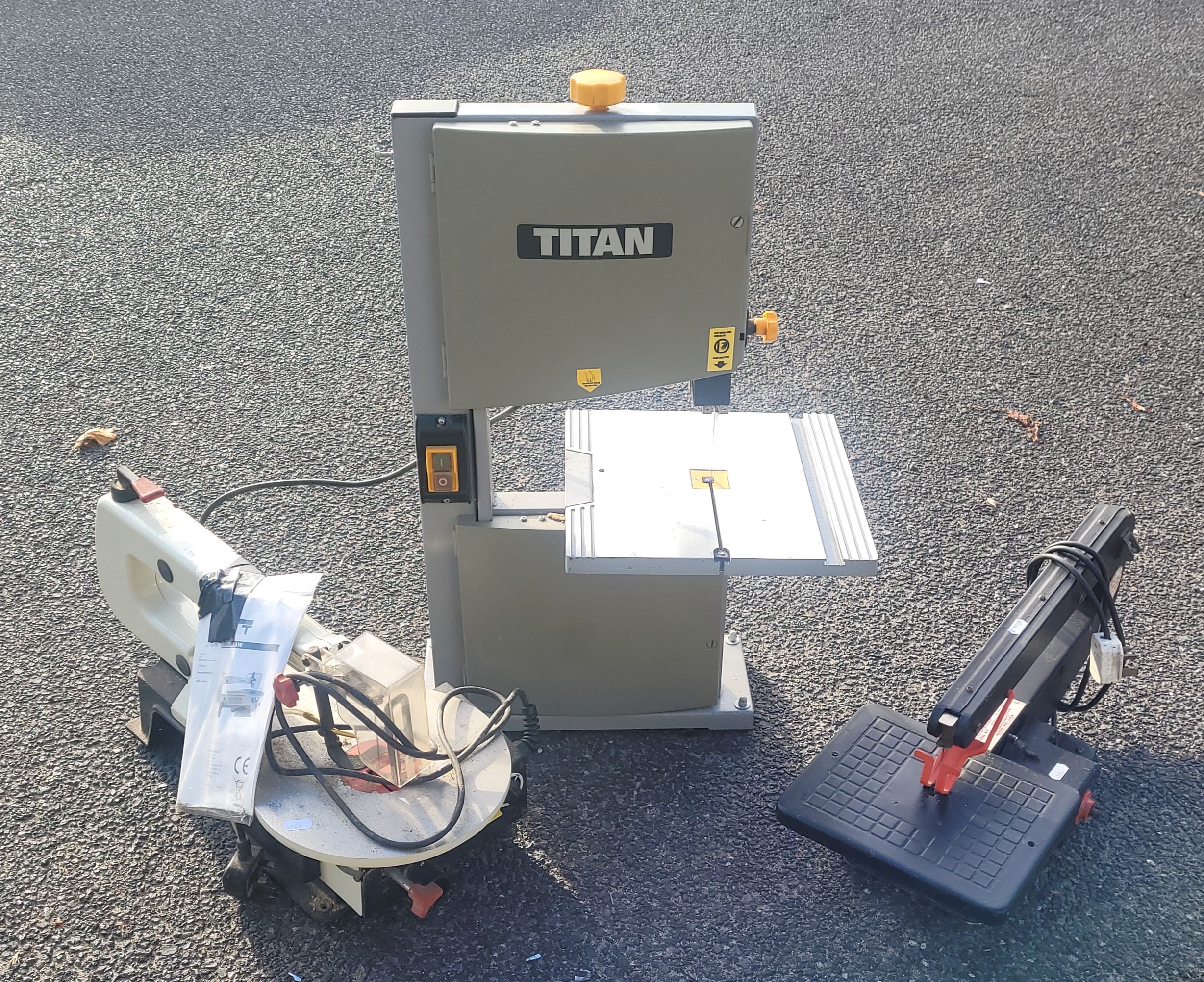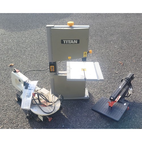 A Jet JSS16 230v 50Hz scroll saw, a Moto-shop model 576 serial No 510214 230v 50Hz Dremel saw also, a Titan TTB705BDS 240v 350w bandsaw.