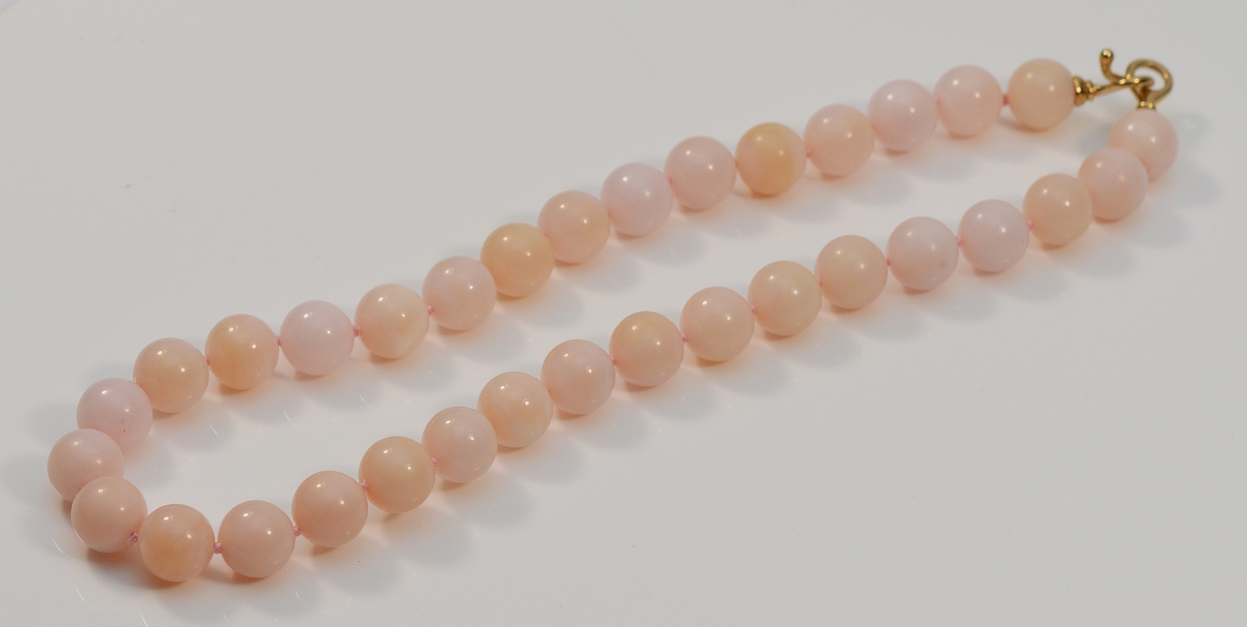 A 9ct gold clasped pink beaded necklace, 13mm beads, 44cm, 68g