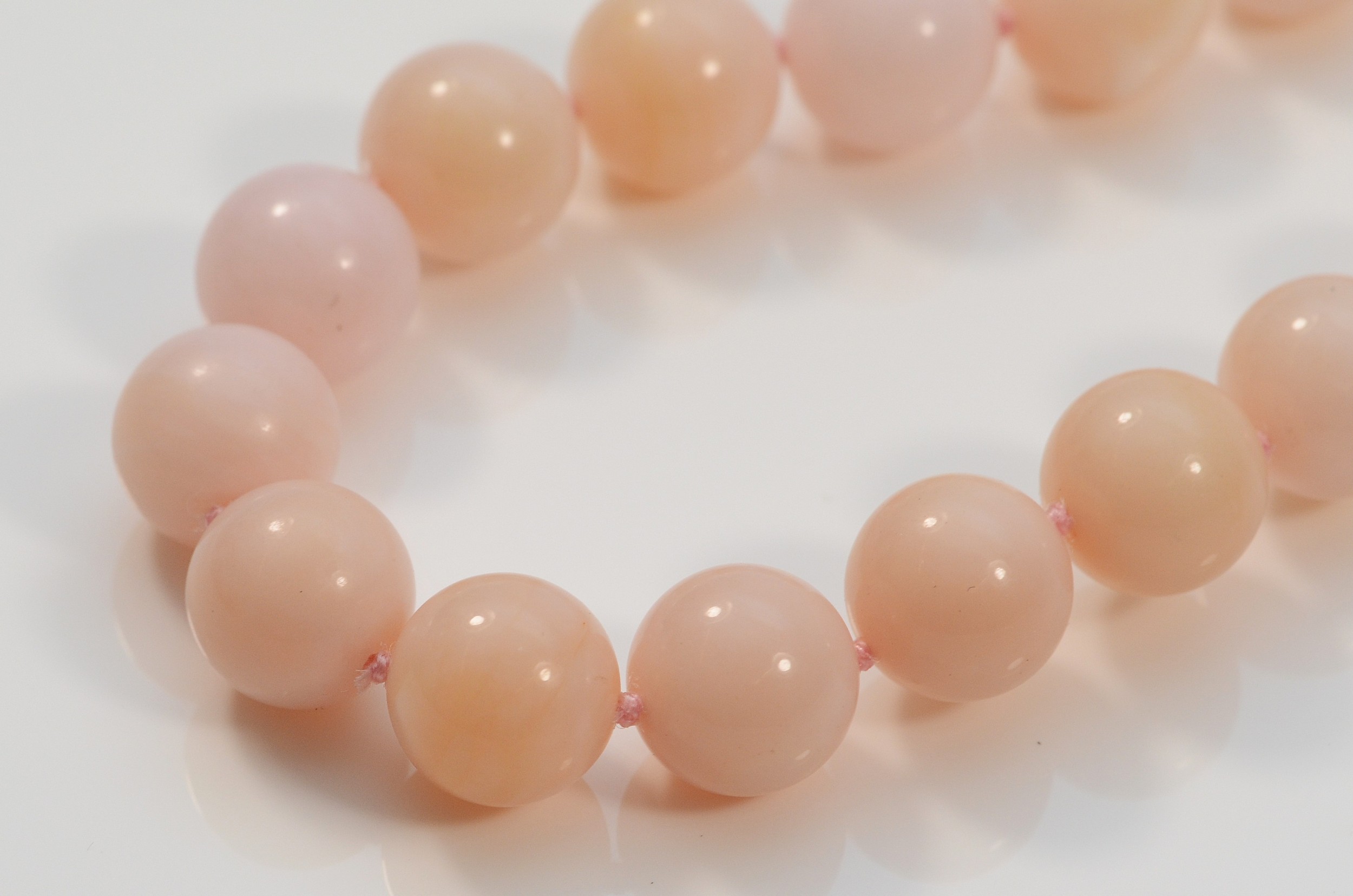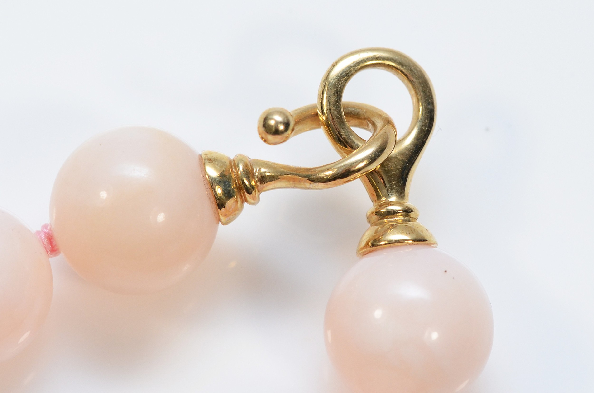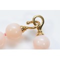A 9ct gold clasped pink beaded necklace, 13mm beads, 44cm, 6...