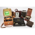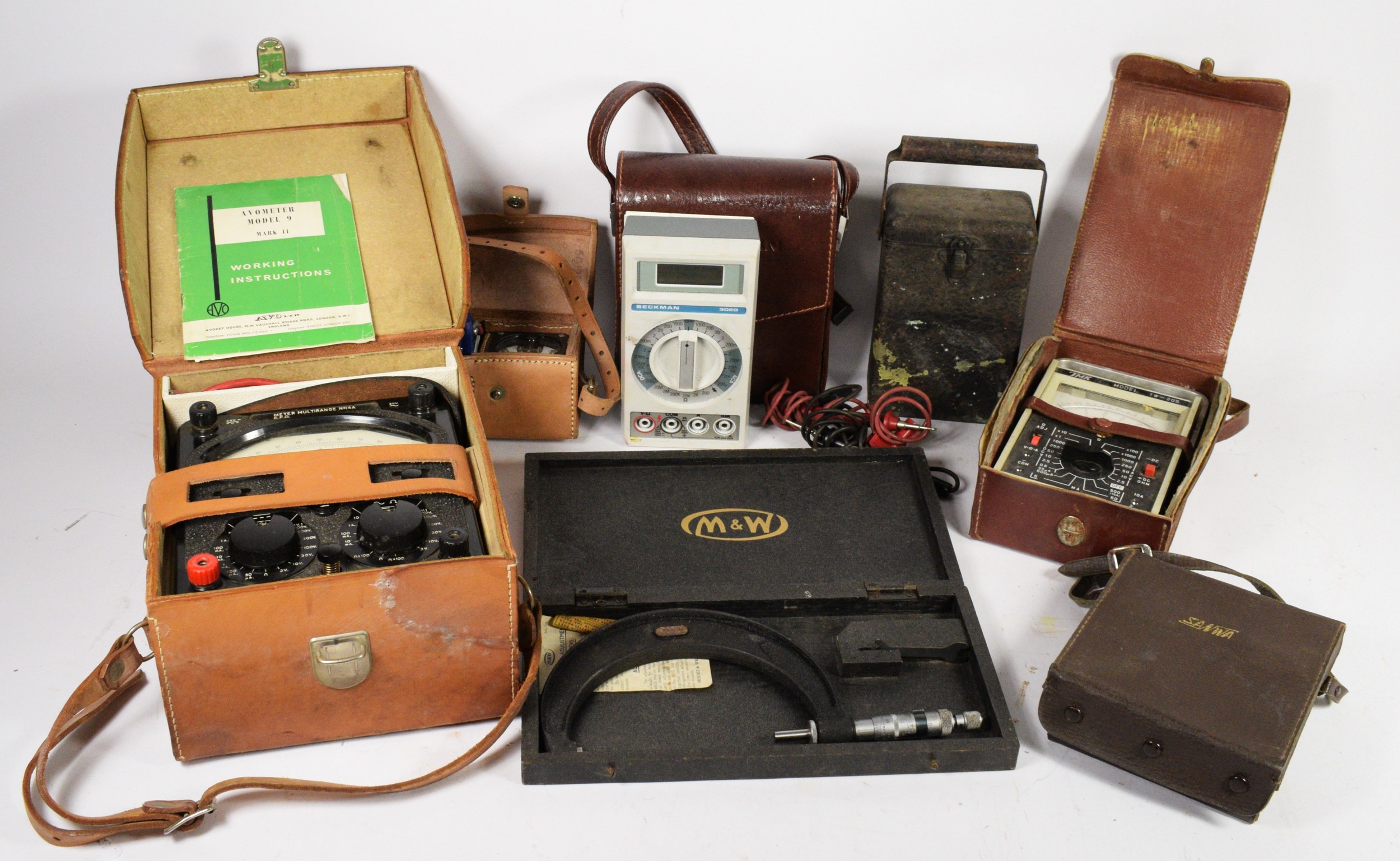 A collection of vintage technological testing equipment, to include a GPO Avometer, a Sanwa multimeter, a micrometer, an amp tester, a Beckman multimeter and a bakelite Megger volt meter.