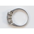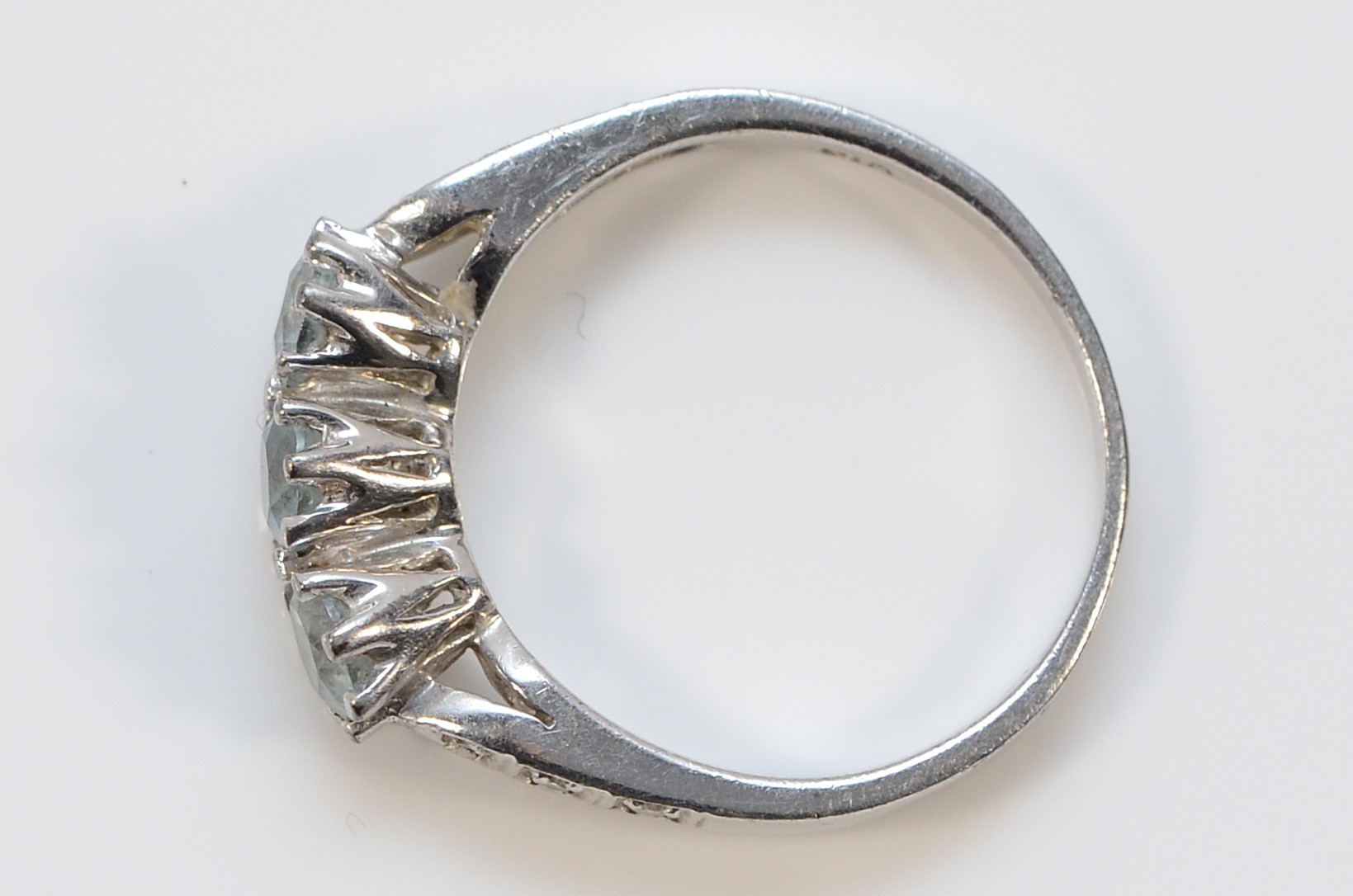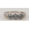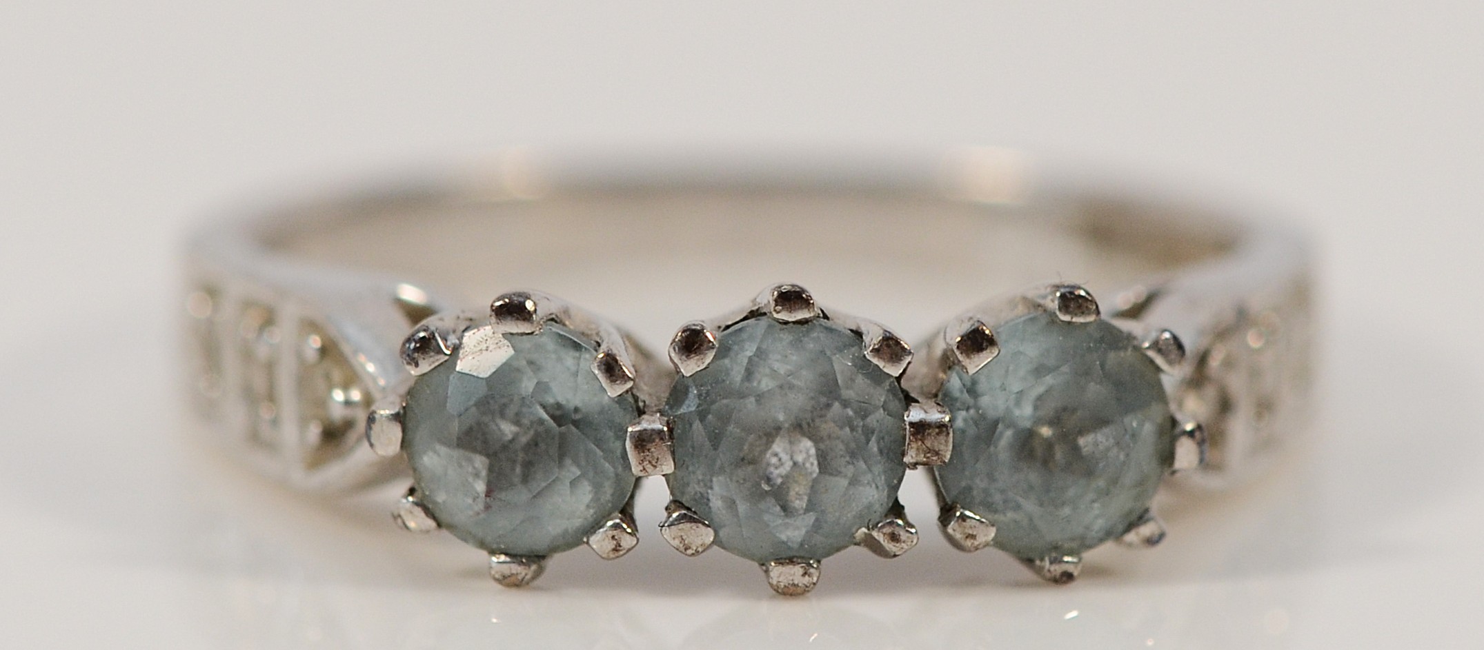 A 9ct white gold blue topaz three stone ring with diamond set shoulders, L, 2.9g