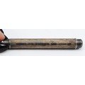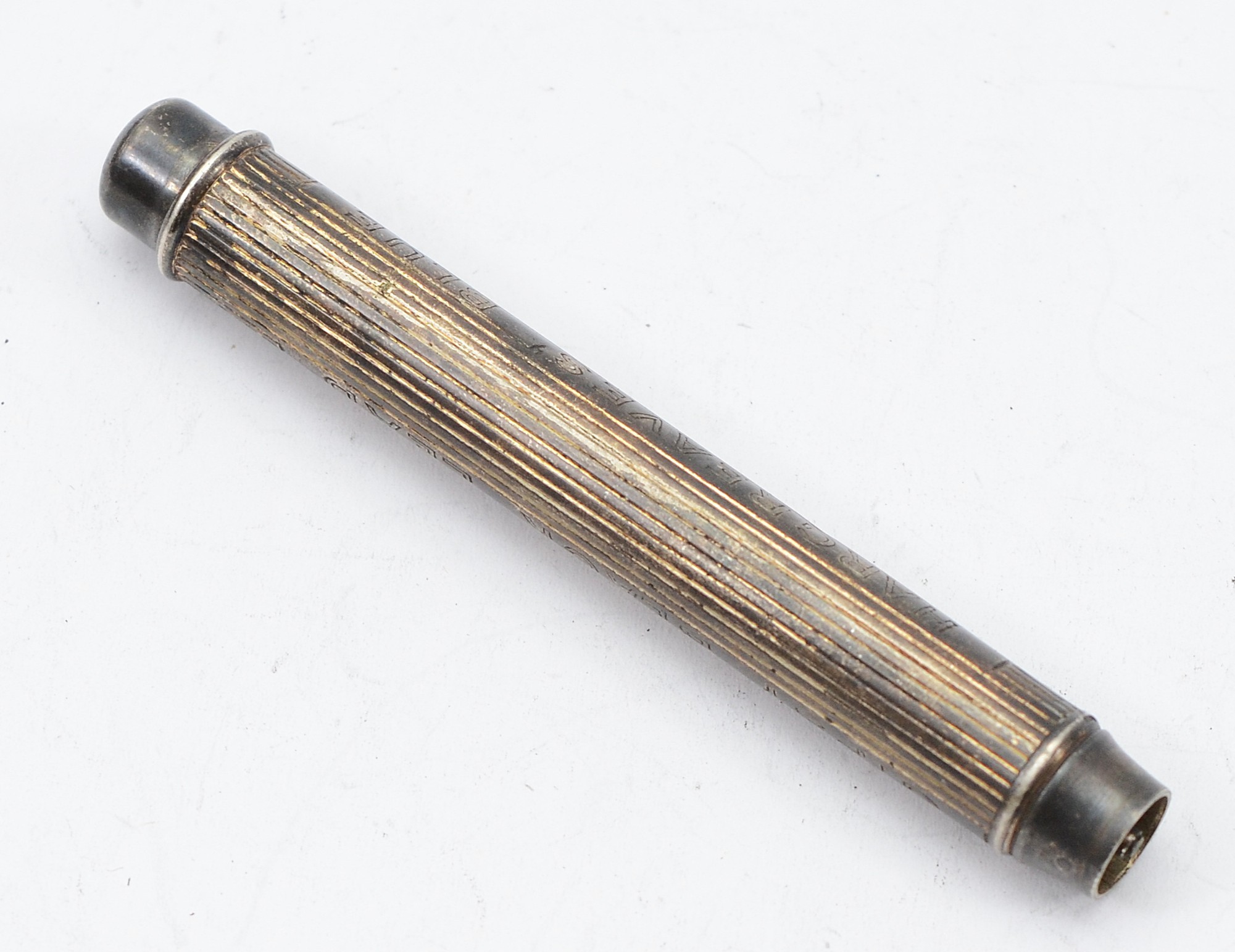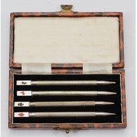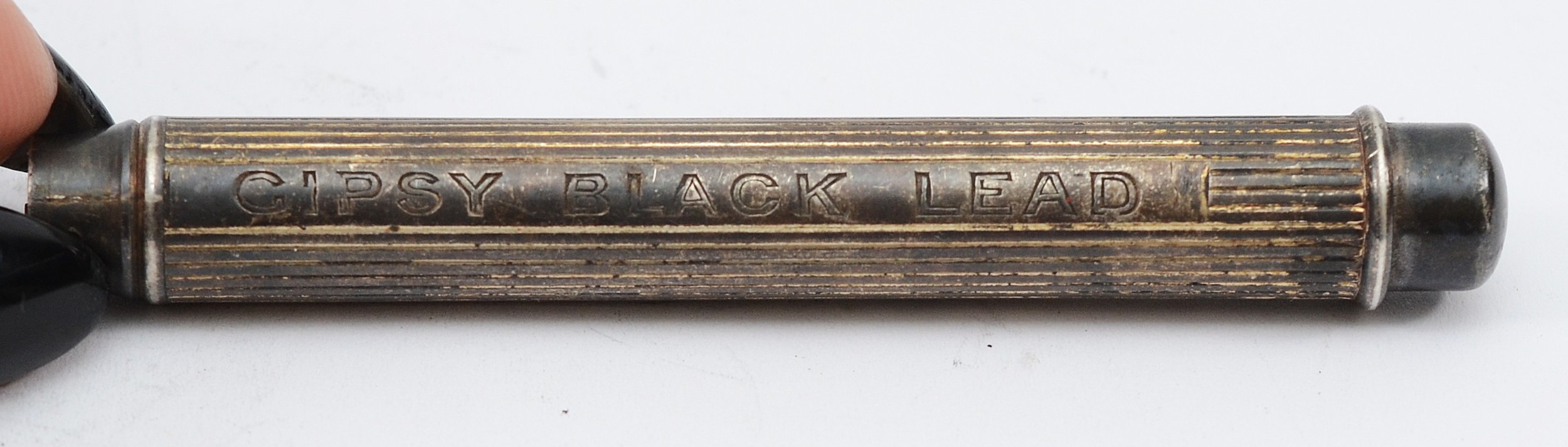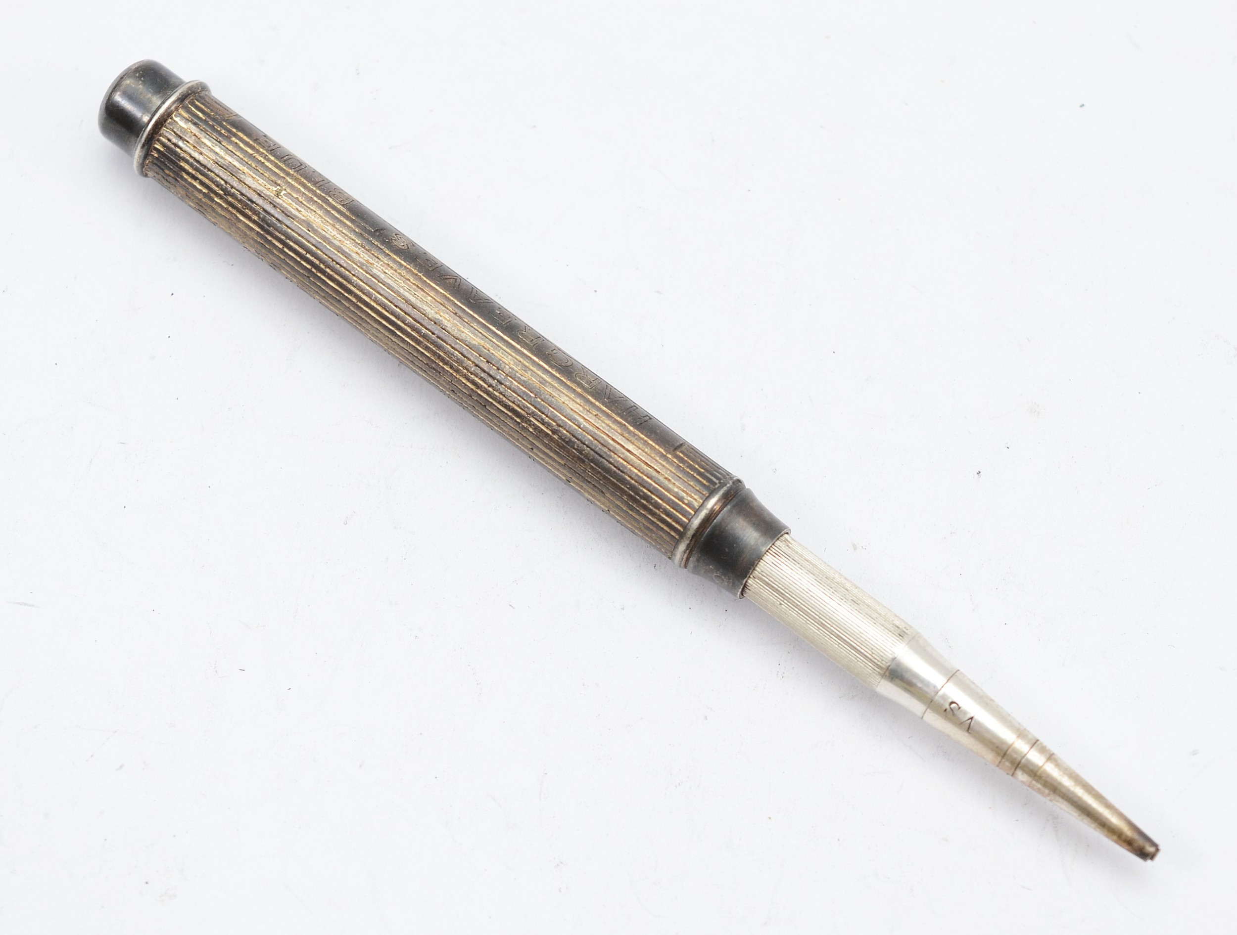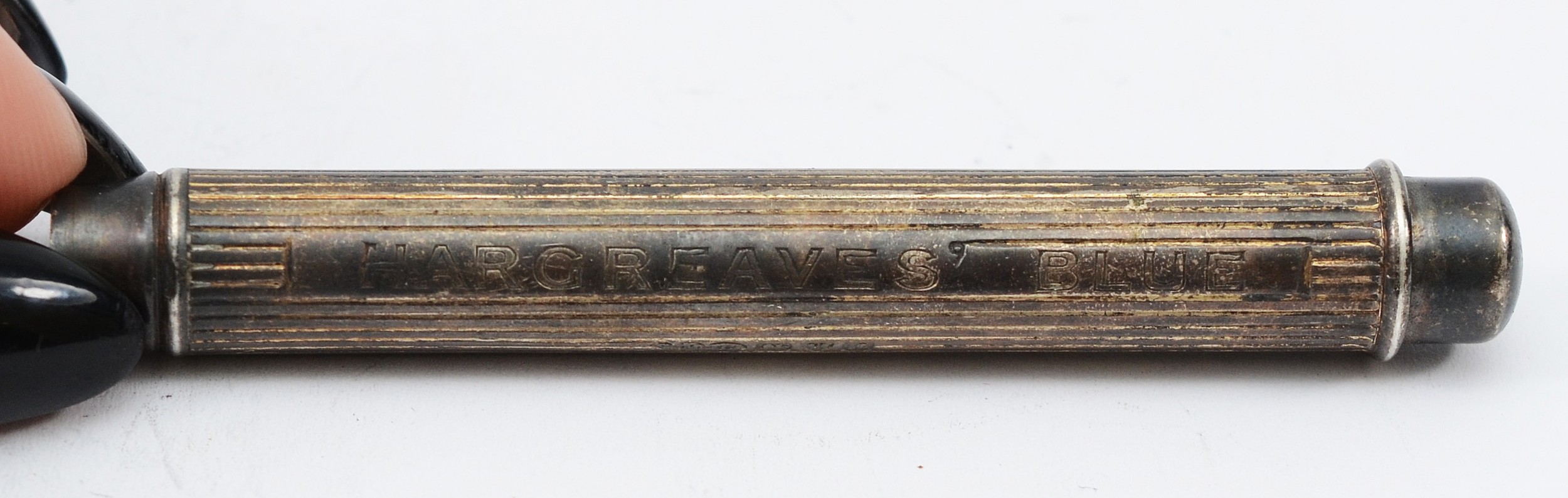 A silver push button action pencil, Chester 1901, engraved, 'Hargreaves Blue', 'Gipsy Black Lead', 8cm compact.