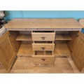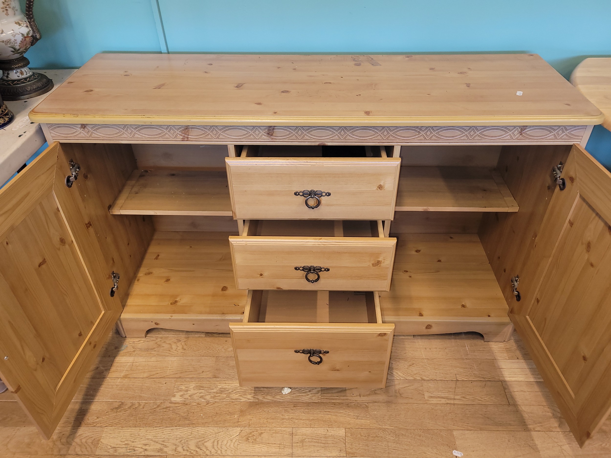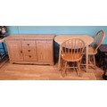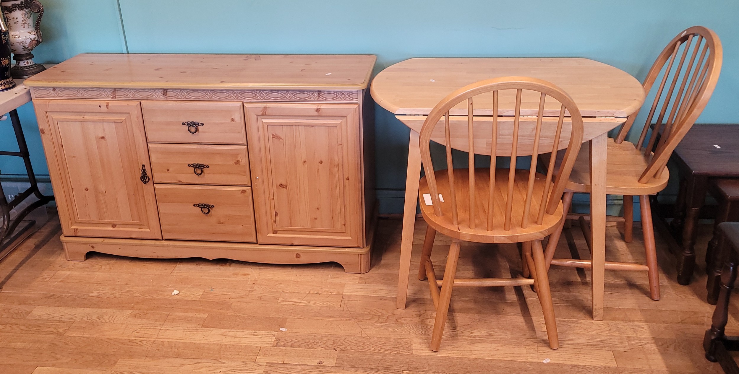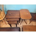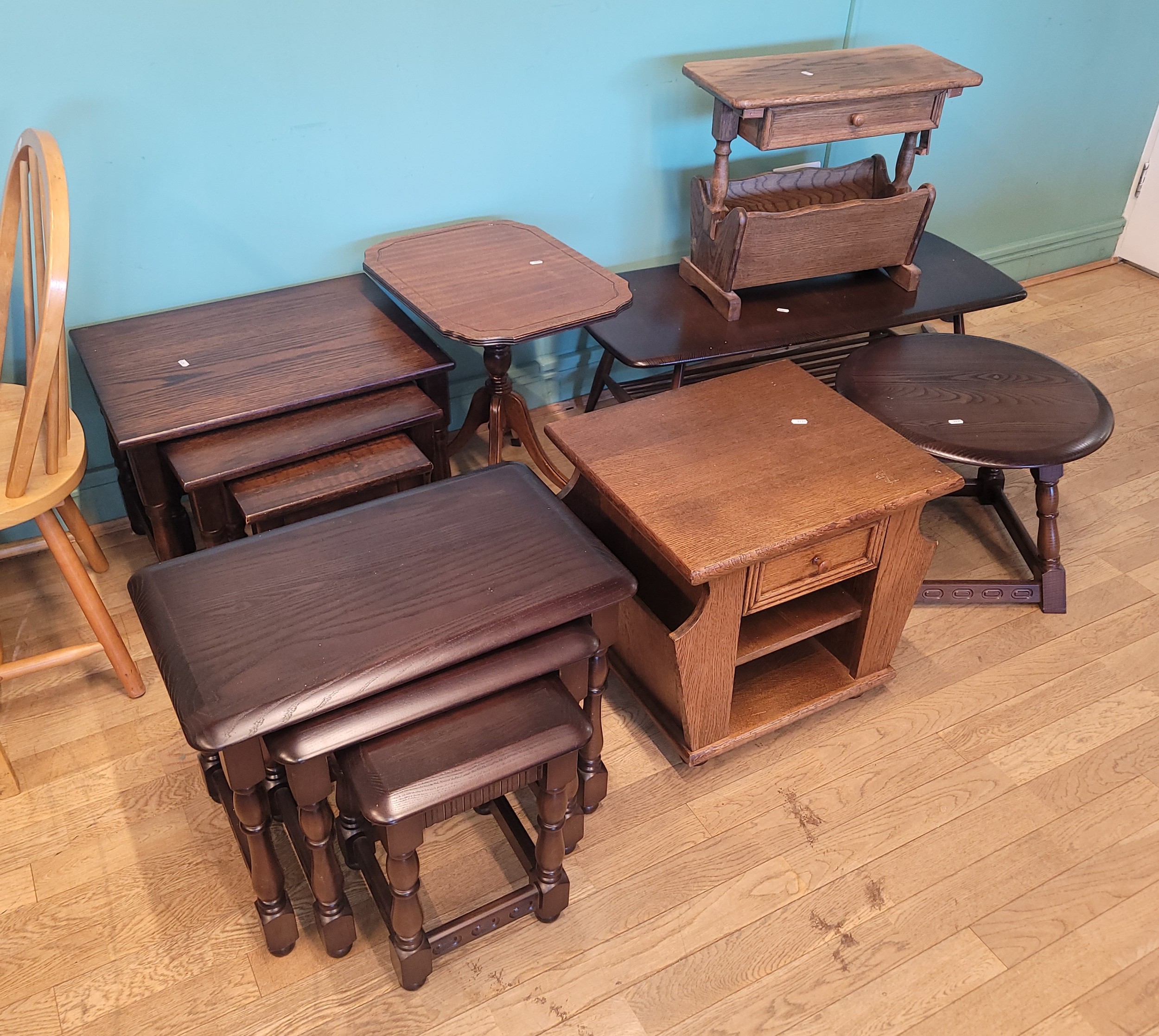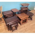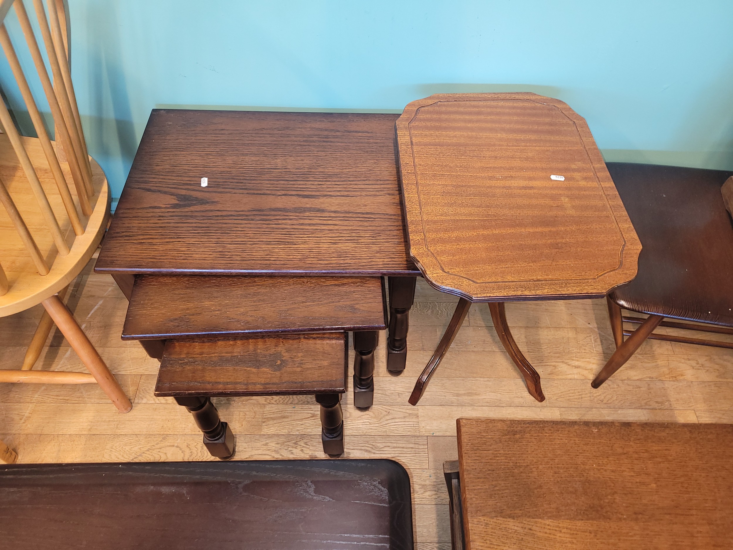 A group of furniture pieces, to include two nest of three tables, three coffee tables, two magazine racks, a pine effect sideboard, W124, D42, H76cm, a pine drop leaf dining table, 91x62cm, and two dining chairs,