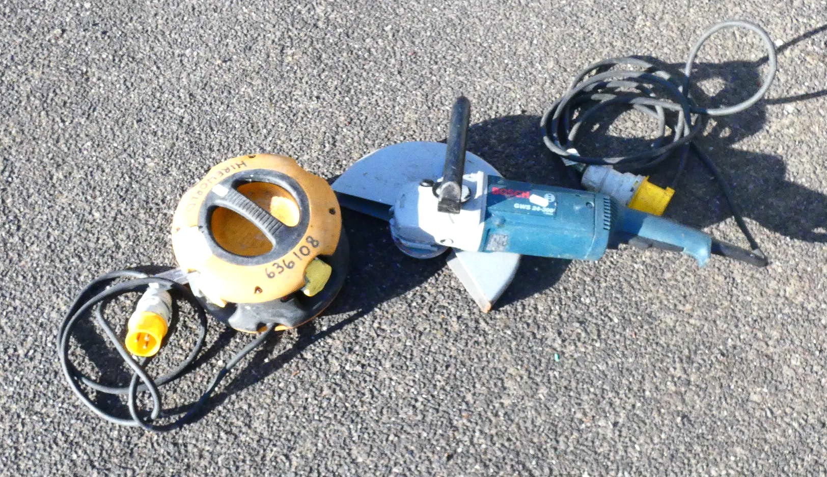 A Bosch GWS 24-300 110V 2200w angle grinder, together with a Defender Spider Ball 110v power unit.
